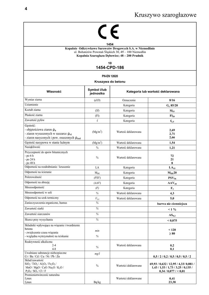 4 Kruszywo szarogłazowe 1454 Kopalnie Odkrywkowe Surowców Drogowych S.A. w Niemodlinie ul. Bohaterów Powstań Śląskich 30, 49 – 100 Niemodlin Kopalnia Szarogłazu Dębowiec; 48 – 200 Prudnik 10 1454-CPD-186 PN-EN 12620 Kruszywa do betonu Własność Wymiar ziarna Symbol i/lub jednostka (d/D) Uziarnienie Kategoria lub wartość deklarowana Oznaczenie 8/16 Kategoria Gc 85/20 Kategoria Sl15 Kształt ziarna (Sl) Płaskość ziarna (Fl) Kategoria Fl20 f Kategoria f1,5 (Mg/m3) Wartość deklarowana (Mg/m3) Wartość deklarowana 1,54 % Wartość deklarowana 1,21 % Wartość deklarowana Zawartość pyłów Gęstość: - objętościowa ziaren ρa - ziaren wysuszonych w suszarce ρrd - ziaren nasyconych i pow. osuszonych ρssd Gęstość nasypowa w stanie luźnym Nasiąkliwość 2,69 2,71 2,66 Przyczepność do spoiw bitumicznych - po 6 h - po 24 h - po 48 h Odporność na rozdrabnianie / kruszenie LA Kategoria 72 21 8 LA15 Odporność na ścieranie MDE Kategoria MDE20 Polerowalność (PSV) Kategoria PSV56 Odporność na abrazję AAV10 (AAV) Kategoria Mrozoodporność (F) Kategoria F1 Mrozoodporność w soli % Wartość deklarowana 4,3 Odporność na szok termiczny VLA % Wartość deklarowana 5,0 Zanieczyszczenia organiczne, humus Zawartość siarki % <1% Zawartość siarczanów % AS0,2 Skurcz przy wysychaniu % < 0,075 min < 120 ≥ 80 Składniki wpływające na wiązanie i twardnienie betonu - zwiększenie czasu wiązania - względna wytrzymałość na ściskanie Reaktywność alkaliczna 2-4 4-8 Uwalniane substancje niebezpieczne Cr / Ba / Cd / Cu / Ni / Pb / Zn Skład/zawartość SiO2 / TiO2 / Al2O3 / Fe2O3 / MnO / MgO / CaO /Na2O / K2O / P2O5 / SO3 / Cl / F Promieniotwórczość naturalna f1max f2max barwa nie ciemniejsza % % Wartość deklarowana mg/l % 0,5 / 2 / 0,2 / 0,5 / 0,5 / 0,5 / 2 Wartości deklarowane Wartości deklarowane Bq/kg 0,2 0,1 69,93 / 0,632 / 12,95 / 4,33/ 0,081 / 1,43 / 1,53 / 1,73 / 3,25 / 0,135 / 0,34 / 0,077 / < 0,01 0,41 23,38