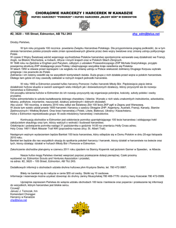 CHORĄGWIE HARCERZY I HARCEREK W KANADZIE HUFIEC HARCERZY ’’POMORZE’’ I HUFIEC HARCEREK „MŁODY BÓR” W EDMONTON ________________________________________________________________________________________________ #2, 3620 – 105 Street, Edmonton, AB T6J 2K5 [email protected] Drodzy Państwo, W tym roku przypada 100 rocznica powstania Związku Harcerstwa Polskiego. Dla przypomnienia pragnę podkreślić, że w tym okresie harcerstwo polskie przeszło wiele zmian spowodowanych glównie przez dwie wojny światowe oraz zmianę ustroju politycznego Polski. W czasie II Wojny Światowej wśród wojennego wychodźstwa Polaków harcerstwo spontanicznie wznawiało swą działalność we Francji, Anglii, na Bliskim Wschodzie, w Indiach, Afryce i innych krajach oraz w Polskich Siłach Zbrojnych. W 1946 roku na Zjeździe w Enghien pod Paryżem, odbytym z udziałem Przewodniczącego ZHP Michała Grażyńskiego, przyjęto powojenną strukturę ZHP działającego poza Polską i obejmującego wszystkie kraje osiedlenia się Polaków. W latach 1950 w obawie przed represjami i ze wzgledu na zmianę ustroju w Polsce wiekszość źołmierzy Drugiego Korpusu wybrało emigracje i nie powrociło do Polski. Żołmierze i ich rodziny osiedlili się na wszystkich kontynetach świata. Duża grupa z nich działała przed wojna w polskim harcerstwie. Dlatego tam gdzie ich losy zawiodły zakładali w rożnych krajach jednostki harcerskie. W roku 1955 w Edmonton powstał hufiec harcerzy Pomorze i hufiec harcerek Młody Bór. Piędziesięcio pięcio letnia działalność hufcow skupila w swoich szeregach wielu młodych jak i doświadczonych działaczy, którzy przyczynili sie do rozwoju harcerstwa w Edmonton. Od początku istnienia hufców w Edmonton do ich rozwoju przyczyniły się organizacje polonijne, kościoły, szkoły polskie i osoby prywatne. Hufce edmontońskie to szkoła kształtowania dobrego charakteru i liderów. Wyrosło z nich wielu znakomitych instruktorów, adwokatów, lekarzy, politykow, inżynierów, nauczycieli, działczy polonijnych i dobrych obywateli. Aby uczcić 100 rocznicę, w sierpniu 2010 roku odbyl sie Światowy Zlot 100 lecia ZKP pgK w Zegrzu pod Warszawą. W zlocie tym wzielo udział prawie 1600 harcerek i harcerzy z sześciu Okręgów ZHP: Argentyny, Australii, Francji, Kanady, Stanów Zjednoczonych i Wielkiej Brytanii. Oraz braci harcerskiej z Polski, Litwie, Białorusi, Ukrainy i Kazachstanu. Hufce z Edmonton reprezetowala grupa 18 osób młodzierzy harcerskiej i instruktorów. Kontnuacją obchodów w Edmonton jest odsłoniecie pomnika upamiętniającego 100 lecie harcerstwa i oddającego hołd założycielom skautingu oraz tym, którzy walczyli o wolność i budowali harcerstwo. Odsłonięcie i poświęcenie pomnika nastąpi 31 pażdziernika o godzinie 14:00 na cmentarzu Holly Cross adres; Holy Cross 14611 Mark Messier Trail NW (poprzednia nazwa ulicy; St. Albert Trail). Następnym ważnym wydarzeniem będzie Bankiet 100 lecia harcerstwa, który odbędzie się w Domu Polskim w dniu 20-ego listopada 2010 roku. Bankiet ten będzie dla nas wszystkich okazją do spotkania pokoleń harcerzy i harcerek, ktorzy dzialali w harcerstwie na świecie oraz tych, ktorzy dzialają i dzialali w hufcach Młody Bór i Pomorze w Edmonton. Zakończenie obchodów planujemy w czerwcu 2011 roku zjazdem na Stanicy Kopernik nad jeziorem Garner w Speeden, w Albecie. Nasze hufce mogą Państwo również wesprzeć poprzez przekazanie dotacji pieniężnej. Czeki prosimy wystawiać na: Edmonton Scouts and Ventures Association i przesłać, na adres: #2, 3620 – 105 Street, Edmonton, AB T6J 2K5. Dodatkowych informcji o obchodach udziela druhna hufcowa phm Krystyna Sierko, tel. 780 472-0667. Bilety na bankiet są do nabycia w cenie $55 od osoby. Stoliki są 10 osobowe. Informacje i rezerwacje można uzyskać dzwoniąc do druhny Janiny Muszyńskiej 780 466-7776 i druhny Ireny Kościelak 780 472-0589. Uprzejmie zapraszam Państwa do wzięcia udziału obchodach 100 lecia i bankiecie oraz poparcie i przekazanie tej informacji do wszystkich, którym harcerstwo jest bliskie sercu. Czuwaj! Janusz J. Tomczak, hm Komendant Chorągwi Harcerzy w Kanadzie [email protected]