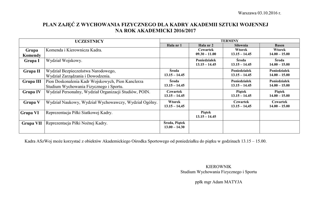 Warszawa 03.10.2016 r. PLAN ZAJĘĆ Z WYCHOWANIA FIZYCZNEGO DLA KADRY AKADEMII SZTUKI WOJENNEJ NA ROK AKADEMICKI 2016/2017 UCZESTNICY Hala nr 1 TERMINY Siłownia Wtorek 13.15 – 14.45 Basen Wtorek 14.00 – 15.00 Środa 13.15 – 14.45 Środa 14.00 – 15.00 Grupa Komendy Grupa I Komenda i Kierownicza Kadra. Hala nr 2 Czwartek 09.30 – 11.00 Wydział Wojskowy. Poniedziałek 13.15 – 14.45 Grupa II Środa 13.15 – 14.45 Poniedziałek 13.15 – 14.45 Poniedziałek 14.00 – 15.00 Środa 13.15 – 14.45 Poniedziałek 13.15 – 14.45 Poniedziałek 14.00 – 15.00 Grupa IV Wydział Bezpieczeństwa Narodowego, Wydział Zarządzania i Dowodzenia. Pion Doskonalenia Kadr Wojskowych, Pion Kanclerza Studium Wychowania Fizycznego i Sportu. Wydział Personalny, Wydział Organizacji Studiów, POIN. Czwartek 13.15 – 14.45 Piątek 13.15 – 14.45 Piątek 14.00 – 15.00 Grupa V Wydział Naukowy, Wydział Wychowawczy, Wydział Ogólny. Wtorek 13.15 – 14,45 Czwartek 13.15 – 14,45 Czwartek 14.00 – 15.00 Grupa III Grupa VI Reprezentacja Piłki Siatkowej Kadry. Grupa VII Reprezentacja Piłki Nożnej Kadry. Piątek 13.15 – 14.45 Środa, Piątek 13.00 – 14.30 Kadra ASzWoj może korzystać z obiektów Akademickiego Ośrodka Sportowego od poniedziałku do piątku w godzinach 13.15 – 15.00. KIEROWNIK Studium Wychowania Fizycznego i Sportu ppłk mgr Adam MATYJA
