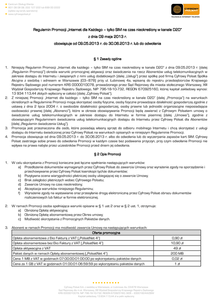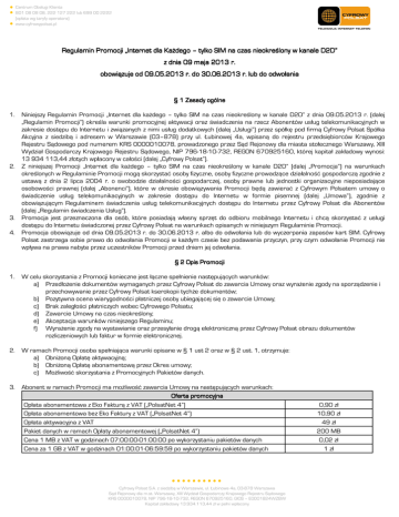 Centrum Obsługi Klienta 801 08 08 08, 222 127 222 lub 699 00 2222 (opłata wg taryfy operatora) www.cyfrowypolsat.pl Regulamin Regulamin Promocji „Internet dla Każdego Każdego – tylko SIM na czas nieokreślony w kanale D2D” D2D” z dnia 09 maja 2013 r. obowiązuje od 09.05.2013 09.05.2013 r. do 30. 30.06.2013 r. lub do odwołania § 1 Zasady ogólne 1. Niniejszy Regulamin Promocji „Internet dla każdego – tylko SIM na czas nieokreślony w kanale D2D” z dnia 09.05.2013 r. (dalej „Regulamin Promocji”) określa warunki promocyjnej aktywacji oraz świadczenia na rzecz Abonentów usług telekomunikacyjnych w zakresie dostępu do Internetu i związanych z nimi usług dodatkowych (dalej „Usługi”) przez spółkę pod firmą Cyfrowy Polsat Spółka Akcyjna z siedzibą i adresem w Warszawie (03–878) przy ul. Łubinowej 4a, wpisaną do rejestru przedsiębiorców Krajowego Rejestru Sądowego pod numerem KRS 0000010078, prowadzonego przez Sąd Rejonowy dla miasta stołecznego Warszawy, XIII Wydział Gospodarczy Krajowego Rejestru Sądowego, NIP 796-18-10-732, REGON 670925160, której kapitał zakładowy wynosi: 13 934 113,44 złotych wpłacony w całości (dalej „Cyfrowy Polsat”). 2. Z niniejszej Promocji „Internet dla każdego – tylko SIM na czas nieokreślony w kanale D2D” (dalej „Promocja”) na warunkach określonych w Regulaminie Promocji mogą skorzystać osoby fizyczne, osoby fizyczne prowadzące działalność gospodarczą zgodnie z ustawą z dnia 2 lipca 2004 r. o swobodzie działalności gospodarczej, osoby prawne lub jednostki organizacyjne nieposiadające osobowości prawnej (dalej „Abonenci”), które w okresie obowiązywania Promocji będą zawierać z Cyfrowym Polsatem umowy o świadczenie usług telekomunikacyjnych w zakresie dostępu do Internetu w formie pisemnej (dalej „Umowa”), zgodnie z obowiązującym Regulaminem świadczenia usług telekomunikacyjnych dostępu do Internetu przez Cyfrowy Polsat dla Abonentów (dalej „Regulamin świadczenia Usług”). 3. Promocja jest przeznaczona dla osób, które posiadają własny sprzęt do odbioru mobilnego Internetu i chcą skorzystać z usługi dostępu do Internetu świadczonej przez Cyfrowy Polsat na warunkach opisanych w niniejszym Regulaminie Promocji. 4. Promocja obowiązuje od dnia 09.05.2013 r. do 30.06.2013 r. albo do odwołania lub do wyczerpania zapasów kart SIM. Cyfrowy Polsat zastrzega sobie prawo do odwołania Promocji w każdym czasie bez podawania przyczyn, przy czym odwołanie Promocji nie wpływa na prawa nabyte przez uczestników Promocji przed dniem jej odwołania. § 2 Opis Promocji 1. W celu skorzystania z Promocji konieczne jest łączne spełnienie następujących warunków: a) Przedłożenie dokumentów wymaganych przez Cyfrowy Polsat do zawarcia Umowy oraz wyrażenie zgody na sporządzenie i przechowywanie przez Cyfrowy Polsat kserokopii tychże dokumentów; b) Pozytywna ocena wiarygodności płatniczej osoby ubiegającej się o zawarcie Umowy; c) Brak zaległości płatniczych wobec Cyfrowego Polsatu; d) Zawarcie Umowy na czas nieokreślony; e) Akceptacja warunków niniejszego Regulaminu; f) Wyrażenie zgody na wystawianie oraz przesyłanie drogą elektroniczną przez Cyfrowy Polsat obrazu dokumentów rozliczeniowych lub faktur w formie elektronicznej. 2. W ramach Promocji osoba spełniająca warunki opisane w § 1 ust 2 oraz w § 2 ust. 1, otrzymuje: a) Obniżoną Opłatę aktywacyjną; b) Obniżoną Opłatę abonamentową przez Okres umowy; c) Możliwość skorzystania z Promocyjnych Pakietów danych. 3. Abonent w ramach Promocji ma możliwość zawarcia Umowy na następujących warunkach: Oferta promocyjna Opłata abonamentowa z Eko Fakturą z VAT („PolsatNet 4”) Opłata abonamentowa bez Eko Faktury z VAT („PolsatNet 4”) Opłata aktywacyjna z VAT Pakiet danych w ramach Opłaty abonamentowej („PolsatNet 4”) Cena 1 MB z VAT w godzinach 07:00:00-01:00:00 po wykorzystaniu pakietów danych Cena za 1 GB z VAT w godzinach 01:00:01-06:59:59 po wykorzystaniu pakietów danych Cyfrowy Polsat S.A. z siedzibą w Warszawie, ul. Łubinowa 4a, 03-878 Warszawa Sąd Rejonowy dla m.st. Warszawy, XIII Wydział Gospodarczy Krajowego Rejestru Sądowego KRS 0000010078, NIP 796-18-10-732, REGON 670925160, GIOŚ – E0001824WZBW Kapitał zakładowy 13.934.113,44 zł w pełni wpłacony 0,90 zł 10,90 zł 49 zł 200 MB 0,02 zł 1 zł Centrum Obsługi Klienta 801 08 08 08, 222 127 222 lub 699 00 2222 (opłata wg taryfy operatora) www.cyfrowypolsat.pl 4. Abonent w ramach Promocji ma możliwość zawarcia Umowy na następujących warunkach: Cykliczny Pakiet danych Pakiet Promocyjny Pakiet Promocyjny Pakiet Promocyjny Pakiet Promocyjny Pakiet Promocyjny Pakiet Promocyjny Pakiet Promocyjny PolsatNet 1 GB PolsatNet 3 GB PolsatNet 10 GB PolsatNet 15 GB PolsatNet 20 GB PolsatNet 25 GB PolsatNet 35 GB Oplata abonamentowa z Eko Fakturą Fakturą z VAT („PolsatNet 4”) Opłata abonamentowa bez Eko Faktury z VAT („PolsatNet 4”) Opłata za Cykliczny pakiet danych z VAT 14 zł 29 zł 49 zł 59 zł 79 zł 99 zł 139 zł Łączna opłata miesięczna z Eko Fakturą z VAT 14,90 zł 29,90 zł 49,90 zł 59,90 zł 79,90 zł 99,90 zł 139,90 zł Łączna opłata miesięczna bez Eko Faktury z VAT 24,90 zł 39,90 zł 59,90 zł 69,90 zł 89,90 zł 109,90 zł 149,90 zł 20 GB 25 GB 35 GB 0,90 zł 10,90 zł Opłata aktywacyjna z VAT 49 zł Cena za SMS wysłany z modemu (z VAT) Cykliczny pakiet danych - miesięcznie do wykorzystania tylko w godzinach 07:00:00-01:00:00 Darmowe Noce 2) 1 GB Brak 1) 2) Cena 1 MB z VAT w godzinach 07:00:0001:00:00 po wykorzystaniu pakietów danych Cena za 1 GB z VAT w godzinach 01:00:0106:59:59 po wykorzystaniu pakietów danych 1) 0,20 zł 3 GB 10 GB 15 GB BEZPŁATNIE 0,02 zł 1 zł Pakiet 50 GB do wykorzystania w godzinach 01:00:01-06:59:59. Nie dotyczy Pakietu 1 GB. Abonent ma możliwość aktywacji Pakietu Nocnego (50 GB do wykorzystania w godzinach 01:00:01-06:59: