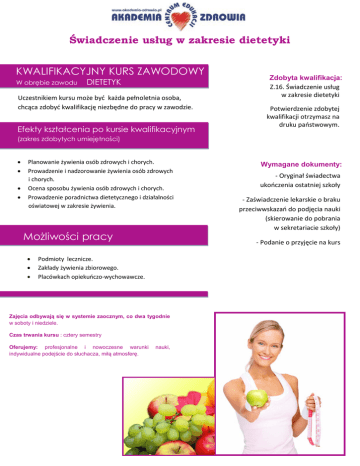 Świadczenie usług w zakresie dietetyki KWALIFIKACYJNY KURS ZAWODOWY W obrębie zawodu DIETETYK Uczestnikiem kursu może być każda pełnoletnia osoba, chcąca zdobyć kwalifikację niezbędne do pracy w zawodzie. Efekty kształcenia po kursie kwalifikacyjnym Zdobyta kwalifikacja: Z.16. Świadczenie usług w zakresie dietetyki Potwierdzenie zdobytej kwalifikacji otrzymasz na druku państwowym. (zakres zdobytych umiejętności) • • • • Planowanie żywienia osób zdrowych i chorych. Prowadzenie i nadzorowanie żywienia osób zdrowych i chorych. Ocena sposobu żywienia osób zdrowych i chorych. Prowadzenie poradnictwa dietetycznego i działalności oświatowej w zakresie żywienia. Możliwości pracy • • • - Oryginał świadectwa ukończenia ostatniej szkoły - Zaświadczenie lekarskie o braku przeciwwskazań do podjęcia nauki (skierowanie do pobrania w sekretariacie szkoły) - Podanie o przyjęcie na kurs Podmioty lecznicze. Zakłady żywienia zbiorowego. Placówkach opiekuńczo-wychowawcze. Zajęcia odbywają się w systemie zaocznym, co dwa tygodnie w soboty i niedziele. Czas trwania kursu : cztery semestry Oferujemy: profesjonalne i nowoczesne warunki indywidualne podejście do słuchacza, miłą atmosferę. Wymagane dokumenty: nauki,