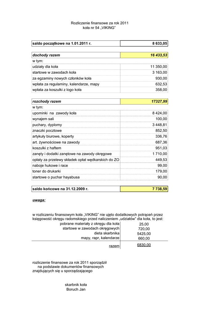 Rozliczenie finansowe za rok 2011 koła nr 54 „VIKING” saldo początkowe na 1.01.2011 r. 8 633,05 dochody razem 16 433,53 w tym: udziały dla koła 11 350,00 startowe w zawodach koła 3 163,00 za egzaminy nowych członków koła 930,00 wpłata za regulaminy, kalendarze, mapy 632,53 wpłata za koszulki z logo koła 358,00 rozchody razem 17327,99 w tym: upominki na zawody koła 8 424,00 wynajem sali 100,00 puchary, dyplomy 3 448,81 znaczki pocztowe 852,50 artykuły biurowe, koperty 336,76 art. żywnościowe na zawody 687,36 koszulki z haftem 951,03 zanęty i dodatki zanętowe na zawody okręgowe 1 710,00 opłaty za przelewy składek opłat wędkarskich do ZO 449,53 naboje hukowe i race 99,00 toner do drukarki 179,00 startowe o puchar hayabusa 90,00 saldo końcowe na 31.12.2009 r. 7 738,59 uwaga: w rozliczeniu finansowym koła „VIKING” nie ujęto dodatkowych potrąceń przez księgowość okręgu radomskiego przed naliczeniem „udziałów” dla koła, to jest: pobrane materiały z okręgu dla koła 25,00 startowe w zawodach okręgowych 720,00 dieta skarbnika 5425,00 mapy, rapr, kalendarze 660,00 razem rozliczenie finansowe za rok 2011 sporządził na podstawie dokumentów finansowych znajdujących się u sporządzającego skarbnik koła Boruch Jan 6830,00