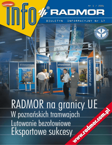 Nr 1 / 2006 Na ok∏adce: Stoisko Radmoru na targach MSPO 2005 nagrodzone za ciekawe rozwiàzania przestrzenne Zapraszamy do kontaktu z pracownikami Biura Obs∏ugi Klienta. Zespó∏ Mened˝erów gotów jest s∏u˝yç Paƒstwu wszelkà pomocà. Szanowni Czytelnicy, FLESZ 2 Zapraszamy do lektury kolejnego numeru naszego biuletynu, w którym znajdziecie Paƒstwo wiele ciekawych informacji. Razem z Paƒstwem z∏o˝ymy wizyt´ w Miejskim Przedsi´biorstwie Komunikacyjnym w Poznaniu, w którym pracuje system ∏àcznoÊci oparty na naszych radiotelefonach. W lipcu 2006 roku w Polsce oraz innych krajach Unii Europejskiej zacznie obowiàzywaç Dyrektywa w sprawie ograniczenia stosowania niektórych niebezpiecznych substancji w sprz´cie elektrycznym i elektronicznym. W artykule „RADMOR w obliczu dyrektywy RoHS” opisujemy Paƒstwu jak do jej stosowania przygotowuje si´ nasze przedsi´biorstwo. Zainteresowanie swojà ofertà RADMOR stara si´ wzbudzaç pokazujàc sprz´t na targach w kraju i zagranicà. Mi´dzy innymi poprzez takie dzia∏ania zdobywamy kolejnych klientów i mo˝emy pochwaliç si´ du˝ymi kontraktami na dostawy sprz´tu wojskowego i cywilnego. ˚yczymy ciekawej lektury i zapraszamy do kontaktu z pracownikami Biura Obs∏ugi Klienta. Menad˝erowie odpowiedzà na Paƒstwa pytania i przedstawià aktualnà ofert´. Na naszej stronie interentowej www.radmor.com.pl znajdziecie Paƒstwo najÊwie˝sze wiadomoÊci o urzàdzeniach oraz firmowych wydarzeniach. Redakcja Radiostacje dla „Rosomaka” Zwyci´zcà przetargu z 2001 r. na dostaw´ ko∏owego transportera opancerzonego dla polskiej armii zosta∏ pojazd AMV 8x8 fiƒskiej firmy Patria Vehicles Oy. Pod nazwà „Rosomak” jest on produkowany w siemianowickich Wojskowych Zak∏adach Mechanicznych. W roku 2005 Wojska Làdowe otrzyma∏y 89 transporterów a przewidywane jest wprowadzenie na wyposa˝enie batalionów zmechanizowanych 690 pojazdów. RADMOR wyposa˝y∏ w zesz∏ym roku wszystkie 89 sztuk „Rosomaka” w radiostacje pok∏adowe RRC 9500. W 2006 roku planujemy dostarczyç do Siemianowic 69 tych radiostacji. Jowita Gotówko tel.: 058/69 96 669 [email protected] Klienci pani Jowity to: firmy taksówkowe i transportowe, s∏u˝ba zdrowia, ochrona mienia, poczta, energetyka, gazownictwo, leÊnictwo, przedsi´biorstwa gospodarki komunalnej. Andrzej Wysocki tel.: 058/69 96 668 [email protected] Pan Andrzej s∏u˝y pomocà klientom z policji, stra˝y po˝arnej i granicznej, zarzàdzania kryzysowego i obrony cywilnej, administracji paƒstwowej, stra˝y miejskich, zak∏adów karnych. Ewa Kadecka tel.: 058/69 96 657 [email protected] Pani Ewa zajmuje si´ sprzeda˝à cz´Êci zamiennych, osprz´tu i instrukcji technicznych; obs∏uguje równie˝ ma∏e firmy i klientów indywidualnych. U pani Ewy mo˝na zasi´gnàç informacji na temat przedstawicieli handlowych naszej firmy. El˝bieta Krysztofiak tel.: 058/69 96 659 [email protected] Odbiorcy, którym pani El˝bieta s∏u˝y pomocà to: wojsko oraz zak∏ady przemys∏owe i instytuty pracujàce na rzecz wojska. Ma∏gorzata Zeman Marek Cichowski Szef Biura Obs∏ugi Klienta tel.: 058/69 96 666 – sekretariat tel.: 058/69 96 660 fax.: 058/69 96 662 [email protected] [email protected] Nowe maszyny – nowe mo˝liwoÊci Ubieg∏y rok by∏ dla Zak∏adu Mechanicznego kolejnym rokiem dynamicznego wzrostu wartoÊci sprzeda˝y. W stosunku do 2004 r. odnotowaliÊmy blisko 40% wzrost. Rok 2005 up∏ynà∏ pod znakiem wdro˝enia do produkcji szerokiej gamy szaf 19”. By∏o to przedsi´wzi´cie doÊç trudne mi´dzy innymi ze wzgl´du na znaczne gabaryty tych wyrobów. Obecnie produkowane przez nas szafy znajdujà klientów w kraju oraz zagranicà. Podj´ta w ubieg∏ym roku wspó∏praca z jednym z globalnych koncernów informatycznych daje nam szans´ na bardziej dynamiczny rozwój eksportu. Oprócz rozszerzania oferty naszych wyrobów doskonalimy te˝ technologie ich wytwarzania. Kupujemy nowe Êrodki produkcji i modernizujemy park maszynowy. Dotyczy to g∏ównie technologii spawania metali oraz produkcji specjalistycznych przyrzàdów takich jak formy odlewnicze i wtryskowe. Do zwi´kszenia wydajnoÊci produkcji i podniesienia jakoÊci wykonywanych elementów przyczyni∏a si´ miedzy innymi nowoczesna wykrawarka FINN-POWER C-5. Zak∏ad Mechaniczny przeszed∏ z pozytywnym skutkiem szereg audytów prowadzonych przez naszych klientów oraz audyt certyfikujàcy i sprawdzajàcy prowadzony przez firm´ certyfikujàcà Lloyd’s Register na zgodnoÊç z normà ISO 9001:2000. Jacek Korytowski www.zmradmor.pl; tel.: 058/69 96 570 Produkty: ■ systemy konstrukcji noÊnych 19” – kasety wraz z wyposa˝eniem, szafy, stojaki, obudowy, p∏ytki czo∏owe, wyposa˝enie specjalne ■ konstrukcje noÊne, obudowy, w tym o podwy˝szonych wymaganiach odpornoÊci mechanicznej ■ osprz´t mechaniczny – radiatory, ekrany, elementy z∏àczne, uchwyty i wsporniki ■ anteny do urzàdzeƒ radiokomunikacyjnych ■ podzespo∏y zabezpieczenia mienia – podajniki kasowe Us∏ugi: ■ wykrawanie i gi´cie blach na obrabiarkach sterowanych numerycznie ■ t∏oczenie na prasach mimoÊrodowych ■ frezowanie i t∏oczenie na nowoczesnych centrach obróbczych CNC ■ zgrzewanie metali, w tym metali kolorowych ■ spawanie metali w os∏onie argonu i dwutlenku w´gla ■ bezstykowe pomiary d∏ugoÊci detali oraz pomiarów kàta ■ okresowe kontrole warsztatowych narz´dzi pomiarowych d∏ugoÊci i kàta ■ projektowanie obudów i elementów mechanicznych zgodnie z wymaganiami klienta ■ doradztwo techniczne przy wykonawstwie obudów, elementów mechaniki, wykrojników, stempli, itp. ■ opracowywanie oprogramowania dla maszyn sterowanych numerycznie Morskie podsumowanie Na poczàtku ka˝dego roku goÊcimy przedstawicieli serwisowych i handlowych naszej firmy. Nie inaczej by∏o i w tym roku - takie spotkanie odby∏o si´ w Radmorze od 23 do 25 lutego. Zawsze jest to doskona∏a okazja n
