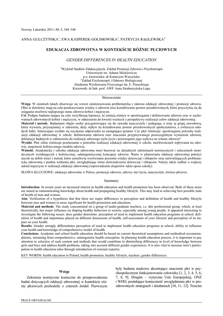 Nowiny Lekarskie 2011, 80, 5, 344–348 ANNA GULCZYŃSKA1, EWA KASPEREK-GOLIMOWSKA1, PATRYCJA RĄGLEWSKA2 EDUKACJA ZDROWOTNA W KONTEKŚCIE RÓŻNIC PŁCIOWYCH GENDER DIFFERENCES IN HEALTH EDUCATION 1 Wydział Studiów Edukacyjnych, Zakład Promocji Zdrowia i Psychoterapii Uniwersytet im. Adama Mickiewicza p.o. kierownika: dr Katarzyna Waszyńska 2 Zakład Fizykoterapii i Odnowy Biologicznej Akademia Wychowania Fizycznego im. E. Piaseckiego Kierownik: dr hab. prof. AWF Anna Straburzyńska-Lupa Streszczenie Wstęp. W ostatnich latach obserwuje się wzrost zainteresowania problematyką z zakresu edukacji zdrowotnej i promocji zdrowia. Obie te dziedziny mają na celu przekazywanie wiedzy o zdrowiu oraz kształtowanie postaw prozdrowotnych, które przyczynią się do osiągania możliwie najlepszego stanu zdrowia kobiet i mężczyzn. Cel. Podjęto badania mające na celu weryfikację hipotezy, że istnieją różnice w spostrzeganiu i definiowaniu zdrowia oraz w zachowaniach zdrowotnych kobiet i mężczyzn, w odniesieniu do kwestii ważnych z perspektywy realizacji celów edukacji zdrowotnej. Materiał i metody. Badaniami objęto osoby przygotowujące się do zawodu nauczyciela i pedagoga, a więc tę grupę zawodową, która wywiera, przynajmniej w założeniu, duży wpływ na kształtowanie postaw prozdrowotnych społeczeństwa, a zwłaszcza młodych ludzi. Interesujące wydało się uzyskanie odpowiedzi na następujące pytania: Czy płeć różnicuje: spostrzeganie potrzeby realizacji edukacji zdrowotnej w szkole; definiowania zdrowia oraz znaczenia przypisywanego poszczególnym wymiarom zdrowia; deklaracje badanych w odniesieniu do realizacji zdrowego stylu życia i postrzeganie jego wpływu na własne zdrowie? Wyniki. Płeć silnie różnicuje przekonanie o potrzebie realizacji edukacji zdrowotnej w szkole, możliwościach wpływania na zdrowie, znajomość holistycznego modelu zdrowia. Wnioski. Akademicka i szkolna edukacja zdrowotna musi bazować na aktualnych założeniach teoretycznych i zaleceniach metodycznych wynikających z holistycznej, salutogenetycznej koncepcji zdrowia. Warto w planowaniu edukacji zdrowotnej położyć nacisk na dobór treści i metod, które umożliwią wyrównanie poziomu wiedzy dziewcząt i chłopców oraz naświetlających problematykę zdrowotną z punktu widzenia płci, uwzględniając różne doświadczenia dziewcząt i chłopców. Należy także zadbać o większy udział mężczyzn w realizacji edukacji zdrowotnej (wprowadzanie ekspertów także spoza szkoły). SŁOWA KLUCZOWE: edukacja zdrowotna w Polsce, promocja zdrowia, zdrowy styl życia, nauczyciele, różnice płciowe. Summary Introduction. In recent years an increased interest in health education and health promotion has been observed. Both of these areas are aimed at communicating knowledge about health and propagating healthy lifestyle. This may lead to achieving best possible state of health of men and women. Aim. Verification of a hypothesis that that there are major differences in perception and definition of health and healthy lifestyle between men and women in areas significant for health promotion and education. Material and methods. The study concentrated on a group of under-graduate teachers, i.e. this professional group, which, at least theoretically, has major influence on shaping healthy behaviors in society, especially among young people. It appeared interesting to investigate the following issues: does gender determine: perception of need to implement health education programs at school; definition of health and importance placed on different dimensions of health; self-assessment of your lifestyle and perception of its impact on your health. Results. Gender strongly differentiates perception of need to implement health education programs at school, ability to influence your health and knowledge of comprehensive model of health. Conclusions. Academic and school health education should be based on current theoretical assumptions and methodical recommendations, stemming from comprehensive, salutogenetic health conception. In planning health education process, it is important to pay attention to selection of such content and methods that would contribute to diminishing differences in level of knowledge between girls and boys and address health problems, taking into account different gender experiences. It is also vital to increase men’s participation in health education (also through introduction of external experts). KEY WORDS: health education in Poland, health promotion, healthy lifestyle, teachers, gender differences. Wstęp Założenia teoretyczne konieczne do przeprowadzenia badań dotyczących edukacji zdrowotnej w kontekście różnic płciowych pochodziły z czterech źródeł. Pierwszym PRACE ORYGINALNE były badania naukowe akcentujące znaczenie płci w psychospołecznym funkcjonowaniu człowieka [1, 2, 3, 4, 5, 6, 7, 8, 9]. Drugim – wytyczne Unii Europejskiej, ONZ i WHO, postulujące konieczność uwzględnienia płci w prozdrowotnych strategiach i działaniach [10, 11, 12]. Trzecim Edukacja zdrowotna w kontekście różnic płciowych – dane statystyczne ukazujące płeć jako bardzo wyrazistą kategorię, różnicującą stan zdrowia i funkcjonowanie zdrowotne człowieka [13, 14, 15, 16, 17, 18]. Czwartym źródłem wyznaczającym koncepcyjną i metodologiczną stronę pracy były teorie wywodzące się z edukacji zdrowotnej [20, 21, 22]. Materiał i metody W niniejszej pracy została zastosowana procedura diagnostyczna. Przeprowadzone badania miały charakter opisowy i stanowią wstęp do pełniejszego opracowania złożonej tematyki związku płci ze zdrowiem. Wyniki uzyskanych badań pozwalają dokonać opisu zmiennych o różnorodnym charakterze, mających wpływ na percepcję zdrowia przez osoby formalnie przygotowujące się do roli propagatorów zdrowia oraz stanowią przyczynek do stawiania następnych pytań i budowania dalszych hipotez. Badania takie 