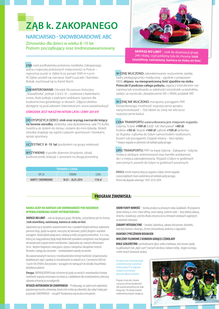 ZĄB k. ZAKOPANEGO NARCIARSKO – SNOWBOARDOWE ABC Zimowisko dla dzieci w wieku 8 –15 lat Poziom: początkujący oraz średniozaawansowany ZĄB: wieś podhalańska położona niedaleko Zakopanego, jedna z najwyżej położonych miejscowości w Polsce – najwyższy punkt w Zębie liczy ponad 1040 m n.p.m. W Zębie urodzili się narciarze Józef Łuszczek i Stanisław Bobak, wychował się tu Kamil Stoch. ZAKWATEROWANIE: Ośrodek Wczasowo-Kolonijny „Staszelówka”, pokoje 2,3,4,5 i 6 – osobowe z łazienkami; nowe, duże pokoje z pięknymi widokami, typowe dla budownictwa góralskiego w skosach. Zdjęcia obiektu dostępne są pod adresem internetowym: www.staszelowka.pl. OŚRODEK JEST NASZYM HITEM LATA I ZIMY 2013 !!! DO DYSPOZYCJI DZIECI: stok oraz wyciąg narciarski leżący na terenie ośrodka, stołówka, sala dyskotekowa, sala TV, bufet, świetlica ze stołem do tenisa i stołami do mini-bilarda. Wokół ośrodka znajduje się ogród z placem sportowym i boiskami, sprzęt sportowy. UCZESTNICY: 8 - 15 lat (podzieleni na grupy wiekowe). WYŻYWIENIE: 4 posiłki dziennie (śniadanie, obiad, podwieczorek, kolacja) + prowiant na drogę powrotną. TERMIN I CENA OPCJA TERMIN CENA NARTY / SNOWBOARD 18.01 – 26.01.2014 1116 zł SKIPASS NO LIMIT – stok do dyspozycji grupy 24h / dobę, czyli jeździmy tyle ile chcemy (stok oświetlony, naśnieżany, kamera ze stoku on line) W CENĘ WLICZONO: zakwaterowanie, wyżywienie, opiekę kadry pedagogicznej i medycznej – zgodnie z przepisami MEN, skipass na nieograniczoną ilość zjazdów na stoku Potoczki II podczas całego pobytu, zajęcia z instruktorem narciarstwa lub snowboardu w zależności od potrzeb uczestników, opłaty: za wycieczki, ubezpieczenie SKI + NNW, podatek VAT. W CENĘ NIE WLICZONO: transportu pociągiem PKP, kieszonkowego; możliwość wypożyczenia sprzętu: narty/snowboard – 15zł /dzień (w cenę nie wliczono wypożyczenia kasku). CENA TRANSPORTU uwarunkowana jest miejscem wyjazdu: Gdynia, Tczew +100 zł; Łódź lub Warszawa* +80 zł, Kraków +50 zł; Słupsk +160 zł; Lębork +150 zł (antenka ze Słupska i Lęborka do Gdyni samochodem osobowym, busem lub pociągiem). Dojazd własny – bez opłaty. * miejsce wyjazdu w zależności od rozkładu jazdy pociągu OPIS TRANSPORTU: PKP na trasie Gdynia – Zakopane – Gdynia (miejsca siedzące, rezerwowane) oraz transfer autokarowy do i z miejsca zakwaterowania. Wyjazd z Gdyni w godzinach wieczornych, powrót do Gdyni w godzinach porannych. UWAGA: termin imprezy dotyczy wyjazdu z Gdyni, termin wyjazdu z poszczególnych miast uzależniony od rozkładu jazdy pociągu. Termin dla dojazdu własnego: 19.01-25.01.2014 PROGRAM ZIMOWISKA: NAUKA JAZDY NA NARTACH LUB SNOWBOARDZIE POD NADZOREM WYKWALIFIKOWANEJ KADRY INSTRUKTORSKIEJ SKIPASS NO LIMIT – stok do dyspozycji grupy 24h/dobę, czyli jeździmy tyle ile chcemy (stok oświetlony, naśnieżany, kamera ze stoku on line). Zapoznamy się ze sprzętem, nazewnictwem oraz z zasadami bezpieczeństwa, wykonamy pierwsze ślizgi, zjazdy na wprost, nauczymy się hamować, jeździć pługiem i wjeżdżać wyciągiem. Nauka będzie połączona z zabawą w miłej i przyjaznej atmosferze. A ci z nas, którzy już znają podstawy będą mogli doskonalić posiadane umiejętności oraz korygować złe nawyki pod czujnym okiem instruktorów. Zapoznamy się z nowymi elementami (m.in.: skrętem ślizgowym, rotacyjnym, ciętym z odciążenia i dociążenia i innymi). Na koniec czekają nas narciarsko – snowboardowe zawody na wesoło. Dla zaawansowanych narciarzy i snowboardzistów istnieje możliwość zorganizowania dodatkowych zajęć i zjazdów (z instruktorami) na stokach m.in. Czerwienne (650 m) i Suche-Ski (950m) (korzystanie z wyciągów nie należących do ośrodka Staszelówka dodatkowo płatne). Uwaga: OBOWIĄZKOWO kaski ochronne do jazdy na nartach i snowboardzie (istnieje możliwość wypożyczenia kasku na miejscu), a dodatkowo dla snowboardzisty zalecamy zabranie ochraniaczy na nadgarstki. WYJAZD AUTOKAREM DO ZAKOPANEGO – Przebywając na zapleczach najbardziej popularnego kurortu zimowego, koniecznie trzeba go odwiedzić aby nabyć tradycyjne przysmaki ZAKOPANEGO – oscypki!! Autokarowa wycieczka na Krupówki. SNOW FUN !!! NOWOŚĆ – bomba atrakcji na zimowym stoku Gubałówki. W programie skuter śnieżny a z nim: snow rafting, snow tubing, extreme sanki – dużo dobrej zabawy, śmiechu i rywalizacji, czyli kto dłużej utrzyma się na zimowych atrakcjach ciągniętych za skuterem śnieżnym. ZABAWY INTEGRACYJNE – karaoke, kalambury, zabawy drużynowe, dyskoteki, wieczory humoru i dowcipu, chrzest zimowiskowy, konkursy z nagrodami. OGNISKO Z PIECZENIEM KIEŁBASEK WIECZORY FILOMOWE Z KUBKIEM GORĄCEJ CZEKOLADY BIAŁE SZALEŃSTWO czyli budowanie igloo, walka o bałwana, wieczorowe zjazdy na jabłuszkach (lub „byle czym”) nartach lub desce, lodowe rzeźby , kręgle na śniegu i wiele innych zimowych atrakcji. Po zakończeniu zimowiska każdy uczestnik otrzyma w prezencie od biura płytę CD ze zdjęciami z pobytu na zimowisku (płyta do odbioru w biurze). Program może ulec zmianie z przyczyn od nas niezależnych (złe warunki atmosferyczne, brak śniegu itp.). W zamian zostanie zrealizowany program zastępczy.