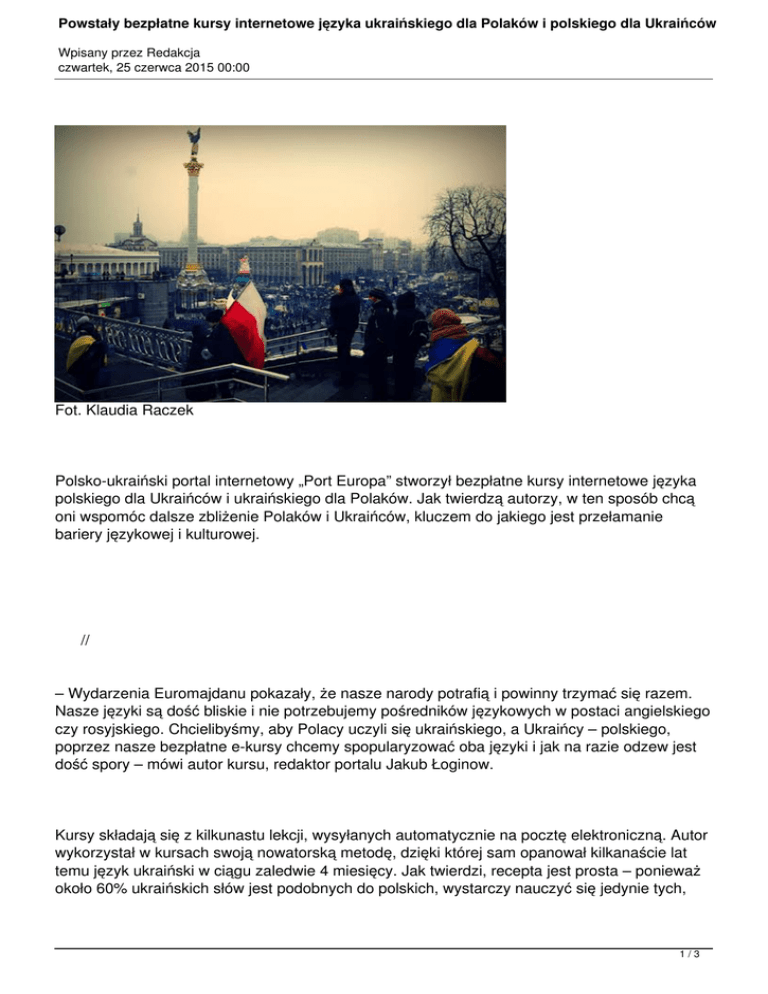 Powstały bezpłatne kursy internetowe języka ukraińskiego dla Polaków i polskiego dla Ukraińców Wpisany przez Redakcja czwartek, 25 czerwca 2015 00:00 Fot. Klaudia Raczek Polsko-ukraiński portal internetowy „Port Europa” stworzył bezpłatne kursy internetowe języka polskiego dla Ukraińców i ukraińskiego dla Polaków. Jak twierdzą autorzy, w ten sposób chcą oni wspomóc dalsze zbliżenie Polaków i Ukraińców, kluczem do jakiego jest przełamanie bariery językowej i kulturowej. // – Wydarzenia Euromajdanu pokazały, że nasze narody potrafią i powinny trzymać się razem. Nasze języki są dość bliskie i nie potrzebujemy pośredników językowych w postaci angielskiego czy rosyjskiego. Chcielibyśmy, aby Polacy uczyli się ukraińskiego, a Ukraińcy – polskiego, poprzez nasze bezpłatne e-kursy chcemy spopularyzować oba języki i jak na razie odzew jest dość spory – mówi autor kursu, redaktor portalu Jakub Łoginow. Kursy składają się z kilkunastu lekcji, wysyłanych automatycznie na pocztę elektroniczną. Autor wykorzystał w kursach swoją nowatorską metodę, dzięki której sam opanował kilkanaście lat temu język ukraiński w ciągu zaledwie 4 miesięcy. Jak twierdzi, recepta jest prosta – ponieważ około 60% ukraińskich słów jest podobnych do polskich, wystarczy nauczyć się jedynie tych, 1/3 Powstały bezpłatne kursy internetowe języka ukraińskiego dla Polaków i polskiego dla Ukraińców Wpisany przez Redakcja czwartek, 25 czerwca 2015 00:00 które się różnią i których trudno się domyśleć nawet z kontekstu. Oprócz tego, w ramach obu kursów przedstawiane są przykłady specyficznych dla danego języka konstrukcji i ich odpowiedników w drugim języku. Na przykład, polskiemu przedrostkowi prze- odpowiada ukraiński pere- , polskie ą i ę często „wymieniają się” na ukraińskie u (np. ząb to po ukraińsku zub, dąb – dub, wędka – wudka itp.). Z kolei „odpowiednikiem” polskiego ó jest ukraińskie i (stąd Lwów – Lwiw, żubrówka – zubriwka). Takich nieformalnych reguł jest więcej, a mimo to na klasycznych kursach się o nich nie uczy – a tymczasem właśnie one najbardziej pomagają w nauce ukraińskiego lub polskiego. Jeszcze jedną osobliwością jest to, że w obu kursach wykorzystano fonetyczny zapis słów – np. słowa ukraińskie są zapisywane w polskim alfabecie. Wygląda to mniej więcej tak – oto przykład tak zapisanego ukraińskiego tekstu: „Dobroho dnia. Mene zwaty Andrij i ja je ukrajincem za pochodżenniam, ale teper meszkaju w Krakowi. Praciuju w miscewij filiji miżnarodnoji korporaciji na posadi starszoho buchhaltera. Lubliu czytaty knyżky, u wilnomu czasi takoż zajmajusja sportom, naprykład bihaju i pławaju w basejni”. Da się zrozumieć, prawda? Taki zapis pozwala oswoić się z językiem i eliminuje podstawową barierę, która wielu Polaków odstrasza od języka ukraińskiego – czyli cyrylicę. – Tak naprawdę cyrylicy można spokojnie nauczyć się już w trakcie nauki, zajmuje to wtedy zaledwie kilka dni i o wiele szybciej ona „wchodzi”, kiedy już się zna podstawy języka. I ten sposób naprawdę działa, kursanci go sobie chwalą – mówi Łoginow. Podobnie, w lekcjach języka polskiego zapis ukraińskiego tekstu w polskiej transkrypcji pomaga ukraińskim kursantom oswoić się z naszym alfabetem, zanim jeszcze poznają polskie słowa i gramatykę. Na bezpłatny e-kurs języka ukraińskiego dla Polaków można zapisać się pod linkiem: www.por teuropa.eu/ukrainski Z kolei link do zapisu na kurs języka polskiego dla Ukraińców to www.porteuropa.eu/ua/polskamowa Autorzy zachęcają do nauki podstaw ukraińskiego również tych Polaków, którzy dotychczas nie mieli nic wspólnego z Ukrainą. Jak twierdzą, Ukraina to nasz sąsiad, o którym wciąż tyle się mówi w mediach, a tak naprawdę Polacy mało o nim wiedzą. Tymczasem język ukraiński jest łatwy, ciekawy i przyjemny, o wiele łatwiejszy do nauczenia, niż rosyjski. Warto skorzystać choćby z ciekawości. - 2/3 Powstały bezpłatne kursy internetowe języka ukraińskiego dla Polaków i polskiego dla Ukraińców Wpisany przez Redakcja czwartek, 25 czerwca 2015 00:00 Zachęcamy do rozpowszechniania tej informacji (przedruk na innych stronach lub w prasie drukowanej albo publikacja linka na portalach społecznościowych) 3/3