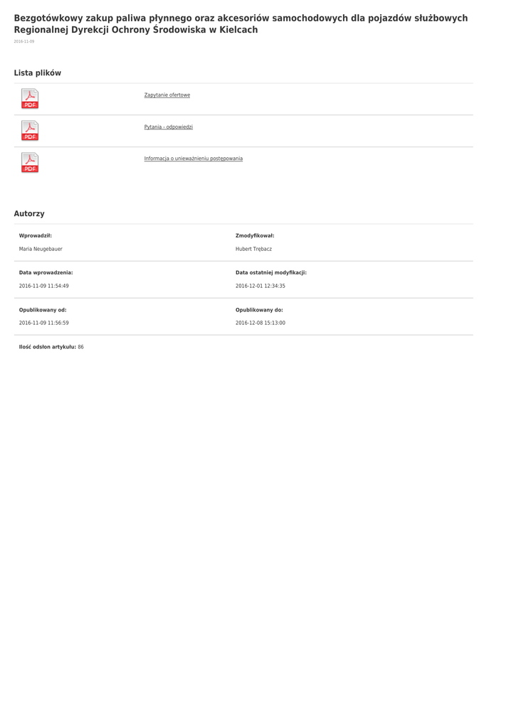 Bezgotówkowy zakup paliwa płynnego oraz akcesoriów samochodowych dla pojazdów służbowych Regionalnej Dyrekcji Ochrony Środowiska w Kielcach 2016-11-09 Lista plików Zapytanie ofertowe Pytania - odpowiedzi Informacja o unieważnieniu postępowania Autorzy Wprowadził: Zmodyfikował: Maria Neugebauer Hubert Trębacz Data wprowadzenia: Data ostatniej modyfikacji: 2016-11-09 11:54:49 2016-12-01 12:34:35 Opublikowany od: Opublikowany do: 2016-11-09 11:56:59 2016-12-08 15:13:00 Ilość odsłon artykułu: 86