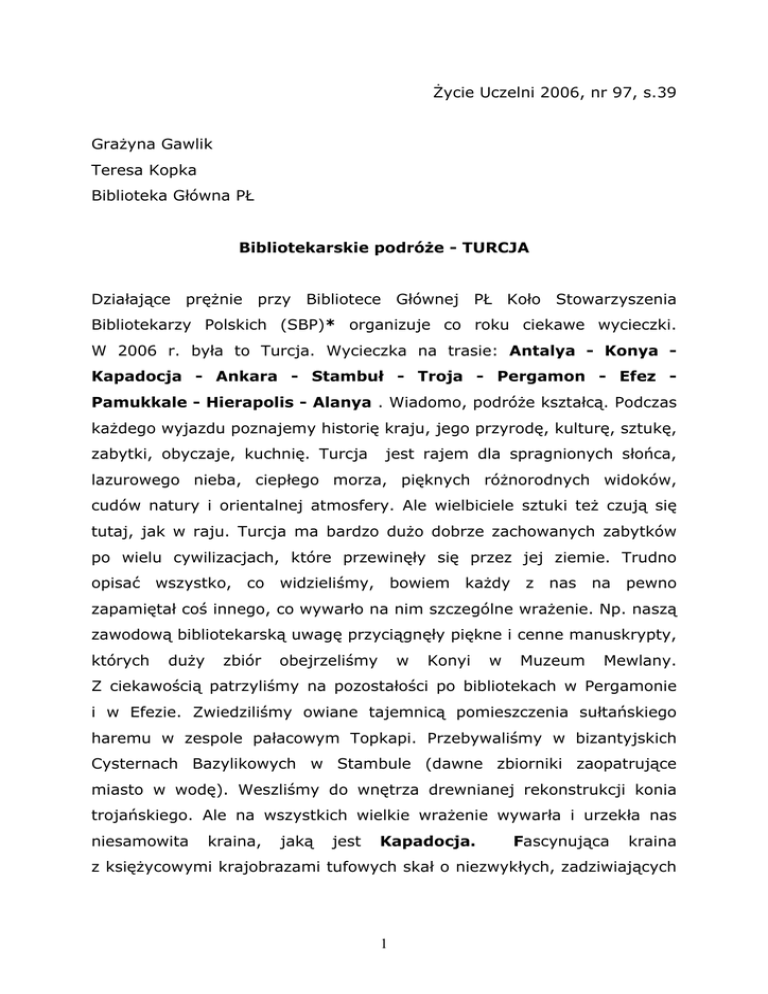 Życie Uczelni 2006, nr 97, s.39 Grażyna Gawlik Teresa Kopka Biblioteka Główna PŁ Bibliotekarskie podróże - TURCJA Działające prężnie przy Bibliotece Głównej PŁ Koło Stowarzyszenia Bibliotekarzy Polskich (SBP)* organizuje co roku ciekawe wycieczki. W 2006 r. była to Turcja. Wycieczka na trasie: Antalya - Konya Kapadocja - Ankara - Stambuł - Troja - Pergamon - Efez Pamukkale - Hierapolis - Alanya . Wiadomo, podróże kształcą. Podczas każdego wyjazdu poznajemy historię kraju, jego przyrodę, kulturę, sztukę, zabytki, obyczaje, kuchnię. Turcja jest rajem dla spragnionych słońca, lazurowego nieba, ciepłego morza, pięknych różnorodnych widoków, cudów natury i orientalnej atmosfery. Ale wielbiciele sztuki też czują się tutaj, jak w raju. Turcja ma bardzo dużo dobrze zachowanych zabytków po wielu cywilizacjach, które przewinęły się przez jej ziemie. Trudno opisać wszystko, co widzieliśmy, bowiem każdy z nas na pewno zapamiętał coś innego, co wywarło na nim szczególne wrażenie. Np. naszą zawodową bibliotekarską uwagę przyciągnęły piękne i cenne manuskrypty, których duży zbiór obejrzeliśmy w Konyi w Muzeum Mewlany. Z ciekawością patrzyliśmy na pozostałości po bibliotekach w Pergamonie i w Efezie. Zwiedziliśmy owiane tajemnicą pomieszczenia sułtańskiego haremu w zespole pałacowym Topkapi. Przebywaliśmy w bizantyjskich Cysternach Bazylikowych w Stambule (dawne zbiorniki zaopatrujące miasto w wodę). Weszliśmy do wnętrza drewnianej rekonstrukcji konia trojańskiego. Ale na wszystkich wielkie wrażenie wywarła i urzekła nas niesamowita kraina, jaką jest Kapadocja. Fascynująca kraina z księżycowymi krajobrazami tufowych skał o niezwykłych, zadziwiających 1 kształtach grzybów, kominów, stożków, postaci i oryginalnych barwach: szarych, złotych, czerwono-rdzawych, a nawet zielonych. Przez wieki deszcze i wiatry wyrzeźbiły te nieziemskie kształty w skałach pochodzenia wulkanicznego. W tych skałach są wykute tajemnicze podziemne i piętrowe! miasta (jedno z nich Kaymakli zwiedziliśmy), mieszkania i świątynie z pięknymi freskami o tematyce związanej ze Starym i Nowym Testamentem. Podobno kościołów jest tu ok. 500, ale są one już tylko zabytkami. Najwięcej kościołów z bizantyjskimi freskami znajduje się w dolinach Göreme (m. in. Kościół Jabłka, Kościół Węża, Mroczny Kościół)i Zelve, które zwiedziliśmy. Zachwyciliśmy się „Bawełnianym Zamkiem”, czyli Pamukkale, gdzie ciepła woda, bogata w wapń, spływając po zboczach wzgórz w dół i stygnąc, wytrąca jony wapnia. W wyniku tego procesu powstały piękne białe pumeksowe tarasy z basenikami wody, po których można brodzić lub się w nich kąpać. Wszędzie próbowaliśmy różnych dań kuchni tureckiej. Poznaliśmy wiele ciekawostek o Turcji i jej mieszkańcach. Tureckie kobiety otrzymały prawo wyborcze już w 1930 r. Widzieliśmy kobiety ubrane tradycyjnie, głównie w mniejszych miejscowościach, ale także i w dużych miastach, widzieliśmy ludzi poruszających się na tradycyjnym środku transportu, czyli na osiołku. Z terenów obecnej Turcji wywodzi się wiele znanych postaci, ale nikt z nas nie przypuszczał, że właśnie stąd wywodzi się św. Mikołaj - ten od prezentów! Dworzec kolejowy w Stambule był w latach 1883-1977 ostatnim przystankiem słynnego „Orient Expressu”. Wielki Bazar w Stambule to 4 tys. sklepów obsługiwanych przez 25 tys. sprzedawców. Prowadzą do niego 22 bramy i ma 64 uliczki. Z okolic jeziora Wan pochodzą rzadkie koty, nie dosyć, że lubiące pływać, to jeszcze mające jedno oko zielone, a drugie niebieskie. A kto z nas kojarzył Turcję z tulipanami! A to właśnie tutaj rosną one w stanie dzikim. Do Holandii zostały wywiezione dopiero w 1554 r. przez jednego z europejskich ambasadorów. 80% orzechów laskowych pochodzi z Turcji. Z języka tureckiego funkcjonuje w słownictwie wiele wyrazów, m. in.: 2 dywan, turban, turkus, jogurt, kefir. Wyjazd do Turcji był bardzo pouczający i dostarczył wielu niezapomnianych przeżyć. Mamy nadzieję, że następny będzie równie wspaniały! * Stowarzyszenie Bibliotekarzy Polskich (SBP) jest ogólnopolską organizacją społeczną o charakterze fachowym i naukowym, zrzeszającą praktyków i teoretyków bibliotekarstwa i informacji naukowej. Działalność SBP datuje się od 1917 r. Główne zadania SBP to: współtworzenie zasad polityki bibliotecznej i aktów prawnych z tym związanych, prowadzenie i publikowanie prac naukowych z bibliotekarstwa i informacji naukowej, propagowanie wiedzy o książce i bibliotece. SBP wydaje czasopismo: współwydawcą czasopism: „Bibliotekarz” „Poradnik Bibliotekarza”. Jest i „Przegląd Biblioteczny”. Od 1927 r. SBP jest członkiem IFLA ( International Federation of Library Associations and Institutions - Międzynarodowa Federacja Stowarzyszeń i Instytucji Bibliotekarskich ). Przy Bibliotece Głównej PŁ działa Koło SBP. 3