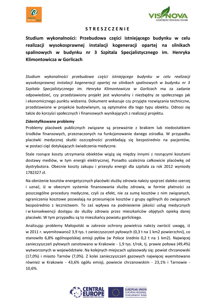 STRESZCZENIE Studium wykonalności: Przebudowa części istniejącego budynku w celu realizacji wysokosprawnej instalacji kogeneracji opartej na silnikach spalinowych w budynku nr 3 Szpitala Specjalistycznego im. Henryka Klimontowicza w Gorlicach Studium wykonalności przebudowa części istniejącego budynku w celu realizacji wysokosprawnej instalacji kogeneracji opartej na silnikach spalinowych w budynku nr 3 Szpitala Specjalistycznego im. Henryka Klimontowicza w Gorlicach ma za zadanie odpowiedzieć, czy przedstawiony projekt jest wykonalny i niezbędny ze społecznego jak i ekonomicznego punktu widzenia. Dokument wskazuje czy przyjęte rozwiązania techniczne, przedstawione w projekcie budowlanym, są optymalne dla tego typu obiektu. Odnosi się także do korzyści społecznych i finansowych wynikających z realizacji projektu. Zidentyfikowane problemy Problemy placówek publicznych związane są przeważnie z brakiem lub niedostatkiem środków finansowych, przeznaczonych na funkcjonowanie danego ośrodka. W przypadku placówki medycznej skutki oszczędności przekładają się bezpośrednio na pacjentów, w postaci cięć dotykających świadczenia medyczne. Stale rosnące koszty utrzymania obiektów wiążą się między innymi z rosnącymi kosztami dostawy mediów, w tym energii elektrycznej. Ponadto uzależnia całkowicie placówkę od dystrybutora. Obecnie koszty zakupu i przesyłu energii dla szpitala za rok 2012 wyniosły 1782327 zł. Na obniżenie kosztów energetycznych placówki służby zdrowia należy spojrzeć daleko szerzej i uznać, iż w obecnym systemie finansowania służby zdrowia, w formie płatności za poszczególne procedury medyczne, czyli za efekt, nie za sumę kosztów z nim związanych, ograniczenia kosztowe pozwalają na przesunięcie kosztów z grupy ogólnych do związanych bezpośrednio z lecznictwem. To zaś wpływa na podniesienie jakości usług medycznych i w konsekwencji dostępu do służby zdrowia przez mieszkańców objętych opieką danej placówki. W tym przypadku są to mieszkańcy powiatu gorlickiego. Analizując problemy Małopolski w zakresie ochrony powietrza należy zwrócić uwagę, iż w 2011 r. wyemitowano2 3,9 tys. t zanieczyszczeń pyłowych (0,3 t na 1 km2 powierzchni), co stanowiło 6,8% ogólnopolskiej emisji pyłów (w Polsce średnio 0,2 t na 1 km2). Najwięcej zanieczyszczeń pyłowych zanotowano w Krakowie - 1,9 tys. t/rok, tj. prawie połowa (49,4%) wytworzonych w województwie. Na kolejnych miejscach uplasowały się: powiat chrzanowski (17,0%) i miasto Tarnów (7,0%). Z kolei zanieczyszczeń gazowych najwięcej wyemitowano również w Krakowie - 43,6% ogółu emisji, powiecie chrzanowskim - 23,1% i Tarnowie 10,6%. Problem emisji zanieczyszczeń powstających z produkcji energii elektrycznej jest jednym z najpoważniejszych w skali całego kraju i dotyczy każdego wytwórcy i użytkownika. Tak zidentyfikowane problemy pozwoliły na określenie celu interwencji jako: Cel główny: Poprawa stanu środowiska przez zmniejszenia emisji zanieczyszczeń do powietrza atmosferycznego wskutek wykorzystania instalacji poligeneracji w systemie grzewczym i energetycznym Szpitala Specjalistycznego im. Klimontowicza w Gorlicach. Cele szczegółowe: Przekształcenie istniejącego sposobu zaopatrywania w energię cieplną budynku szpitala Specjalistycznego w Gorlicach z zastosowaniem instalacji poligeneracji, dla: zmniejszenia ilości szkodliwych gazów w atmosferze, w tym redukcji emisji CO2, redukcji kosztów funkcjonowania obiektu szpitala przez zmniejszenie wydatków na energię elektryczną, poprawy jakości środowiska naturalnego w Małopolsce i promowania działań ekologicznych przez instytucje publiczne. Na Studium wykonalności składają się następujące informacje: 1 CHARAKTERYSTYKA PROJEKTU: Tytuł, Lokalizacja projektu Analiza otoczenia społeczno-gospodarczego projektu: Obszary oddziaływania: bezpośredniego, społecznego, ekologicznego Analiza odbiorców Zidentyfikowane problemy Logika interwencji: Cele projektu - Oddziaływanie, Spójność projektu z dokumentami strategicznymi, Rezultaty/efekty realizacji Analiza instytucjonalna: Wykonalność instytucjonalna projektu, Status prawny beneficjenta, Trwałość projektu 2 ANALIZA TECHNICZNA I/LUB TECHNOLOGICZNA Opis stanu istniejącego przed modernizacją: dział techniczny, sprężarkownia (przed modernizacją), hydrofornia (przed modernizacją), garaż karetek (przed modernizacją) Zakres prac modernizacyjnych ww obiektów oraz tym modernizacja źródła ciepła 3 ANALIZA FINANSOWA Źródła finansowania inwestycji Prognozy finansowe: Założenia do prognoz, Prognoza aktywów, Prognoza pasywów, Prognoza rachunku zysków i strat, Prognoza przepływów pieniężnych, Rentowność inwestycji 4 PODSUMOWANIE I WNIOSKI Opracowanie zostało przygotowane ramach projektu VIS NOVA, realizowanego w Programie dla Europy Środkowej współfinansowanym ze środków UE - Europejskiego Funduszu Rozwoju Regionalnego. Publikacja odzwierciedla opinię autora, a Instytucja Zarządzająca i organy programowe nie ponoszą odpowiedzialności za żaden sposób wykorzystania informacji w niej zawartych.