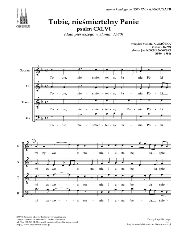 numer katalogowy: 157/XVI/A/0607/SATB Tobie, nieśmiertelny Panie psalm CXLVI (data pierwszego wydania: 1580) muzyka: Mikołaj GOMÓŁKA (1535? - 1609?) słowa: Jan KOCHANOWSKI (1530 - 1584) &b c ˙ Sopran To - &b c ˙ Alt Tenor Bas T B nie ˙ ˙. - œ œ œ. śmier - tel - ny œ ˙ b c V ˙ ˙. - śmier - tel - ny To - ?b c ˙ bie, ˙ nie ˙. - śmier - tel - ny To - bie, nie - śmier - tel - ny & b œ. ˙ Ŝy - wo - j œ œ. œ - Ŝy - wo - mi œ. Ŝy - wo - œ J ˙ - mi Ŝy - wo - - œ ˙ J - ta sta j œ œœ˙ mi . Vb œ œ ˙ - - œ œ ˙ œ œ œ ˙ nie, I - œ J œ sta - nie, I - ta sta - nie, I Pó œ ˙ - ki œ œ ki Pa - nie, Pó ˙ - ki Pó - ki œ ˙ œ œ œ - nie, œ œ œ œ œ œ œ œ - ta nie, - œ œ œ œ u - sta œ Pó bę I ˙ œ nie, œ - u - sta œ 2007 © Związek Chórów Kościelnych Caecilianum Zarząd Główny: ul. Dewajtis 3 , 01-815 Warszawa tel./fax: (22) 561 01 38 , e-mail: [email protected] http://www.caecilianum.webd.pl Pa œ œ œ œ sta - nie, œ ˙ Pa œ - ta œ œ œ Pa œ œ ˙ nie &b œ œ ?b bie, œ bie, mi A ˙. To - 5 S ˙ - œ. œ œ œ œ bę - œ œ œ œ u - sta bę œ. - u - sta bę - œ. dą - śpie - j œ œ - dą śpie - œ œ J œ œ J œ œ œ œ dą śpie - dą śpie - Do uŜytku publicznego. http://www.biblioteka.caecilianum.webd.pl psalm CXLVI - Mikołaj GOMÓŁKA S &b ˙ wa A T B &b œ œ œ œ œ œ œ œ œ œ œ 10 - ły, ˙ - œ œ œ œ œ œ œ œ œ œ œ œ wa - ły, I œ gą wa - ły, I gą wa ły, œ œ œ Vb ?b ˙ œ I I œ gą gą œ - słecz - ki œ mo - je œ œ U ˙ gra ˙ w - ły. U w œ mo - je œ - ły. œ gra - słecz - ki mo - je œ œ gra ˙ - ły. - słecz - ki mo - je gra - ły. - œ słecz - ki œ œ œ œ œ œ œ œ œ w œ œ œ U J J U w PSALM CXLVI Lauda, anima mea, Dominum 1. Tobie, nieśmiertelny Panie, Póki mi Ŝywota zstanie, I usta będą śpiewały, I gąsłeczki moje grały. 6. Który prawdy strzeŜe wiecznie, Krzywdy nie lubi koniecznie, Głodne chlebem opatruje, Więźnie z oków rozwięzuje. 2. Na króle się nie spuszczajcie, Śmiertelnemu nie ufajcie, Bo ten nie pomoŜe sobie Pogotowiu ani tobie. 7. Pan oczy zaszłe ciemnością Obdarza nową światłością, Pan niedołęŜnych ratuje, Pan sprawiedliwe miłuje. 3. Skoro duch wynidzie z ciała, Ziemia ziemię będzie brała, A nasze płonne nadzieje Po powietrzu dmą rozwieje. 8. Pan jest stróŜem przychodniowi, Pan sirotę i stan wdowi Ma na pieczy, TenŜe zgładzi, Co zły w głowie swej uradzi. 4. To człowiek prawie szczęśliwy, Komu sam Pan jest chętliwy; A on teŜ tylko jednemu Ufa Panu Bogu swemu. 9. Królestwo, syjońska skało, Twego króla będzie trwało, Póki słońce górolotne Poprowadzi lata wrotne. 5. Który piękne niebo sprawił I ziemię z morzem postawił, I cokolwiek ognistymi Świat obłapił mury swymi. -2- http://www.biblioteka.caecilianum.webd.pl