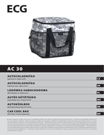 AC 30 AUTOCHLADNIČKA NÁVOD K OBSLUZE CZ AUTOCHLADNIČKA NÁVOD NA OBSLUHU SK LODÓWKA SAMOCHODOWA INSTRUKCJA OBSŁUGI PL AUTÓS HŰTŐTÁSKA HASZNÁLATI ÚTMUTATÓ HU AUTOKÜHLBOX BEDIENUNGSANLEITUNG DE CAR COOL BAG INSTRUCTION MANUAL Před uvedením výrobku do provozu si důkladně pročtěte tento návod a bezpečnostní pokyny, které jsou v tomto návodu obsaženy. Návod musí být vždy přiložen k přístroji. Pred uvedením výrobku do prevádzky si dôkladne prečítajte tento návod a bezpečnostné pokyny, ktoré sú v tomto návode obsiahnuté. Návod musí byť vždy priložený k prístroju. Przed pierwszym użyciem urządzenia prosimy o uważne zapoznanie się z instrukcjami dotyczącymi bezpieczeństwa i użytkowania. Instrukcja obsługi musi być zawsze dołączona. A termék használatba vétele előtt figyelmesen olvassa el ezt a használati útmutatót és az útmutatóban található biztonsági rendelkezéseket. A használati útmutatót tartsa a készülék közelében. Bitte lesen Sie vor der Inbetriebnahme des Produktes diese Anleitung und die darin enthaltenen Sicherheitshinweise aufmerksam durch. Die Bedienungsanleitung muss dem Gerät immer beigelegt sein. Always read the safety&use instructions carefully before using your appliance for the first time. The user´s manual must be always included. EN AUTOCHLADNIČKA BEZPEČNOSTNÍ POKYNY CZ Čtěte pozorně a uschovejte pro budoucí potřebu! Varování: Bezpečnostní opatření a pokyny uvedené v tomto návodu nezahrnují všechny možné podmínky a situace, ke kterým může dojít. Uživatel musí pochopit, že faktorem, který nelze zabudovat do žádného z výrobků, je zdravý rozum, opatrnost a péče. Tyto faktory tedy musí být zajištěny uživatelem/ uživateli používajícími a obsluhujícími toto zařízení. Neodpovídáme za škody způsobené během přepravy, nesprávným používáním, kolísáním napětí nebo změnou či úpravou jakékoliv části zařízení. Aby nedošlo ke vzniku požáru nebo k úrazu elektrickým proudem, měla by být při používání elektrických zařízení vždy dodržována základní opatření, včetně těch následujících: 1. 2. 3. 4. 5. 6. 7. 8. 9. 10. 11. 12. 13. 14. 15. Ujistěte se, že napětí ve vaší zásuvce odpovídá napětí uvedenému na štítku zařízení a že je zásuvka řádně uzemněná. Zásuvka musí být instalována podle platných bezpečnostních předpisů. Zařízení připojujte výhradně následovně: • přívodní kabel měniče napětí ECG MP 2030 připojujte do síťové zásuvky se stejným napětím (ECG MP 2030 není součástí balení). • přívodní kabel 12 V DC připojujte do zásuvky se stejným napětím odpovídajícího tvaru. Na lodích: Jestliže je přístroj zapojen do sítě, ujistěte se, že zdroj energie má proudový chránič.Nebezpečí úrazu! Nepoužívejte autochladničku, pokud je některý z přívodních kabelů poškozen. Veškeré opravy včetně výměny napájecího přívodu svěřte odbornému servisu! Nedemontujte ochranné kryty zařízení, hrozí nebezpečí úrazu elektrickým proudem! Chraňte spotřebič před přímým kontaktem s vodou a jinými tekutinami, ani na něj nestavte nádoby s tekutinami, aby nedošlo k případnému úrazu elektrickým proudem. Nikdy jej neponořujte do vody. Před použitím zařízení se přesvědčte, že přívodní kabel a jeho zástrčka jsou suché. Nedotýkejte se přívodního kabelu nebo přístroje mokrýma rukama. Hrozí nebezpečí úrazu elektrickým proudem! Přístroj je vhodný pro vnitřní použití a dočasné venkovní použití, ale musí být stále uchováván v suchu a vždy připojen ke zdroji napájení v interiéru. Zásuvku na 12 V DC (cigaretový zapalovač), ke které budete připojovat zástrčku, udržujte v čistotě, bez cigaretového popele. Při čištění zásuvky nepoužívejte kovové nebo jinak vodivé předměty. V automobilech, které umožňují napájet zařízení z 12V DC zásuvky bez zapnutého motoru, je důležité kontrolovat stav akumulátorů, aby nedošlo k jejich úplnému vybití. Nedovolte dětem, aby si s autochladničkou hrály. Tento přístroj není hračka! Dbejte zvýšené pozornosti, pokud používáte autochladničku v blízkosti dětí. Autochladničku neumisťujte v blízkosti otevřeného ohně nebo jiných zdrojů tepla (topení, přímé slunce atd.). Nebezpečí přehřátí! Máte-li dojem, že zařízení nefunguje správně, okamžitě jej odpojte od zdroje napětí a navštivte se spotřebičem servisní středisko. Nikdy nepřipojujte autochladničku současně oběma napájecími kabely! Vždy zvolte jen jeden druh napájení! (v případě, že jste si zakoupili i měnič napětí ECG MP 2030) Doporučujeme nenechávat autochladničku se zasunutým přívodním kabelem v zásuvce bez dozoru. Před údržbou vytáhněte přívodní kabel ze síťové zásuvky. Zástrčku nevytahujte ze zásuvky taháním za kabel. Kabel odpojte ze zásuvky uchopením za zástrčku. Přívodní kabel se nesmí dotýkat horkých částí ani vést přes ostré hrany. Autochladničku udržujte v dostatečné vzdálenosti od stěn a jiných objektů, protože musí být zajištěna cirkulace vzduchu. Nikdy neblokujte ventilační otvory autochladničky ani do nich nevkládejte žádné předměty. Na autochladničku nestoupejte ani na ni nic nestavte. Autochladničku nepoužívejte pro přepravu leptavých nebo rozpouštěcích látek. Potraviny skladujte pouze v originálních obalech nebo ve vhodných nádobách. Nenaplňujte vnitřek autochladničky ledem ani do ní nelijte tekutiny. 3 CZ 16. Používejte pouze příslušenství, které bylo schváleno výrobcem. Nepoužívejte žádné elektronické přístroje uvnitř autochladničky, pokud nejsou doporučeny výrobcem. 17. Používejte autochladničku pouze v souladu s pokyny uvedenými v tomto návodu. Tato autochl