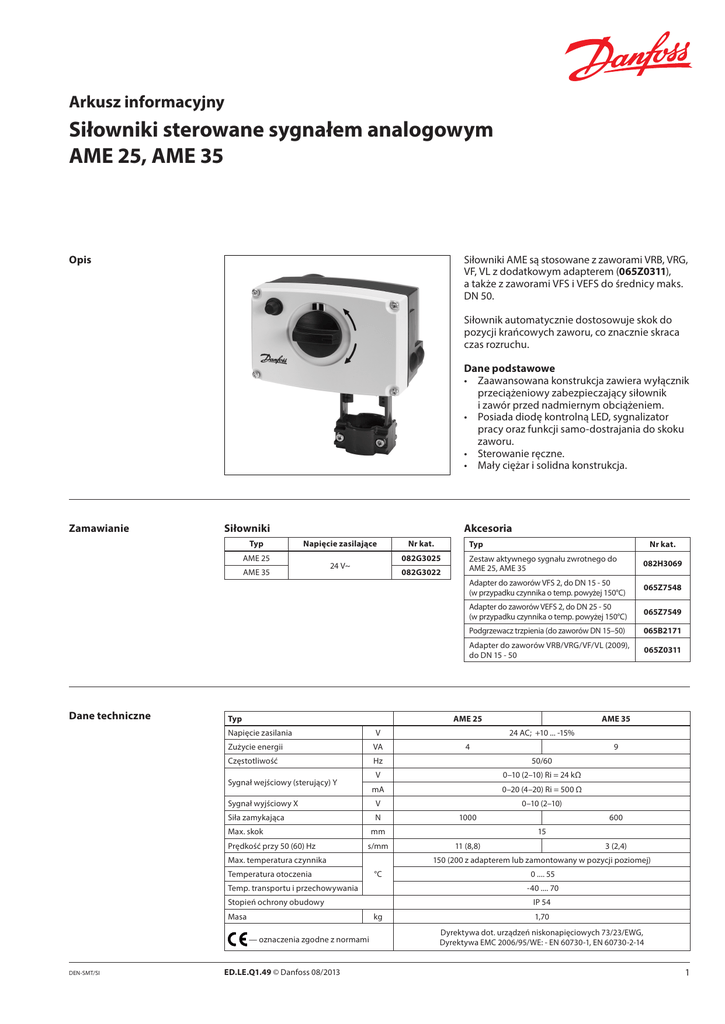 Arkusz informacyjny Siłowniki sterowane sygnałem analogowym AME 25, AME 35 Opis Siłowniki AME są stosowane z zaworami VRB, VRG, VF, VL z dodatkowym adapterem (065Z0311), a także z zaworami VFS i VEFS do średnicy maks. DN 50. Siłownik automatycznie dostosowuje skok do pozycji krańcowych zaworu, co znacznie skraca czas rozruchu. Dane podstawowe • Zaawansowana konstrukcja zawiera wyłącznik przeciążeniowy zabezpieczający siłownik i zawór przed nadmiernym obciążeniem. • Posiada diodę kontrolną LED, sygnalizator pracy oraz funkcji samo-dostrajania do skoku zaworu. • Sterowanie ręczne. • Mały ciężar i solidna konstrukcja. Zamawianie Siłowniki Typ Akcesoria Napięcie zasilające AME 25 AME 35 Dane techniczne Typ 082G3025 24 V~ 082G3022 Typ Nr kat. Zestaw aktywnego sygnału zwrotnego do AME 25, AME 35 082H3069 Adapter do zaworów VFS 2, do DN 15 - 50 (w przypadku czynnika o temp. powyżej 150°C) 065Z7548 Adapter do zaworów VEFS 2, do DN 25 - 50 (w przypadku czynnika o temp. powyżej 150°C) 065Z7549 Podgrzewacz trzpienia (do zaworów DN 15–50) 065B2171 Adapter do zaworów VRB/VRG/VF/VL (2009), do DN 15 - 50 065Z0311 AME 25 Napięcie zasilania V Zużycie energii VA Częstotliwość Hz Sygnał wejściowy (sterujący) Y 9 50/60 0–10 (2–10) Ri = 24 kΩ 0–20 (4–20) Ri = 500 Ω V N 0–10 (2–10) 1000 mm s/mm Max. temperatura czynnika Temperatura otoczenia °C 3 (2,4) 0 .... 55 IP 54 kg — oznaczenia zgodne z normami 11 (8,8) -40 .... 70 Stopień ochrony obudowy Masa 600 15 150 (200 z adapterem lub zamontowany w pozycji poziomej) Temp. transportu i przechowywania ED.LE.Q1.49 © Danfoss 08/2013 4 V Siła zamykająca Prędkość przy 50 (60) Hz AME 35 24 AC; +10 ... -15% mA Sygnał wyjściowy X Max. skok DEN-SMT/SI Nr kat. 1,70 Dyrektywa dot. urządzeń niskonapięciowych 73/23/EWG, Dyrektywa EMC 2006/95/WE: - EN 60730-1, EN 60730-2-14 1 Arkusz informacyjny Montaż Siłowniki sterowane sygnałem analogowym AME 25, AME 35 Tmax. ≤ 150°C w przypadku siłowników AME 25 i AME 35 Tmax. = od 150°C do 200°C w przypadku siłowników AME 25 i AME 35 Adapter do zaworu VFS, do DN 15 - 50 ≈5o Mechaniczny Siłownik powinien być zamontowany tak, aby trzpień zaworu był skierowany do góry lub poziomo. Do zamocowania siłownika używa się klucza imbusowego 4 mm (nie jest na wyposażeniu). Należy zostawić wolną przestrzeń wokół siłownika w celu swobodnego dostępu podczas prac serwisowych. ≈5o Elektryczny Podłączenia elektryczne są dostępne po zdjęciu pokrywy siłownika. W obudowie istnieją 2 przepusty kablowe M16 x 1,5. Jednak w przypadku potrzeby uzyskania właściwego stopnia ochrony obudowy IP należy zastosować odpowiednie dławiki kablowe. W czasie uruchomienia należy zaznaczyć czerwoną i niebieską zatyczką (na wyposażeniu) pozycje pełnego otwarcia i zamknięcia zaworu. Złomowanie Przed złomowaniem siłownik należy rozłożyć na części i posortować na różne grupy materiałowe. 2 ED.LE.Q1.49 © Danfoss 08/2013 DEN-SMT/SI Arkusz informacyjny Siłowniki sterowane sygnałem analogowym AME 25, AME 35 Ustawienie przełącznika DIP Pod otwieraną pokrywą siłownika znajdują się przełączniki DIP wyboru funkcji. Przykładowo ustawienie przełącznika SW6 na ZAŁ spowoduje, że będzie on pracował jako siłownik 3-punktowy. Przełączniki umożliwiają wybór następujących funkcji: • SW1: U/I — wybór rodzaju sygnału wejściowego: Jeśli ustawiony jest w pozycji WYŁ, wybrany jest sygnał wejściowy napięciowy. Jeśli ustawiony jest w pozycji ZAŁ, wybrany jest sygnał wejściowy prądowy. • SW2: 0/2 — wybór zakresu sygnału wejściowego: • SW6: Prop./3-pnt — wybór sygnału sterującego analogowego lub 3- punktowego: Jeśli ustawiony jest w pozycji WYŁ, siłownik sterowany jest sygnałem sterującym. Jeśli ustawiony jest w pozycji ZAŁ, siłownik sterowany jest sygnałem 3-punktowym. Więcej informacji na temat tego trybu działania znajduje się na stronie 4. (Podłączenie sterowania 3-punktowego). Przy ustawieniu przełącznika SW6 w pozycji ZAŁ pozostałe funkcje przełącznika DIP są nieaktywne. Jeśli ustawiony jest w pozycji WYŁ, sygnał wejściowy znajduje się w zakresie 2 - 10 V (sygnał napięciowy) lub w zakresie 4 - 20 mA (sygnał prądowy). Jeśli siłownik jest ustawiony w pozycji ZAŁ, sygnał wejściowy znajduje się w zakresie 0 - 10 V (sygnał napięciowy) lub 0 - 20 mA (sygnał prądowy). • SW7: LOG/LIN — wybór stało procentowej lub • SW3: D/I — wybór kierunku działania • SW8: 100% K siłownika (zgodny lub przeciwny): Jeśli ustawiony jest w pozycji WYŁ, siłownik pracuje w kierunku zgodnym (trzpień obniża się wraz ze wzrostem napięcia). Jeśli ustawiony jest w pozycji ZAŁ, siłownik pracuje w kierunku przeciwnym (trzpień podnosi się do góry kiedy wzrasta wartość napięcia). • SW4: —/Seq. — wybór pracy w trybie normalnym lub sekwencyjnym: Jeśli ustawiony jest w pozycji WYŁ, siłownik pracuje w zakresie 0(2) - 10 V lub 0(4) - 20 mA. Jeśli siłownik jest ustawiony w pozycji ZAŁ, pracuje w trybie sekwencyjnym w zakresie 0(2) - 5(6) V lub 0(4) - 10(12) mA albo 5(6) - 10 V lub 10(12) - 20 mA. • SW5: 0 - 5 V / 5 - 10 V — zakres sygnału liniowej charakterystyki przepływu przez zawór1: Jeśli ustawiony jest w pozycji WYŁ, przepływ przez zawór ma charakterystykę stałoprocentową. Jeśli ustawiony jest w pozycji ZAŁ, przepływ przez zawór ma charakterystykę liniową w odniesieniu do sygnału sterującego. VS/Reduced K VS — redukcja przepływu przez zawór1: Jeśli ustawiony jest w pozycji WYŁ, przepływ przez zawór nie jest zredukowany. Jeśli siłownik jest ustawiony w pozycji ZAŁ, przepływ przez zawór zostaje zredukowany o połowę narastających standardowych wartości K VS (przykładowo maksymalny przepływ na zaworze, gdzie K VS = 16 a SW8 jest ustawiony w pozycji ZAŁ, wynosi K VS = 13 (wartość środkowa pomiędzy KVS = 16 a KVS = 10)
