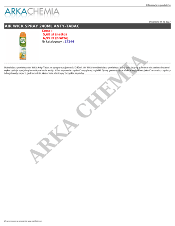 Informacje o produkcie Utworzono 04-03-2017 AIR WICK SPRAY 240ML ANTY-TABAC Cena : 5,68 zł (netto) 6,99 zł (brutto) IA Nr katalogowy : 17246 AR K A C H EM Odświeżacz powietrza Air Wick Anty-Tabac w sprayu o pojemności 240ml. Air Wick to odświeżacz powietrza, który jako jedyny w Polsce nie zawiera butanu i wykorzystuje specjalną formułę na bazie wody, która zapewnia czystość rozpylanej mgiełki. Spray gwarantuje w efekcie wyjątkową jakość aromatu, czystszy i długotrwały zapach, jednocześnie skutecznie eliminując brzydkie zapachy. Wygenerowano w programie www.oscGold.com