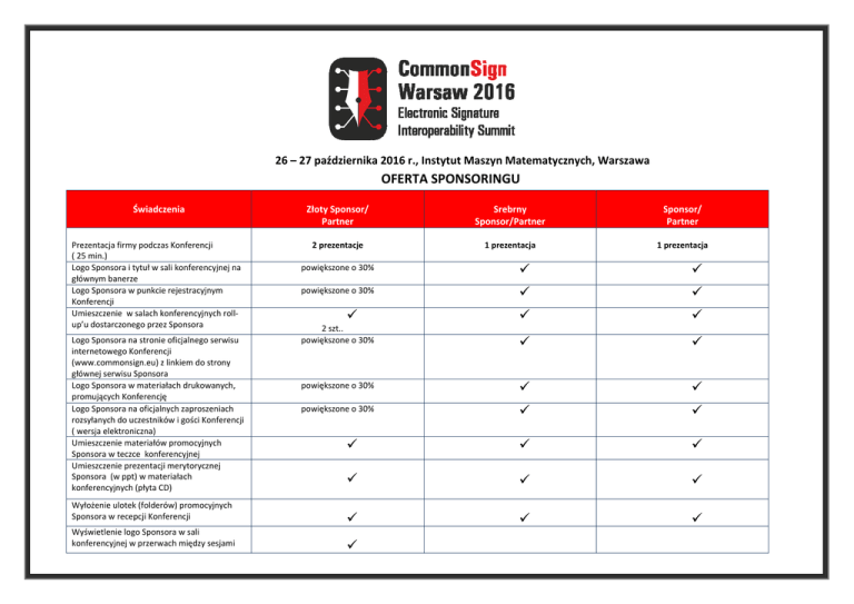 26 – 27 października 2016 r., Instytut Maszyn Matematycznych, Warszawa OFERTA SPONSORINGU Świadczenia Złoty Sponsor/ Partner Srebrny Sponsor/Partner Sponsor/ Partner Prezentacja firmy podczas Konferencji ( 25 min.) Logo Sponsora i tytuł w sali konferencyjnej na głównym banerze Logo Sponsora w punkcie rejestracyjnym Konferencji Umieszczenie w salach konferencyjnych roll‐ up’u dostarczonego przez Sponsora 2 prezentacje 1 prezentacja 1 prezentacja Logo Sponsora na stronie oficjalnego serwisu internetowego Konferencji (www.commonsign.eu) z linkiem do strony głównej serwisu Sponsora Logo Sponsora w materiałach drukowanych, promujących Konferencję Logo Sponsora na oficjalnych zaproszeniach rozsyłanych do uczestników i gości Konferencji ( wersja elektroniczna) Umieszczenie materiałów promocyjnych Sponsora w teczce konferencyjnej Umieszczenie prezentacji merytorycznej Sponsora (w ppt) w materiałach konferencyjnych (płyta CD) powiększone o 30% powiększone o 30% 2 szt.. powiększone o 30% powiększone o 30% powiększone o 30% Wyłożenie ulotek (folderów) promocyjnych Sponsora w recepcji Konferencji Wyświetlenie logo Sponsora w sali konferencyjnej w przerwach między sesjami Udostępnienie Sponsorowi miejsca w holu Konferencji na stoisko (własną ściankę reklamową) Zamieszczenie informacji o firmie Sponsora (maksimum 3 slajdy) w promocyjnej części materiałów konferencyjnych ( płyta CD) Przekazanie Sponsorowi bezpłatnych zaproszeń na udział w 2‐dniowej Konferencji Umożliwienie przekazania toreb / teczek z logo Sponsora uczestnikom Konferencji oraz umieszczenia w nich własnych notesów i długopisów lub innych upominków z logo Sponsora Cena netto* *+ 23 % VAT 6 m2 4 m2 6 szt. 4 szt. 2 szt. 15.000 zł* 10.000 zł* 6.000 zł* UWAGA: Rabat 10% za zgłoszenie i dokonanie wpłaty do 5 września 2016 r.