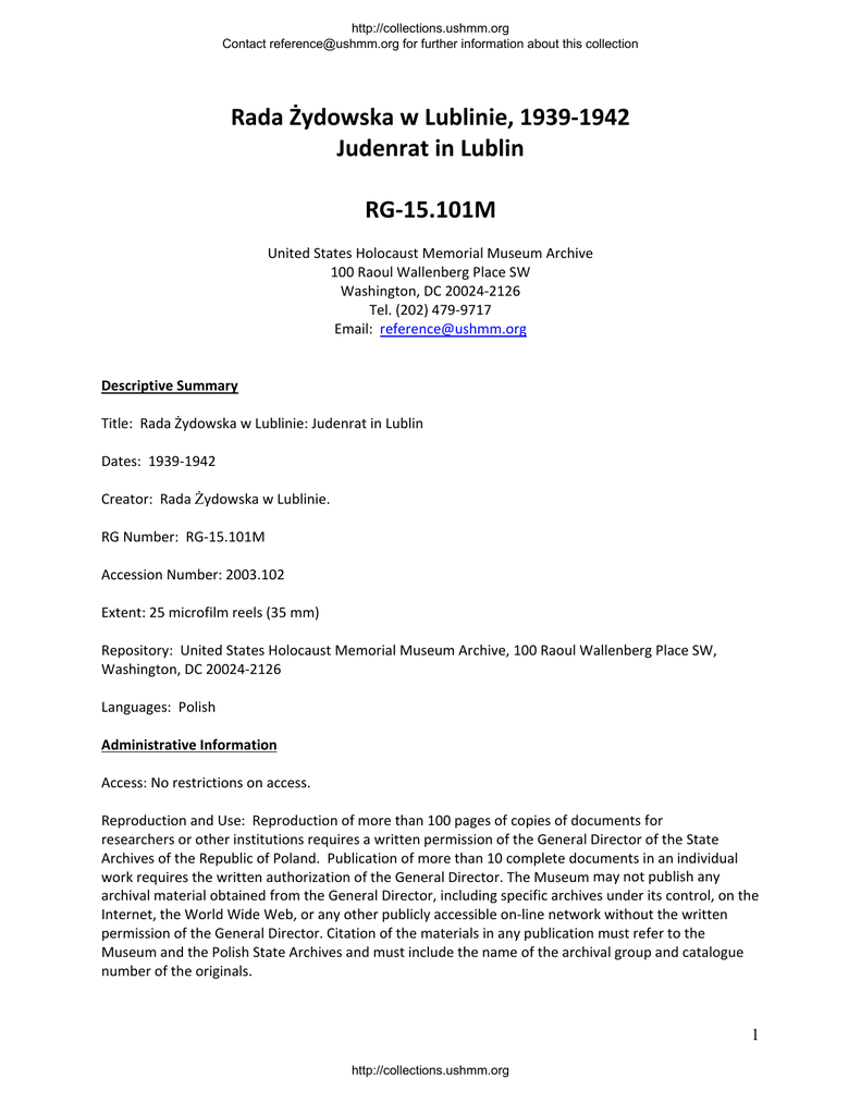 http://collections.ushmm.org Contact [email protected] for further information about this collection Rada Żydowska w Lublinie, 1939‐1942 Judenrat in Lublin RG‐15.101M United States Holocaust Memorial Museum Archive 100 Raoul Wallenberg Place SW Washington, DC 20024‐2126 Tel. (202) 479‐9717 Email: [email protected] Descriptive Summary Title: Rada Żydowska w Lublinie: Judenrat in Lublin Dates: 1939‐1942 Creator: Rada Żydowska w Lublinie. RG Number: RG‐15.101M Accession Number: 2003.102 Extent: 25 microfilm reels (35 mm) Repository: United States Holocaust Memorial Museum Archive, 100 Raoul Wallenberg Place SW, Washington, DC 20024‐2126 Languages: Polish Administrative Information Access: No restrictions on access. Reproduction and Use: Reproduction of more than 100 pages of copies of documents for researchers or other institutions requires a written permission of the General Director of the State Archives of the Republic of Poland. Publication of more than 10 complete documents in an individual work requires the written authorization of the General Director. The Museum may not publish any archival material obtained from the General Director, including specific archives under its control, on the Internet, the World Wide Web, or any other publicly accessible on‐line network without the written permission of the General Director. Citation of the materials in any publication must refer to the Museum and the Polish State Archives and must include the name of the archival group and catalogue number of the originals. 1 http://collections.ushmm.org http://collections.ushmm.org Contact [email protected] for further information about this collection To request written permission, contact the General Director, Naczelna Dyrekcja Archiwów Państwowych, ul. Rakowiecka 2D, 02‐517 Warsaw, Poland, Attention: General Director Preferred Citation: RG‐15.101M, Rada Żydowska w Lublinie, 1939‐1942. United States Holocaust Memorial Museum Archives, Washington DC., and Archiwum Państwowe w Lublinie, Poland. Acquisition Information: Purchased from the Archiwum Państwowe w Lublinie, Poland. Forms part of the Claims Conference International Holocaust Documentation Archive at the United States Holocaust Memorial Museum. This archive consists of documentation whose reproduction and/or acquisition was made possible with funding from the Conference on Jewish Material Claims Against Germany. Accruals: Accruals may have been received since this collection was first processed, see the Archives catalog at collections.ushmm.org for further information. Custodial History Existence and Location of Originals: The original records are held by the Archiwum Państwowe w Lublinie, ul Jezuicka 13, Lublin, Poland. Tel. 011 48 81 532 80 72. More information about this repository can be found at www.lublin.ap.gov.pl. Processing History: Aleksandra B. Borecka Scope and Content of Collection Collection contains minutes of Jewish council meetings, memoranda and announcements of departments, and correspondence between Judenrat and German authorities. Includes documents related to the labor camps in Lublin, Poland, at Lipowa Street, in Bełżec, and in Cieszanów in 1940; name lists of inhabitants of the ghetto in Lublin (in Podzamcze) and of the ghetto in Majdan Tatarski, Poland; name lists of German Jews deported from Szczecin, Poland, to District of Lublin in 1941, and name lists of Jews from Vienna, Austria, deported in 1941; also includes documents related to Jewish property in Lublin. System of Arrangement The system of arrangement of the source repository has been preserved in the microfilmed reels. Indexing Terms World War, 1939‐1945‐‐Concentration camps‐‐Poland‐‐Lublin. World War, 1939‐1945‐‐Atrocities‐‐Poland‐‐History‐‐20th century. Jews‐‐Legal status, laws, etc.‐‐Poland‐‐20th century‐‐Registers. Holocaust, Jewish (1939‐1945)‐‐Poland. Jewish councils‐‐Poland‐‐Lublin. Jewish property‐‐Poland‐‐Lublin. Jewish ghettos‐‐Poland‐ Lublin. Jews, German‐‐Poland‐‐Lublin‐‐Registers. Jews, Austrian‐‐Poland‐‐Lublin‐‐Registers. Lublin (Poland)‐‐History‐‐20th century. 2 http://collections.ushmm.org http://collections.ushmm.org Contact [email protected] for further information about this collection Correspondence. Minutes. Reports. Registers. CONTAINER LIST Reel List: Files organized in the following order: Reel 1: File 1‐5; Reel 2: File 5‐9; Reel 3: File 9‐14; Reel 4: File 15‐ 20; Reel 5: File 21‐28; Reel 6: File 29‐40; Reel 7: File 41‐54; Reel 8: File 54‐58; Reel 10: File 65‐73; Reel 11: File 73‐78; Reel 12: File 78‐80; Reel 13: File 80‐83; Reel 14: File 83‐85; Reel 15: File 85‐88; Reel 16: File 88‐92; Reel 17: File 92‐94; Reel 18: File 95‐100; Reel 19: File: 100‐115; Reel 20: File 115‐120; Reel 21: File 120‐129; Reel 22: File 129‐144; Reel 23: File 145‐159; Reel 24: File 159‐166; Reel 25: File 167‐183. Note: Inventory compailed by the Archiwum Państwowe w Lublinie, Poland. Zespół Rada Żydowska w Lublinie 1939‐1942 Reel Description 1 1 – Regulaminy Rady, wykazy radnych i zakres ich czynności urzędowych 1940‐41 2 – Różne zarządznia, okólniki i zgłoszenia władz niemieckich i rady 1939‐1942 3 – Protokoły plenarnych posiedzeń Rady Żydowskiej w Lublinie od 1 stycznia 1940 r. do 1 listopada 1942 r.; 1940‐1942 4 – /odpisy protokołów z teczki nr. 3/ 5 ‐ /koncepty protokołów posiedzeń z teczki nr. 3/ 2 5 ‐ /koncepty protokołów posiedzeń z teczki nr. 3/ (con’t) 6 – Sprawozdania wydziałów 1939‐1942 7 – Materiały do rocznego sprawozdania Rady Żydowskiej za okres od 1 września 1939 do 1 września 1940 r. 8 – Sprawozdanie z działalności Rady za okres od 1 września 1939 r. do 1 września 1940 r. 9 – Akta osobiste dr. Marka Altena – prezesa Rady: notatki, koncepty pism, terminarze zajęć itp., 1941‐1942 3 9 – Ak