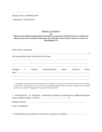………………………………………………………………… pieczęć, nazwa i dokładny adres wykonawcy/ wykonawców OFERTA CENOWA na Opracowanie dokumentacji projektowej budowy zewnętrznej windy towarowej o nośności do 400 kg na potrzeby transportu dekoracji przy budynku Teatru Lalki i Aktora w Łomży, pl. Niepodległości 14. Ja/My (imię i nazwisko) …………………………………………………………………………………………………..j ako upoważniony/nieni przedstawiciel/e firmy …………………………………………………………………………………………………. …………………………………………………………………………………………………. ……………………………………………………………………………………….…………. działając w imieniu reprezentowanej przeze mnie/nas firmy/ firm*:............................................................................................................................................. ....................................................................................................................................................... ..................................................................................................................................................... * - w przypadku składania oferty indywidualnie (przez jednego wykonawcę) należy podać ponownie nazwę firmy wymienionej w poprzednim wierszu, natomiast w przypadku składania oferty wspólnej - należy podać wszystkich wykonawców wspólnie ubiegających się o udzielenie zamówienia. 1. Oświadczam/y, że oferujemy wykonanie przedmiotu zamówienia za całkowitą (łączną) cenę ryczałtową brutto w kwocie: ………………………………… zł Słownie złotych …………………………………………………………………………. (wraz z podatkiem) 2. Oświadczamy, że przedmiot zamówienia wykonamy w terminie ………………………. 3. Oświadczam/y, że uważamy się za związanych niniejszą ofertą przez okres 30 dni od upływu terminu do składania ofert. 4. Oświadczam/y, że spełniamy warunki udziału w powyższym postępowaniu i w załączniku przedkładamy wykaz osób realizujących powyższe zamówienie wraz z posiadanymi uprawnieniami. 5. Oświadczam/y, że zapoznaliśmy się z warunkami zamówienia i przyjmujemy je bez zastrzeżeń. ............................................................ ................................................................ Miejscowość/data podpis/y osoby/osób upoważnionej/nych do reprezentowania wykonawcy/ców