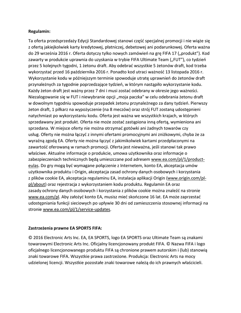 Regulamin: Ta oferta przedsprzedaży Edycji Standardowej stanowi część specjalnej promocji i nie wiąże się z ofertą jakiejkolwiek karty kredytowej, płatniczej, debetowej ani podarunkowej. Oferta ważna do 29 września 2016 r. Oferta dotyczy tylko nowych zamówień na grę FIFA 17 („produkt”). Kod zawarty w produkcie uprawnia do uzyskania w trybie FIFA Ultimate Team („FUT”), co tydzień przez 5 kolejnych tygodni, 1 żetonu draft. Aby odebrać wszystkie 5 żetonów draft, kod trzeba wykorzystać przed 16 października 2016 r. Ponadto kod utraci ważność 13 listopada 2016 r. Wykorzystanie kodu w późniejszym terminie spowoduje utratę uprawnień do żetonów draft przynależnych za tygodnie poprzedzające tydzień, w którym nastąpiło wykorzystanie kodu. Każdy żeton draft jest ważny przez 7 dni i musi zostać odebrany w okresie jego ważności. Niezalogowanie się w FUT i niewybranie opcji „moja paczka” w celu odebrania żetonu draft w dowolnym tygodniu spowoduje przepadek żetonu przynależnego za dany tydzień. Pierwszy żeton draft, 1 piłkarz na wypożyczenie (na 8 meczów) oraz strój FUT zostaną udostępnieni natychmiast po wykorzystaniu kodu. Oferta jest ważna we wszystkich krajach, w których sprzedawany jest produkt. Oferta nie może zostać zastąpiona inną ofertą, wymieniona ani sprzedana. W miejsce oferty nie można otrzymać gotówki ani żadnych towarów czy usług. Oferty nie można łączyć z innymi ofertami promocyjnymi ani zniżkowymi, chyba że za wyraźną zgodą EA. Oferty nie można łączyć z jakimikolwiek kartami przedpłaconymi na zawartość oferowaną w ramach promocji. Oferta jest nieważna, jeśli stanowi tak prawo właściwe. Aktualne informacje o produkcie, umowa użytkownika oraz informacje o zabezpieczeniach technicznych będą umieszczane pod adresem www.ea.com/pl/1/producteulas. Do gry mogą być wymagane połączenie z Internetem, konto EA, akceptacja umów użytkownika produktu i Origin, akceptacja zasad ochrony danych osobowych i korzystania z plików cookie EA, akceptacja regulaminu EA, instalacja aplikacji Origin (www.origin.com/plpl/about) oraz rejestracja z wykorzystaniem kodu produktu. Regulamin EA oraz zasady ochrony danych osobowych i korzystania z plików cookie można znaleźć na stronie www.ea.com/pl. Aby założyć konto EA, musisz mieć skończone 16 lat. EA może zaprzestać udostępniania funkcji sieciowych po upływie 30 dni od zamieszczenia stosownej informacji na stronie www.ea.com/pl/1/service-updates. Zastrzeżenia prawne EA SPORTS FIFA: © 2016 Electronic Arts Inc. EA, EA SPORTS, logo EA SPORTS oraz Ultimate Team są znakami towarowymi Electronic Arts Inc. Oficjalny licencjonowany produkt FIFA. © Nazwa FIFA i logo oficjalnego licencjonowanego produktu FIFA są chronione prawem autorskim i (lub) stanowią znaki towarowe FIFA. Wszystkie prawa zastrzeżone. Produkcja: Electronic Arts na mocy udzielonej licencji. Wszystkie pozostałe znaki towarowe należą do ich prawnych właścicieli.