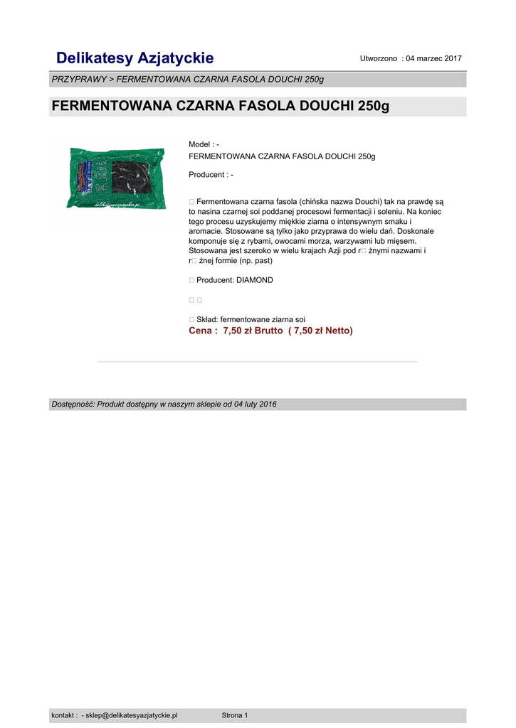 Delikatesy Azjatyckie Utworzono : 04 marzec 2017 PRZYPRAWY > FERMENTOWANA CZARNA FASOLA DOUCHI 250g FERMENTOWANA CZARNA FASOLA DOUCHI 250g Model : FERMENTOWANA CZARNA FASOLA DOUCHI 250g Producent : Fermentowana czarna fasola (chińska nazwa Douchi) tak na prawdę są to nasina czarnej soi poddanej procesowi fermentacji i soleniu. Na koniec tego procesu uzyskujemy miękkie ziarna o intensywnym smaku i aromacie. Stosowane są tylko jako przyprawa do wielu dań. Doskonale komponuje się z rybami, owocami morza, warzywami lub mięsem. Stosowana jest szeroko w wielu krajach Azji pod r�żnymi nazwami i r�żnej formie (np. past) Producent: DIAMOND � Skład: fermentowane ziarna soi Cena : 7,50 zł Brutto ( 7,50 zł Netto) Dostępność: Produkt dostępny w naszym sklepie od 04 luty 2016 kontakt : - [email protected] Strona 1