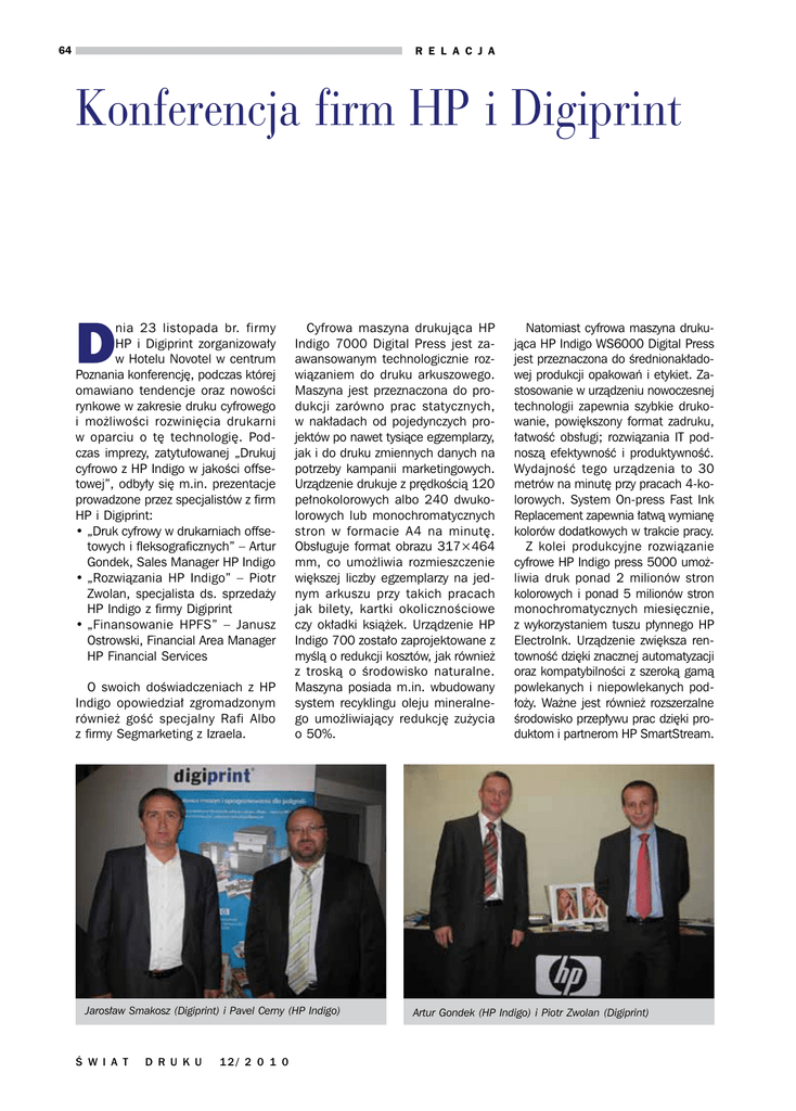 R EL A C J A 64 Konferencja firm HP i Digiprint D nia 23 listopada br. firmy HP i Digiprint zorganizowały w Hotelu Novotel w centrum Poznania konferencję, podczas której omawiano tendencje oraz nowości rynkowe w zakresie druku cyfrowego i możliwości rozwinięcia drukarni w oparciu o tę technologię. Podczas imprezy, zatytułowanej „Drukuj cyfrowo z HP Indigo w jakości offsetowej”, odbyły się m.in. prezentacje prowadzone przez specjalistów z firm HP i Digiprint: •„Druk cyfrowy w drukarniach offsetowych i fleksograficznych” – Artur Gondek, Sales Manager HP Indigo •„Rozwiązania HP Indigo” – Piotr Zwolan, specjalista ds. sprzedaży HP Indigo z firmy Digiprint •„Finansowanie HPFS” – Janusz Ostrowski, Financial Area Manager HP Financial Services O swoich doświadczeniach z HP Indigo opowiedział zgromadzonym również gość specjalny Rafi Albo z firmy Segmarketing z Izraela. Cyfrowa maszyna drukująca HP Indigo 7000 Digital Press jest zaawansowanym technologicznie rozwiązaniem do druku arkuszowego. Maszyna jest przeznaczona do produkcji zarówno prac statycznych, w nakładach od pojedynczych projektów po nawet tysiące egzemplarzy, jak i do druku zmiennych danych na potrzeby kampanii marketingowych. Urządzenie drukuje z prędkością 120 pełnokolorowych albo 240 dwukolorowych lub monochromatycznych stron w formacie A4 na minutę. Obsługuje format obrazu 317×464 mm, co umożliwia rozmieszczenie większej liczby egzemplarzy na jednym arkuszu przy takich pracach jak bilety, kartki okolicznościowe czy okładki książek. Urządzenie HP Indigo 700 zostało zaprojektowane z myślą o redukcji kosztów, jak również z troską o środowisko naturalne. Maszyna posiada m.in. wbudowany system recyklingu oleju mineralnego umożliwiający redukcję zużycia o 50%. Jarosław Smakosz (Digiprint) i Pavel Cerny (HP Indigo) ś W I A T D R U K U 12/ 2 0 1 0 Natomiast cyfrowa maszyna drukująca HP Indigo WS6000 Digital Press jest przeznaczona do średnionakładowej produkcji opakowań i etykiet. Zastosowanie w urządzeniu nowoczesnej technologii zapewnia szybkie drukowanie, powiększony format zadruku, łatwość obsługi; rozwiązania IT podnoszą efektywność i produktywność. Wydajność tego urządzenia to 30 metrów na minutę przy pracach 4-kolorowych. System On-press Fast Ink Replacement zapewnia łatwą wymianę kolorów dodatkowych w trakcie pracy. Z kolei produkcyjne rozwiązanie cyfrowe HP Indigo press 5000 umożliwia druk ponad 2 milionów stron kolorowych i ponad 5 milionów stron monochromatycznych miesięcznie, z wykorzystaniem tuszu płynnego HP ElectroInk. Urządzenie zwiększa rentowność dzięki znacznej automatyzacji oraz kompatybilności z szeroką gamą powlekanych i niepowlekanych podłoży. Ważne jest również rozszerzalne środowisko przepływu prac dzięki produktom i partnerom HP SmartStream. Artur Gondek (HP Indigo) i Piotr Zwolan (Digiprint)