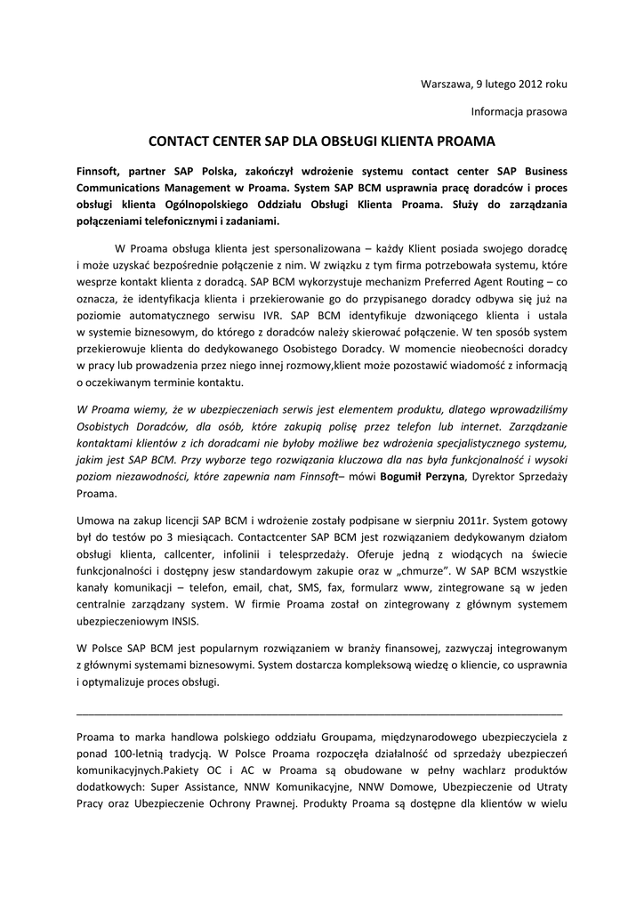Warszawa, 9 lutego 2012 roku Informacja prasowa CONTACT CENTER SAP DLA OBSŁUGI KLIENTA PROAMA Finnsoft, partner SAP Polska, zakończył wdrożenie systemu contact center SAP Business Communications Management w Proama. System SAP BCM usprawnia pracę doradców i proces obsługi klienta Ogólnopolskiego Oddziału Obsługi Klienta Proama. Służy do zarządzania połączeniami telefonicznymi i zadaniami. W Proama obsługa klienta jest spersonalizowana – każdy Klient posiada swojego doradcę i może uzyskać bezpośrednie połączenie z nim. W związku z tym firma potrzebowała systemu, które wesprze kontakt klienta z doradcą. SAP BCM wykorzystuje mechanizm Preferred Agent Routing – co oznacza, że identyfikacja klienta i przekierowanie go do przypisanego doradcy odbywa się już na poziomie automatycznego serwisu IVR. SAP BCM identyfikuje dzwoniącego klienta i ustala w systemie biznesowym, do którego z doradców należy skierować połączenie. W ten sposób system przekierowuje klienta do dedykowanego Osobistego Doradcy. W momencie nieobecności doradcy w pracy lub prowadzenia przez niego innej rozmowy,klient może pozostawić wiadomość z informacją o oczekiwanym terminie kontaktu. W Proama wiemy, że w ubezpieczeniach serwis jest elementem produktu, dlatego wprowadziliśmy Osobistych Doradców, dla osób, które zakupią polisę przez telefon lub internet. Zarządzanie kontaktami klientów z ich doradcami nie byłoby możliwe bez wdrożenia specjalistycznego systemu, jakim jest SAP BCM. Przy wyborze tego rozwiązania kluczowa dla nas była funkcjonalność i wysoki poziom niezawodności, które zapewnia nam Finnsoft– mówi Bogumił Perzyna, Dyrektor Sprzedaży Proama. Umowa na zakup licencji SAP BCM i wdrożenie zostały podpisane w sierpniu 2011r. System gotowy był do testów po 3 miesiącach. Contactcenter SAP BCM jest rozwiązaniem dedykowanym działom obsługi klienta, callcenter, infolinii i telesprzedaży. Oferuje jedną z wiodących na świecie funkcjonalności i dostępny jesw standardowym zakupie oraz w „chmurze”. W SAP BCM wszystkie kanały komunikacji – telefon, email, chat, SMS, fax, formularz www, zintegrowane są w jeden centralnie zarządzany system. W firmie Proama został on zintegrowany z głównym systemem ubezpieczeniowym INSIS. W Polsce SAP BCM jest popularnym rozwiązaniem w branży finansowej, zazwyczaj integrowanym z głównymi systemami biznesowymi. System dostarcza kompleksową wiedzę o kliencie, co usprawnia i optymalizuje proces obsługi. __________________________________________________________________________________ Proama to marka handlowa polskiego oddziału Groupama, międzynarodowego ubezpieczyciela z ponad 100-letnią tradycją. W Polsce Proama rozpoczęła działalność od sprzedaży ubezpieczeń komunikacyjnych.Pakiety OC i AC w Proama są obudowane w pełny wachlarz produktów dodatkowych: Super Assistance, NNW Komunikacyjne, NNW Domowe, Ubezpieczenie od Utraty Pracy oraz Ubezpieczenie Ochrony Prawnej. Produkty Proama są dostępne dla klientów w wielu kanałach: internet, telefon oraz multiagencje. Firma zamierza również wykorzystać w Polsce swoje wieloletnie doświadczenie w zakresie bancassurance.