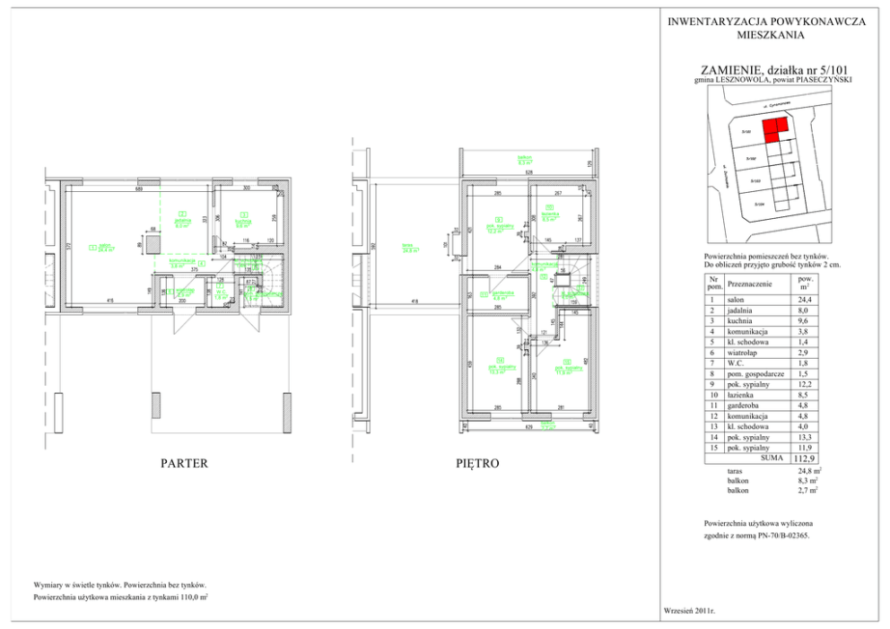 INWENTARYZACJA POWYKONAWCZA MIESZKANIA ZAMIENIE, działka nr 5/101 gmina LESZNOWOLA, powiat PIASECZYŃSKI balkon 8,3 m 2 2 jadalnia 8,0 m2 3 kuchnia 9,6 m 2 salon 1 24,4 m 2 9 pok. sypialny 12,2 m 2 10 łazienka 8,5 m 2 taras 24,8 m 2 komunikacja 3,8 m 2 6 kl. schodowa 1,4m 2 5 4 wiatrołap 2,9 m2 7 W.C. 1,8 m2 8 pom. gospodarcze 1,5 m2 11 13 kl. schodowa 2 4,0 m garderoba 4,8 m 2 14 pok. sypialny 13,3 m 2 15 pok. sypialny 11,9 m 2 balkon 2,7 m 2 PARTER Powierzchnia pomieszczeń bez tynków. Do obliczeń przyjęto grubość tynków 2 cm. komunikacja 4,8 m 2 12 Nr pom. Przeznaczenie 1 2 3 4 5 6 7 8 9 10 11 12 13 14 15 PIĘTRO salon jadalnia kuchnia komunikacja kl. schodowa wiatrołap W.C. pom. gospodarcze pok. sypialny łazienka garderoba komunikacja kl. schodowa pok. sypialny pok. sypialny SUMA taras balkon balkon pow. m2 24,4 8,0 9,6 3,8 1,4 2,9 1,8 1,5 12,2 8,5 4,8 4,8 4,0 13,3 11,9 112,9 24,8 m2 8,3 m2 2,7 m2 Powierzchnia użytkowa wyliczona zgodnie z normą PN-70/B-02365. Wymiary w świetle tynków. Powierzchnia bez tynków. Powierzchnia użytkowa mieszkania z tynkami 110,0 m2 Wrzesień 2011r.