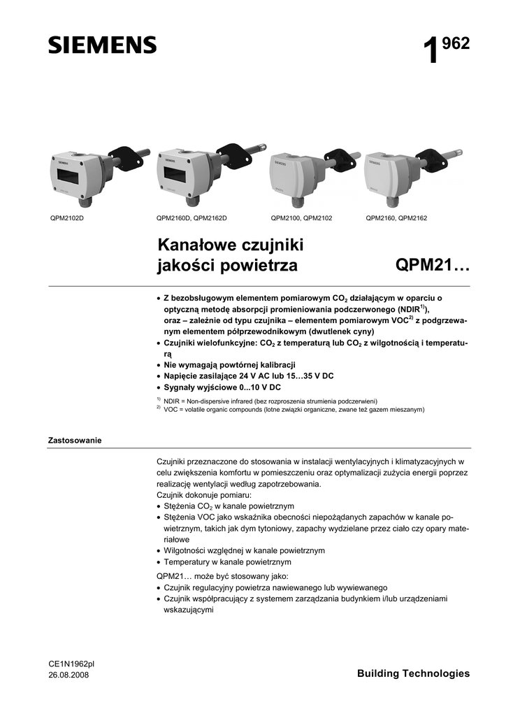 1 962 QPM2102D QPM2160D, QPM2162D QPM2100, QPM2102 Kanałowe czujniki jakości powietrza QPM2160, QPM2162 QPM21… • Z bezobsługowym elementem pomiarowym CO2 działającym w oparciu o optyczną metodę absorpcji promieniowania podczerwonego (NDIR1)), oraz – zależnie od typu czujnika – elementem pomiarowym VOC2) z podgrzewanym elementem półprzewodnikowym (dwutlenek cyny) • Czujniki wielofunkcyjne: CO2 z temperaturą lub CO2 z wilgotnością i temperaturą • Nie wymagają powtórnej kalibracji • Napięcie zasilające 24 V AC lub 15…35 V DC • Sygnały wyjściowe 0...10 V DC 1) 2) NDIR = Non-dispersive infrared (bez rozproszenia strumienia podczerwieni) VOC = volatile organic compounds (lotne związki organiczne, zwane też gazem mieszanym) Zastosowanie Czujniki przeznaczone do stosowania w instalacji wentylacyjnych i klimatyzacyjnych w celu zwiększenia komfortu w pomieszczeniu oraz optymalizacji zużycia energii poprzez realizację wentylacji według zapotrzebowania. Czujnik dokonuje pomiaru: • Stężenia CO2 w kanale powietrznym • Stężenia VOC jako wskaźnika obecności niepożądanych zapachów w kanale powietrznym, takich jak dym tytoniowy, zapachy wydzielane przez ciało czy opary materiałowe • Wilgotności względnej w kanale powietrznym • Temperatury w kanale powietrznym QPM21… może być stosowany jako: • Czujnik regulacyjny powietrza nawiewanego lub wywiewanego • Czujnik współpracujący z systemem zarządzania budynkiem i/lub urządzeniami wskazującymi CE1N1962pl 26.08.2008 Building Technologies Typowe zastosowanie: • Pomiar stężeń CO2 i VOC: W instalacjach wentylacyjnych pomieszczeń przyjęć towarzyskich, holi i poczekalni, hal i sal targowych lub wystawienniczych, restauracji, stołówek, centrów handlowych, sal gimnastycznych, pomieszczeń handlowych i sal konferencyjnych • Pomiar stężenia CO2: W instalacjach wentylacyjnych pomieszczeń objętych zakazem palenia tytoniu o zmiennej liczbie przebywających osób, takich jak muzea, teatry, kina, audytoria, widownie, pomieszczenia biurowe i sale szkolne Uwaga! • Czujniki QPM21… nie mogą być stosowane jako urządzenia gwarantujące bezpieczeństwo, jak np. urządzenia ostrzegające o obecności gazu lub dymu! • Czujniki nie mogą być stosowane na zewnątrz pomieszczeń! Zestawienie typów Oznaczenie typu Zakres pomiaru CO2 Czułość VOC Zakres pomiaru temperatury Zakres pomiaru wilgotności Wskazanie wartości pomiar. QPM2100 0…2000 ppm — — — — QPM2102 0…2000 ppm niska (R1) normalna (R2) wysoka (R3) — — — QPM2102D 0…2000 ppm niska (R1) normalna (R2) wysoka (R3) — — tak QPM2160 0…2000 ppm — 0...50 °C / −35...+35 °C — — QPM2160D 0…2000 ppm — 0...50 °C / −35...+35 °C — tak QPM2162 0…2000 ppm — 0...50 °C / −35...+35 °C 0...100 % — QPM2162D 0…2000 ppm — 0...50 °C / −35...+35 °C 0...100 % tak ppm = parts per million (części na milion) Zamawianie Przy zamawianiu należy podać nazwę i oznaczenie typu urządzenia, np.: Kanałowy czujnik jakości powietrza QPM2102 Czujnik dostarczany jest z kołnierzem montażowym i dławikiem kablowym M16. Urządzenia współpracujące Czujniki QPM21… mogą być stosowane ze wszystkimi systemami lub urządzeniami, do których można podłączyć sygnał wyjściowy czujnika 0...10 V DC. 2/10 Siemens Building Technologies Kanałowe czujniki jakości powietrza QPM21… CE1N1962pl 26.08.2008 Działanie Czujnik jakości powietrza Symaro™ dokonuje pomiaru stężenia CO2 za pomocą metody absorpcji promieniowania podczerwonego (NDIR). Dzięki dodatkowemu (wbudowanemu) źródłu światła odniesienia, pomiar jest zawsze dokładny i nie jest potrzebne serwisowanie ani ponowne kalibrowanie czujnika, co oszczędza koszty eksploatacyjne. Wynikowy sygnał wyjściowy 0...10 V DC jest proporcjonalny do zawartości CO2 w otaczającym powietrzu. U1 [V] Wykres CO2 (wyjście U1) 1962D01 Stężenie CO2 10 8 6 4 2 2000 1600 800 1200 0 CO2 [ppm] Czujnik dokonuje pomiaru, wyznacza stężenie CO2 /VOC i przekształca je na sygnał zapotrzebowania na wentylację. Sygnał ten powstaje na podstawie wyboru większego z sygnałów: sygnału pomiarowego CO2 i przefiltrowanego sygnału pomiarowego VOC. Przy wyborze większego sygnału porównywane są 2 sygnały zapotrzebowania, po czym – zależnie od wyniku i ustawionej czułości VOC – otrzymywane jest wspólne zapotrzebowanie na wentylację. Sygnał zapotrzebowania na wentylację dostępny jest na wyjściu U2 jako sygnał 0…10 V DC, który należy doprowadzić do regulatora wentylacji. U2 [V] Wykres zapotrzebowania na wentylację (wyjście U2) 1962D02 Stężenie CO2/VOC – QPM2102 i QPM2102D 400 0 10 8 6 4 2 2000 1600 800 1200 0 400 0 Max (CO2 , VOC) [ppm*] Czułość VOC Za pomocą zwory nastawczej do wyboru zakresu pomiarowego, można ustawić wpływ (wagę) zapotrzebowania na wentylację VOC na wybór większej wartości, względem zapotrzebowania na wentylację CO2. Ustawienie zwory w środkowym położeniu (R2) oznacza normalną czułość sygnału VOC (nastawa fabryczna). Pozostałe 2 położenia zwory służą do zwiększenia (R3) lub zmniejszenia (R1) czułości VOC. Czas odpowiedzi „sygnału VOC” Zanim procesor zacznie przetwarzać zmianę zmierzonej wartości VOC do wyboru większej wartości, musi upłynąć odpowiedni czas odpowiedzi, czyli 3 minuty na każdy 1 V zmiany wartości sygnału. Wilgotność względna – QPM2162 i QPM2162D Czujnik dokonuje pomiaru wilgotności względnej w kanale powietrznym za pomocą pojemnościowego elementu pomiarowego, którego pojemność elektryczna zmienia się w funkcji wilgotności względnej. Elektroniczny układ pomiarowy przetwarza sygnał z elementu pomiarowego na sygnał ciągły 0...10 V DC, odpowiadający zakresowi wilgotności względnej 0...100 %. Temperatura – QPM2160 i QPM2160D QPM2162 i QPM2162D Czujnik dokonuje pomiaru temperatury w kanale powietrznym za pomocą elementu pomiarow