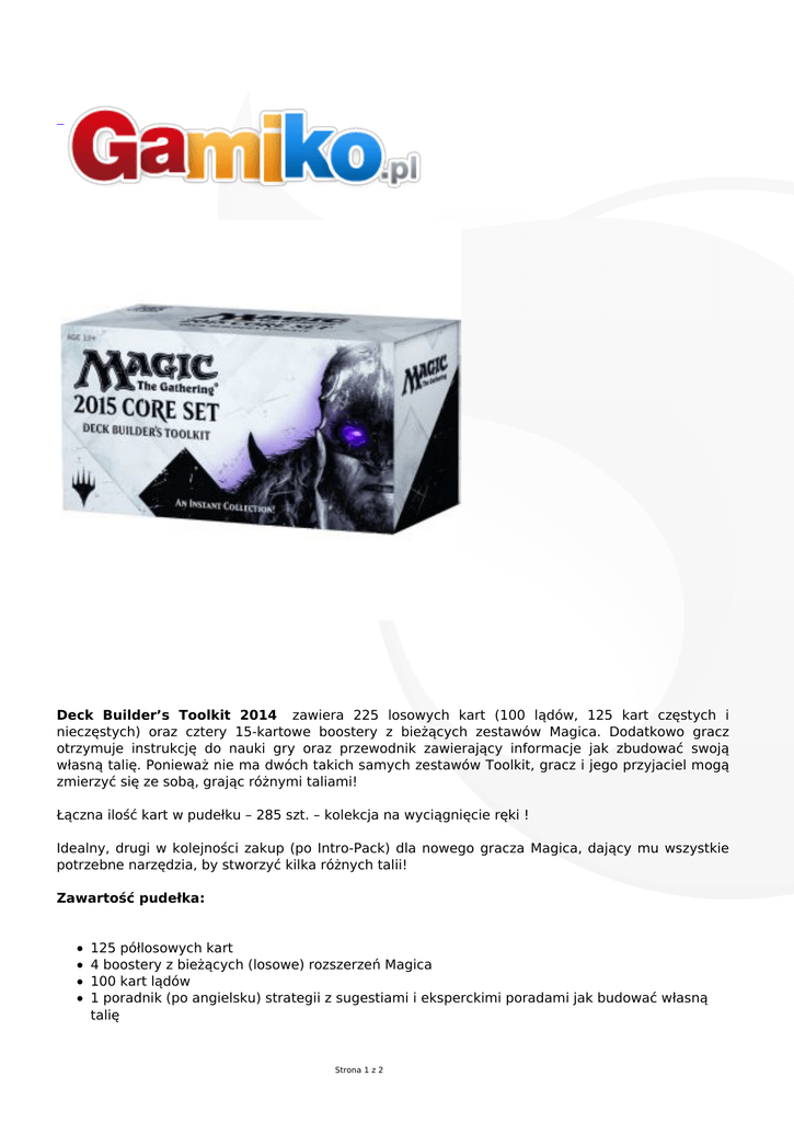 Deck Builder’s Toolkit 2014 zawiera 225 losowych kart (100 lądów, 125 kart częstych i nieczęstych) oraz cztery 15-kartowe boostery z bieżących zestawów Magica. Dodatkowo gracz otrzymuje instrukcję do nauki gry oraz przewodnik zawierający informacje jak zbudować swoją własną talię. Ponieważ nie ma dwóch takich samych zestawów Toolkit, gracz i jego przyjaciel mogą zmierzyć się ze sobą, grając różnymi taliami! Łączna ilość kart w pudełku – 285 szt. – kolekcja na wyciągnięcie ręki ! Idealny, drugi w kolejności zakup (po Intro-Pack) dla nowego gracza Magica, dający mu wszystkie potrzebne narzędzia, by stworzyć kilka różnych talii! Zawartość pudełka: 125 półlosowych kart 4 boostery z bieżących (losowe) rozszerzeń Magica 100 kart lądów 1 poradnik (po angielsku) strategii z sugestiami i eksperckimi poradami jak budować własną talię Strona 1 z 2 1 instrukcja do nauki gry po angielsku Wydanie angielskie Producent Wizards of the Coast Strona 2 z 2