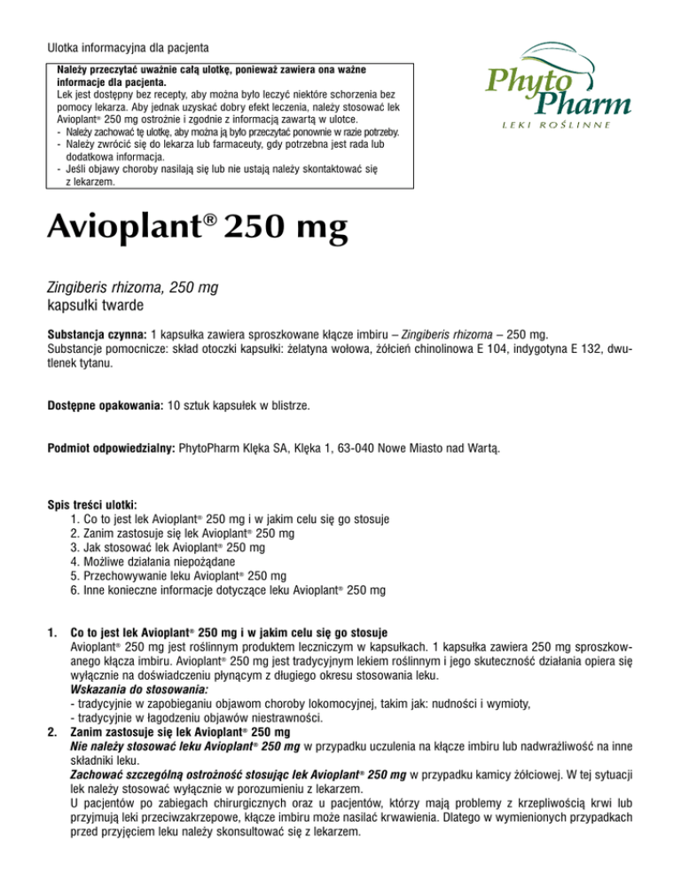 Ulotka informacyjna dla pacjenta Nale˝y przeczytaç uwa˝nie ca∏à ulotk´, poniewa˝ zawiera ona wa˝ne informacje dla pacjenta. Lek jest dost´pny bez recepty, aby mo˝na by∏o leczyç niektóre schorzenia bez pomocy lekarza. Aby jednak uzyskaç dobry efekt leczenia, nale˝y stosowaç lek Avioplant® 250 mg ostro˝nie i zgodnie z informacjà zawartà w ulotce. - Nale˝y zachowaç t´ ulotk´, aby mo˝na jà by∏o przeczytaç ponownie w razie potrzeby. - Nale˝y zwróciç si´ do lekarza lub farmaceuty, gdy potrzebna jest rada lub dodatkowa informacja. - JeÊli objawy choroby nasilajà si´ lub nie ustajà nale˝y skontaktowaç si´ z lekarzem. Avioplant® 250 mg Zingiberis rhizoma, 250 mg kapsu∏ki twarde Substancja czynna: 1 kapsułka zawiera sproszkowane kłàcze imbiru – Zingiberis rhizoma – 250 mg. Substancje pomocnicze: skład otoczki kapsułki: ˝elatyna wołowa, ˝ółcieƒ chinolinowa E 104, indygotyna E 132, dwutlenek tytanu. Dost´pne opakowania: 10 sztuk kapsułek w blistrze. Podmiot odpowiedzialny: PhytoPharm Kl´ka SA, Kl´ka 1, 63-040 Nowe Miasto nad Wartà. Spis treÊci ulotki: 1. Co to jest lek Avioplant® 250 mg i w jakim celu si´ go stosuje 2. Zanim zastosuje si´ lek Avioplant® 250 mg 3. Jak stosowaç lek Avioplant® 250 mg 4. Mo˝liwe dzia∏ania niepo˝àdane 5. Przechowywanie leku Avioplant® 250 mg 6. Inne konieczne informacje dotyczàce leku Avioplant® 250 mg 1. Co to jest lek Avioplant® 250 mg i w jakim celu si´ go stosuje Avioplant® 250 mg jest roÊlinnym produktem leczniczym w kapsułkach. 1 kapsułka zawiera 250 mg sproszkowanego kłàcza imbiru. Avioplant® 250 mg jest tradycyjnym lekiem roÊlinnym i jego skutecznoÊç działania opiera si´ wyłàcznie na doÊwiadczeniu płynàcym z długiego okresu stosowania leku. Wskazania do stosowania: - tradycyjnie w zapobieganiu objawom choroby lokomocyjnej, takim jak: nudnoÊci i wymioty, - tradycyjnie w łagodzeniu objawów niestrawnoÊci. 2. Zanim zastosuje si´ lek Avioplant® 250 mg Nie nale˝y stosowaç leku Avioplant® 250 mg w przypadku uczulenia na kłàcze imbiru lub nadwra˝liwoÊç na inne składniki leku. Zachowaç szczególnà ostro˝noÊç stosujàc lek Avioplant® 250 mg w przypadku kamicy ˝ółciowej. W tej sytuacji lek nale˝y stosowaç wyłàcznie w porozumieniu z lekarzem. U pacjentów po zabiegach chirurgicznych oraz u pacjentów, którzy majà problemy z krzepliwoÊcià krwi lub przyjmujà leki przeciwzakrzepowe, kłàcze imbiru mo˝e nasilaç krwawienia. Dlatego w wymienionych przypadkach przed przyj´ciem leku nale˝y skonsultowaç si´ z lekarzem. Stosowanie leku Avioplant® 250 mg z jedzeniem i piciem Przyjmowanie kłàcza imbiru równoczeÊnie z napojami alkoholowymi mo˝e nasilaç perystaltyk´ jelit. Zachowanie szczególnej ostro˝noÊci u niektórych szczególnych grup stosujàcych lek: Stosowanie leku u dzieci Lek mo˝e byç stosowany u dzieci od 6 r.˝. Stosowanie leku Avioplant® 250 mg u pacjentów w podeszłym wieku Stosowaç jak u osób dorosłych. Cià˝a i karmienie piersià Brak jest wystarczajàcych danych potwierdzajàcych bezpieczeƒstwo stosowania kłàcza imbiru u kobiet w cià˝y i w czasie laktacji. Przed zastosowaniem leku nale˝y poradziç si´ lekarza. Prowadzenie pojazdów i obs∏uga maszyn Lek nie upoÊledza zdolnoÊci kierowania pojazdami mechanicznymi i obsługi maszyn. Nie wpływa na sprawnoÊç psychofizycznà i nie powoduje sennoÊci. Stosowanie innych leków Przyjmujàc równoczeÊnie Avioplant® 250 mg i sulfoguanidyn´, mo˝e wystàpiç zwi´kszona absorpcja sulfaguanidyny. Lek mo˝e pot´gowaç działanie doustnych leków przeciwzakrzepowych, niesteroidowych leków przeciwzapalnych, leków hipoglikemicznych oraz glikozydów nasercowych. Przyjmowanie kłàcza imbiru równoczeÊnie z lekami zawierajàcymi alkohol mo˝e nasilaç perystaltyk´ jelit. 3. Jak stosowaç lek Avioplant® 250 mg JeÊli lekarz nie zalecił inaczej, nale˝y stosowaç nast´pujàcy schemat stosowania leku: DoroÊli i dzieci powy˝ej 6 lat: Zapobiegawczo przeciw objawom choroby lokomocyjnej Przyjàç 2 kapsułki przynajmniej pół godziny przed podró˝à, w przypadku wystàpienia nudnoÊci w czasie podró˝y 1-2 kapsułki co 4 godziny. W objawach niestrawnoÊci 2-4 kapsułek dziennie. W przypadku wra˝enia, ˝e dzia∏anie leku Avioplant® 250 mg jest za mocne lub za s∏abe, nale˝y zwróciç si´ do lekarza lub farmaceuty. W przypadku za˝ycia znacznie wi´kszej dawki leku Avioplant® 250 mg ni˝ zalecana nale˝y skontaktowaç si´ z lekarzem, szczególnie w przypadku wystàpienia jakichkolwiek niepokojàcych objawów. Nie przekraczaç dawki 6 g kłàcza imbiru, co odpowiada 24 kapsułkom leku Avioplant® 250 mg. W przypadku pomini´cia dawki leku Avioplant® 250 mg nie nale˝y stosowaç dawki podwójnej w celu uzupełnienia pomini´tej dawki. Przyjàç dawk´ pomini´tà i post´powaç dalej wg zalecanego schematu. 4. Mo˝liwe dzia∏ania niepo˝àdane Jak ka˝dy lek, lek Avioplant® 250 mg mo˝e powodowaç działania niepo˝àdane. Podczas przyjmowania leku mo˝e wystàpiç zgaga. W przypadku wystàpienia tych lub innych objawów niepo˝àdanych, nie wymienionych w tej ulotce, nale˝y poinformowaç o nich lekarza. 5. Przechowywanie leku Lek nale˝y przechowywaç w miejscu niedost´pnym i niewidocznym dla dzieci. Przechowywaç lek Avioplant® 250 mg w temperaturze poni˝ej 25ºC. Nie nale˝y stosowaç leku Avioplant® 250 mg po upływie terminu wa˝noÊci zamieszczonego na opakowaniu. 6. Inne informacje W celu uzyskania bardziej szczegó∏owych informacji nale˝y zwróciç si´ do przedstawiciela podmiotu odpowiedzialnego. PhytoPharm Kl´ka SA Kl´ka 1 63-040 Nowe Miasto nad Wartà Polska Data ostatniej weryfikacji ulotki: 11.05.2009 r.