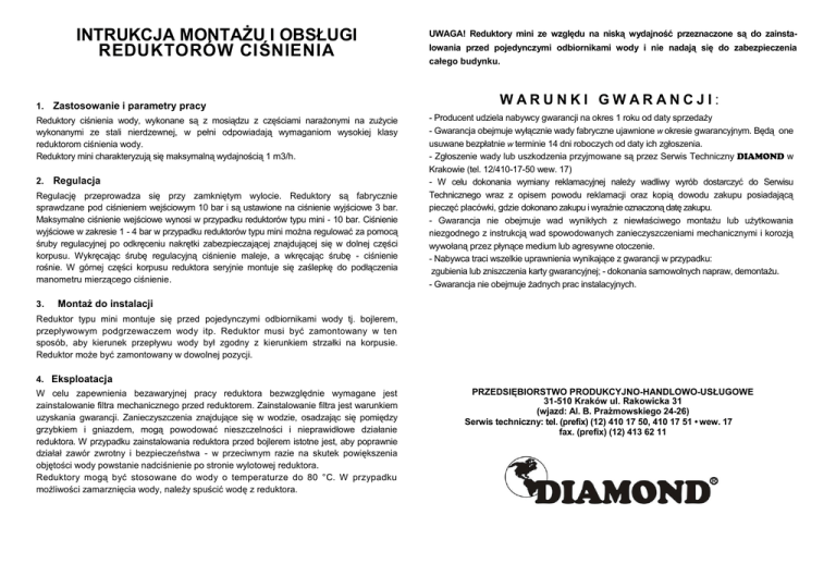 INTRUKCJA MONTAŻU I OBSŁUGI REDUKTORÓW CIŚNIENIA 1. Zastosowanie i parametry pracy Reduktory ciśnienia wody, wykonane są z mosiądzu z częściami narażonymi na zużycie wykonanymi ze stali nierdzewnej, w pełni odpowiadają wymaganiom wysokiej klasy reduktorom ciśnienia wody. Reduktory mini charakteryzują się maksymalną wydajnością 1 m3/h. 2. Regulacja Regulację przeprowadza się przy zamkniętym wylocie. Reduktory są fabrycznie sprawdzane pod ciśnieniem wejściowym 10 bar i są ustawione na ciśnienie wyjściowe 3 bar. Maksymalne ciśnienie wejściowe wynosi w przypadku reduktorów typu mini - 10 bar. Ciśnienie wyjściowe w zakresie 1 - 4 bar w przypadku reduktorów typu mini można regulować za pomocą śruby regulacyjnej po odkręceniu nakrętki zabezpieczającej znajdującej się w dolnej części korpusu. Wykręcając śrubę regulacyjną ciśnienie maleje, a wkręcając śrubę - ciśnienie rośnie. W górnej części korpusu reduktora seryjnie montuje się zaślepkę do podłączenia manometru mierzącego ciśnienie. 3. UWAGA! Reduktory mini ze względu na niską wydajność przeznaczone są do zainstalowania przed pojedynczymi odbiornikami wody i nie nadają się do zabezpieczenia całego budynku. WARUNKI GWARANCJI: - Producent udziela nabywcy gwarancji na okres 1 roku od daty sprzedaży - Gwarancja obejmuje wyłącznie wady fabryczne ujawnione w okresie gwarancyjnym. Będą one usuwane bezpłatnie w terminie 14 dni roboczych od daty ich zgłoszenia. - Zgłoszenie wady lub uszkodzenia przyjmowane są przez Serwis Techniczny DIAMOND w Krakowie (tel. 12/410-17-50 wew. 17) - W celu dokonania wymiany reklamacyjnej należy wadliwy wyrób dostarczyć do Serwisu Technicznego wraz z opisem powodu reklamacji oraz kopią dowodu zakupu posiadającą pieczęć placówki, gdzie dokonano zakupu i wyraźnie oznaczoną datę zakupu. - Gwarancja nie obejmuje wad wynikłych z niewłaściwego montażu lub użytkowania niezgodnego z instrukcją wad spowodowanych zanieczyszczeniami mechanicznymi i korozją wywołaną przez płynące medium lub agresywne otoczenie. - Nabywca traci wszelkie uprawnienia wynikające z gwarancji w przypadku: zgubienia lub zniszczenia karty gwarancyjnej; - dokonania samowolnych napraw, demontażu. - Gwarancja nie obejmuje żadnych prac instalacyjnych. Montaż do instalacji Reduktor typu mini montuje się przed pojedynczymi odbiornikami wody tj. bojlerem, przepływowym podgrzewaczem wody itp. Reduktor musi być zamontowany w ten sposób, aby kierunek przepływu wody był zgodny z kierunkiem strzałki na korpusie. Reduktor może być zamontowany w dowolnej pozycji. 4. Eksploatacja W celu zapewnienia bezawaryjnej pracy reduktora bezwzględnie wymagane jest zainstalowanie filtra mechanicznego przed reduktorem. Zainstalowanie filtra jest warunkiem uzyskania gwarancji. Zanieczyszczenia znajdujące się w wodzie, osadzając się pomiędzy grzybkiem i gniazdem, mogą powodować nieszczelności i nieprawidłowe działanie reduktora. W przypadku zainstalowania reduktora przed bojlerem istotne jest, aby poprawnie działał zawór zwrotny i bezpieczeństwa - w przeciwnym razie na skutek powiększenia objętości wody powstanie nadciśnienie po stronie wylotowej reduktora. Reduktory mogą być stosowane do wody o temperaturze do 80 °C. W przypadku możliwości zamarznięcia wody, należy spuścić wodę z reduktora. PRZEDSIĘBIORSTWO PRODUKCYJNO-HANDLOWO-USŁUGOWE 31-510 Kraków ul. Rakowicka 31 (wjazd: Al. B. Prażmowskiego 24-26) Serwis techniczny: tel. (prefix) (12) 410 17 50, 410 17 51 • wew. 17 fax. (prefix) (12) 413 62 11