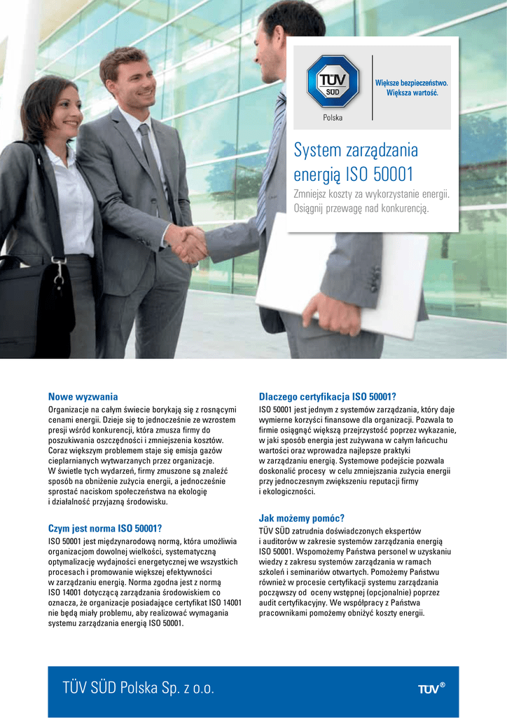 System zarządzania energią ISO 50001 Zmniejsz koszty za wykorzystanie energii. Osiągnij przewagę nad konkurencją. Nowe wyzwania Dlaczego certyfikacja ISO 50001? Organizacje na całym świecie borykają się z rosnącymi cenami energii. Dzieje się to jednocześnie ze wzrostem presji wśród konkurencji, która zmusza firmy do poszukiwania oszczędności i zmniejszenia kosztów. Coraz większym problemem staje się emisja gazów cieplarnianych wytwarzanych przez organizacje. W świetle tych wydarzeń, firmy zmuszone są znaleźć sposób na obniżenie zużycia energii, a jednocześnie sprostać naciskom społeczeństwa na ekologię i działalność przyjazną środowisku. ISO 50001 jest jednym z systemów zarządzania, który daje wymierne korzyści finansowe dla organizacji. Pozwala to firmie osiągnąć większą przejrzystość poprzez wykazanie, w jaki sposób energia jest zużywana w całym łańcuchu wartości oraz wprowadza najlepsze praktyki w zarządzaniu energią. Systemowe podejście pozwala doskonalić procesy w celu zmniejszania zużycia energii przy jednoczesnym zwiększeniu reputacji firmy i ekologiczności. Czym jest norma ISO 50001? ISO 50001 jest międzynarodową normą, która umożliwia organizacjom dowolnej wielkości, systematyczną optymalizację wydajności energetycznej we wszystkich procesach i promowanie większej efektywności w zarządzaniu energią. Norma zgodna jest z normą ISO 14001 dotyczącą zarządzania środowiskiem co oznacza, że organizacje posiadające certyfikat ISO 14001 nie będą miały problemu, aby realizować wymagania systemu zarządzania energią ISO 50001. TÜV SÜD Polska Sp. z o.o. Jak możemy pomóc? TÜV SÜD zatrudnia doświadczonych ekspertów i auditorów w zakresie systemów zarządzania energią ISO 50001. Wspomożemy Państwa personel w uzyskaniu wiedzy z zakresu systemów zarządzania w ramach szkoleń i seminariów otwartych. Pomożemy Państwu również w procesie certyfikacji systemu zarządzania począwszy od oceny wstępnej (opcjonalnie) poprzez audit certyfikacyjny. We współpracy z Państwa pracownikami pomożemy obniżyć koszty energii. SZEŚĆ KROKÓW DO CERTYFIKACJI Wypełnienie zapytania ofertowego w celu przygotowania oferty zawierającej koszty i planowany czas trwania auditu. Przesłanie karty zgłoszenia. Audit wstępny (opcjonalny) pozwalający dokonać analizy rozbieżności między obecnym stanem, a wymaganiami normy. Auditorzy TÜV SÜD przeprowadzą etap I w celu weryfikacji danych względem zgłoszenia oraz zaplanowania etapu II. Wizyta auditorów TÜV SÜD w lokalizacji w celu oceny funkcjonowania organizacji (Etap II). W razie stwierdzenia niezgodności wprowadzenie działań korygujących. Decyzja komitetu technicznego oraz przesłanie raportu i certyfikatu, audity sprawdzające w celu oceny doskonalenia, po upływie 3 lat recertyfikacja. Znak certyfikacji TÜV SÜD Znak certyfikacji ISO 50001 od TÜV SÜD wykazuje Państwa zaangażowanie w kwestie energetyczne i zdolność do ciągłego doskonalenia. Prestiż znaku certyfikacji TÜV SÜD stawia Państwa organizację obok innych firm certyfikowanych na zgodność z ISO 50001 i wyróżnia względem konkurencji. Dlaczego TÜV SÜD? TÜV SÜD jest światowym liderem w zakresie certyfikacji systemów zarządzania, który na chwilę obecną wydał ponad 54.000 certyfikatów. Poprzez wieloletnie doświadczenie oraz kompetentnych auditorów zapewniamy organizacjom na każdym etapie wsparcie i niezależną ocenę. Nasi auditorzy mogą przeprowadzić audit w dowolnym miejscu w kraju i na świecie, jak i też wykonać audit ISO 50001 zintegrowany z innymi systemami zarządzania. Ze znakiem certyfikacji TÜV SÜD możesz udowodnić swoje zaangażowanie w dostarczanie wysokiej jakości produktów i usług. Większe bezpieczeństwo. Większa wartość. TÜV SÜD Polska należy do międzynarodowego koncernu TÜV SÜD AG, który od ponad 140 lat chroni ludzi, środowisko i własność przed niekorzystnymi skutkami technologii. TÜV SÜD specjalizuje się w badaniach, auditach, prowadzeniu inspekcji, certyfikacji, szkoleniach i usługach eksperckich. Reprezentowany w ponad 800 lokalizacjach na całym świecie posiada potwierdzone akredytacjami kompetencje w Ameryce Północnej, Ameryce Południowej, Europie oraz Azji. Dostarczamy obiektywne rozwiązania naszym klientom, budując konkretną wartość dla biznesu, konsumentów. Usługi powiązane: TÜV SÜD Polska oferuje następujące usługi: ISO 9001 – system zarządzania jakością ISO 14001 – system zarządzania środowiskowego OHSAS 18001 – system zarządzania higieną zarządzania energią pozwalającym zwiększać efektywność energetyczną i zmniejszać zużycia czynników energetycznych. Poprawa przejrzystości – szczegółowe analizy przepływu energii i jej zużycia w organizacji pokazują jasną komunikację przy zarzadzaniu energią. Współpraca z ekspertem – jakim jest TÜV SÜD, posiadający doświadczonych i kompetentnych auditorów. Zwiększenie konkurencyjności – poprzez promowanie najlepszych praktyk w zakresie gospodarowania energią i wzmacnianie dobrych praktyk w zakresie zarządzania nią. Zdobycie uznania na rynku – dzięki odpowiedniemu zarządzaniu energią pozwala nadzorować zużycie energii i pozwala wzmocnić Państwa pozycję na rynku. i bezpieczeństwem pracy ISO/IEC 27001 – system zarządzania bezpieczeństwem informacji ISO/TS 16949 – system zarządzania jakością w motoryzacji Zintegrowana certyfikacja systemów zarządzania Szkolenia z zakresu systemów zarządzania Seminaria tematyczne Bezpłatny udział w „Śniadaniach z ekspertem” TÜV SÜD Polska Sp. z o.o. · Dział Management Service ul. Towarowa 35, 61-896 Poznań Tel.: +48 61 850 74 08 Fax: +48 61 855 76 52 [email protected] www.tuv-sud.pl 2014 © TÜV SÜD Polska Sp. z . o.o. | V-IM/MS/13.0/pl/PL Korzyści dla Państwa firmy Oszczędność czasu i pieniędzy – dzięki zasadom