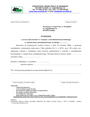 POWIATOWY URZĄD PRACY W PRUDNIKU 48-200 Prudnik, ul. Jagiellońska 21 tel. 77 436 23 04; tel./ fax. 77 436 99 88 www.pup-prudnik.pl; e-mail: [email protected] ........................................................ (pieczęć firmowa wnioskodawcy) .......................................... (miejscowość, data) Powiatowy Urząd Pracy w Prudniku ul. Jagiellońska 21 48-200 Prudnik WNIOSEK o zwrot części kosztów w związku z zatrudnieniem bezrobotnego w ramach bonu zatrudnieniowego za miesiąc………….. Stosownie do postanowień art.66m Ustawy z dnia 20 kwietnia 2004r. o promocji zatrudnienia i instytucjach rynku pracy /Tekst jednolity Dz. U. z 2015r., poz. 149 z późn. zm./ zgłaszamy wniosek o refundację części kosztów poniesionych w związku z zatrudnieniem bezrobotnego w ramach bonu zatrudnieniowego. Wniosek dotyczy umowy numer ……………. zawartej w dniu…………………………. Prosimy o refundację w wysokości………………….. (słownie złotych:……………………………………………………………………) Ww. kwotę proszę przekazać na nasze konto bankowe nr: ........................................................................................................................................................... ........................................................................ ( Główny Księgowy, pieczątka i podpis) ……………………………………… (Podpis i Pieczątka Pracodawcy) Załączniki: - rozliczenie finansowe, - uwierzytelnione kopie list płac, - potwierdzenie odbiory/przelania wynagrodzenia, - kserokopie zwolnień lekarskich, - kserokopia listy obecności, - kopie deklaracji ZUS DRA wraz z kopiami dowodów wpłaty, KSEROKOPIE DOKUMENTÓW POWINNY BYĆ POTWIERDZONE ZA ZGODNOŚĆ Z ORYGINAŁEM UWAGA: 1. Rozliczenie zbiorcze należy sporządzić oddzielnie dla każdej zawartej umowy z PUP w Prudniku z rozliczeniem finansowym. zgodnie ROZLICZENIE FINANSOWE Za okres od ………….. do ………………. w ramach zawartej umowy z dnia …………………. Nr…………. l.p. Imię i nazwisko Zatrudniony dnia Zwolniony dnia Koszty zatrudnienia (wynagrodzenie brutto w zł+ składki ZUS pracodawcy) Wynagrodzenie refundowane dla pracodawcy w zł 1 2 3 4 5 6 1 2 3 4 Ponadto informuję, iż pracownik korzystał ze zwolnienia lekarskiego bądź urlopu bezpłatnego: Lp. Imię i Nazwisko Zwolnienie lekarskie od -do Wynagrodzenie za czas choroby (płatne z funduszu pracodawcy Ilość dni od-do Kwota w zł Zasiłek chorobowy (płatny z ZUS) Ilość dni od-do Urlop bezpłatny od-do Kwota w zł 1 UWAGA: Rozliczenie finansowe i zbiorcze należy sporządzić oddzielnie dla każdej zawartej umowy z PUP w Prudniku .................................................................. Podpis i telefon osoby sporządzającej .................................................................. Główny księgowy .................................................................. (pieczątka i podpis)