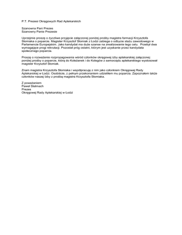 P.T. Prezesi Okręgowych Rad Aptekarskich Szanowna Pani Prezes Szanowny Panie Prezesie Uprzejmie proszę o życzliwe przyjęcie załączonej poniżej prośby magistra farmacji Krzysztofa Słomiaka o poparcie. Magister Krzysztof Słomiak z Łodzi zabiega o odbycie stażu zawodowego w Parlamencie Europejskim. Jako kandydat ma duże szanse na zrealizowanie tego celu. Przebył dwa wymagające progi rekrutacji. Pozostał próg ostatni, którym jest uzyskanie przez kandydata społecznego poparcia. Proszę o rozważenie rozpropagowania wśród członków okręgowej izby aptekarskiej załączonej poniżej prośby o poparcie, którą do Koleżanek i do Kolegów z samorządu aptekarskiego wystosował magister Krzysztof Słomiak. Znam magistra Krzysztofa Słomiaka i współpracuję z nim jako członkiem Okręgowej Rady Aptekarskiej w Łodzi. Osobiście, z pełnym przekonaniem udzieliłem mu poparcia. Zapoznałem także członków naszej Izby z prośbą magistra Krzysztofa Słomiaka. Z poważaniem Paweł Stelmach Prezes Okręgowej Rady Aptekarskiej w Łodzi Szanowni Państwo, piszę z prośbą o wsparcie w głosowaniu środowiska farmaceutów oraz udostępnienie możliwymi kanałami i nieukrywaną radością, gdyż zakwalifikowałem się do 3 etapu konkursu o staż w Parlamencie Europejskim. Ostatni etap to głosowanie na FB poprzez aplikację: https://apps.facebook.com/po-eurostaz Jedna osoba z naszego województwa dostanie się na staż i chciałem prosić Was o pomoc i Wasz głos, aby to osiągnąć. Mam szansę na to, aby swoje kroki skierować ku Brukseli, pracować w środowisku europarlamentarzystów. Wszyscy wiemy jak ważne dla farmaceutów jest reprezentacja w strukturach rządowych, której aktualnie nie posiadamy. Z wykształcenia jestem farmaceutą, członkiem Okręgowej Rady Aptekarskiej w Łodzi. Aktualnie pracuję w Uniwersytecie Medycznym w Łodzi oraz w dwóch hurtowniach farmaceutycznych w Łodzi. Szczególnie bliska jest mi tematyka prawa w ochronie zdrowia i na tym chciałbym się skupić właśnie odbywając ten staż. Daje to ogromne możliwości rozwoju w tym kierunku i otwiera drzwi, które do tej pory były zamknięte. Aby zagłosować, należy kliknąć w link, zalogować się do portalu Facebook, wybrać województwo łódzkie, znaleźć mnie nie liście i kliknąć głosuj. Wszystko trwa mniej niż 10 sekund. Chciałbym powalczyć o to miejsce. Dla mnie to duża szansa, która nie jest przypadkiem. Liczę bardzo na Państwa pomoc i z całego serca dziękuję za każde wsparcie. Każdy głos jest na wagę złota. Jeśli jest to możliwe proszę o rozprzestrzenienie, tej informacji na wszystkie Izby Aptekarskie w Polsce oraz wszystkich członków OIA w Łodzi. Jestem jedynym farmaceutą, który dotarł do ostatniego etapu i dalej bierze udział w tym konkursie w skali całego kraju. Serdecznie pozdrawiam i dziękuję za pomoc, Krzysztof Słomiak