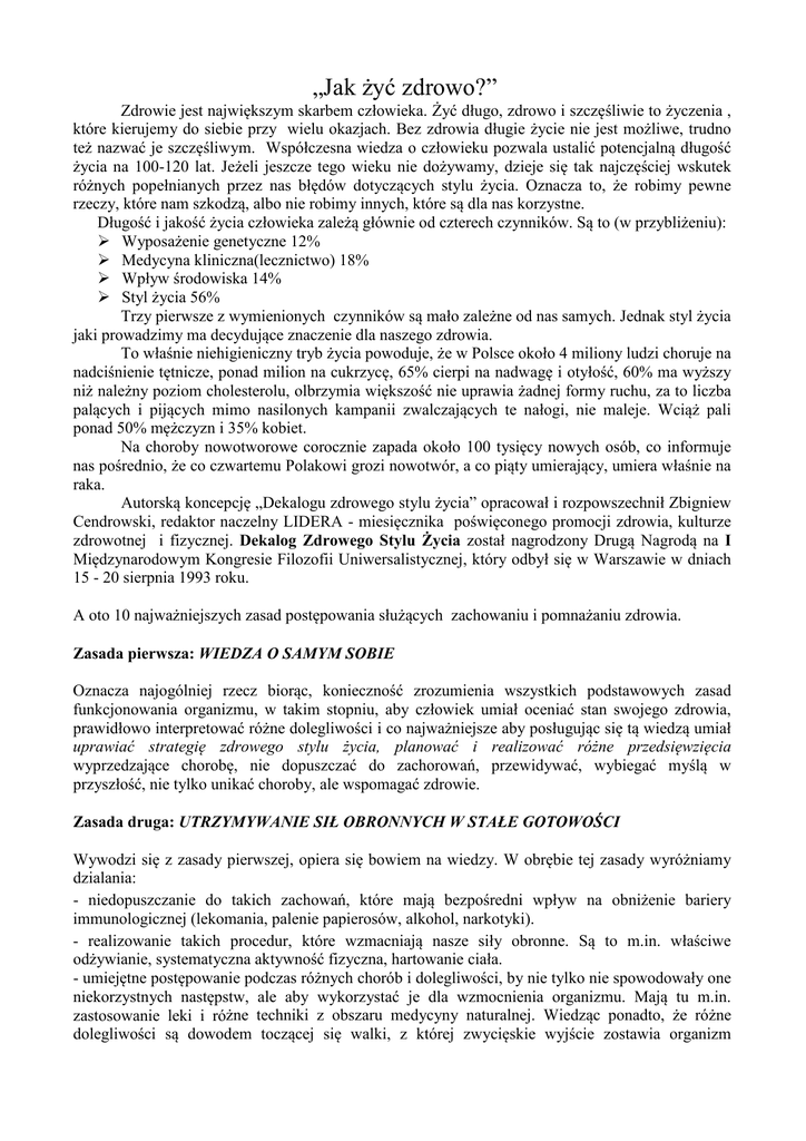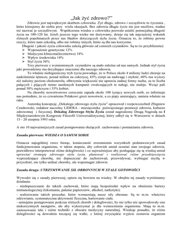 „Jak żyć zdrowo?” Zdrowie jest największym skarbem człowieka. Żyć długo, zdrowo i szczęśliwie to życzenia , które kierujemy do siebie przy wielu okazjach. Bez zdrowia długie życie nie jest możliwe, trudno też nazwać je szczęśliwym. Współczesna wiedza o człowieku pozwala ustalić potencjalną długość życia na 100-120 lat. Jeżeli jeszcze tego wieku nie dożywamy, dzieje się tak najczęściej wskutek różnych popełnianych przez nas błędów dotyczących stylu życia. Oznacza to, że robimy pewne rzeczy, które nam szkodzą, albo nie robimy innych, które są dla nas korzystne. Długość i jakość życia człowieka zależą głównie od czterech czynników. Są to (w przybliżeniu): Wyposażenie genetyczne 12% Medycyna kliniczna(lecznictwo) 18% Wpływ środowiska 14% Styl życia 56% Trzy pierwsze z wymienionych czynników są mało zależne od nas samych. Jednak styl życia jaki prowadzimy ma decydujące znaczenie dla naszego zdrowia. To właśnie niehigieniczny tryb życia powoduje, że w Polsce około 4 miliony ludzi choruje na nadciśnienie tętnicze, ponad milion na cukrzycę, 65% cierpi na nadwagę i otyłość, 60% ma wyższy niż należny poziom cholesterolu, olbrzymia większość nie uprawia żadnej formy ruchu, za to liczba palących i pijących mimo nasilonych kampanii zwalczających te nałogi, nie maleje. Wciąż pali ponad 50% mężczyzn i 35% kobiet. Na choroby nowotworowe corocznie zapada około 100 tysięcy nowych osób, co informuje nas pośrednio, że co czwartemu Polakowi grozi nowotwór, a co piąty umierający, umiera właśnie na raka. Autorską koncepcję „Dekalogu zdrowego stylu życia” opracował i rozpowszechnił Zbigniew Cendrowski, redaktor naczelny LIDERA - miesięcznika poświęconego promocji zdrowia, kulturze zdrowotnej i fizycznej. Dekalog Zdrowego Stylu Życia został nagrodzony Drugą Nagrodą na I Międzynarodowym Kongresie Filozofii Uniwersalistycznej, który odbył się w Warszawie w dniach 15 - 20 sierpnia 1993 roku. A oto 10 najważniejszych zasad postępowania służących zachowaniu i pomnażaniu zdrowia. Zasada pierwsza: WIEDZA O SAMYM SOBIE Oznacza najogólniej rzecz biorąc, konieczność zrozumienia wszystkich podstawowych zasad funkcjonowania organizmu, w takim stopniu, aby człowiek umiał oceniać stan swojego zdrowia, prawidłowo interpretować różne dolegliwości i co najważniejsze aby posługując się tą wiedzą umiał uprawiać strategię zdrowego stylu życia, planować i realizować różne przedsięwzięcia wyprzedzające chorobę, nie dopuszczać do zachorowań, przewidywać, wybiegać myślą w przyszłość, nie tylko unikać choroby, ale wspomagać zdrowie. Zasada druga: UTRZYMYWANIE SIŁ OBRONNYCH W STAŁE GOTOWOŚCI Wywodzi się z zasady pierwszej, opiera się bowiem na wiedzy. W obrębie tej zasady wyróżniamy dzialania: - niedopuszczanie do takich zachowań, które mają bezpośredni wpływ na obniżenie bariery immunologicznej (lekomania, palenie papierosów, alkohol, narkotyki). - realizowanie takich procedur, które wzmacniają nasze siły obronne. Są to m.in. właściwe odżywianie, systematyczna aktywność fizyczna, hartowanie ciała. - umiejętne postępowanie podczas różnych chorób i dolegliwości, by nie tylko nie spowodowały one niekorzystnych następstw, ale aby wykorzystać je dla wzmocnienia organizmu. Mają tu m.in. zastosowanie leki i różne techniki z obszaru medycyny naturalnej. Wiedząc ponadto, że różne dolegliwości są dowodem toczącej się walki, z której zwycięskie wyjście zostawia organizm wzmocniony, postępujemy tak, by pomóc (ale nie zastępować) naszym siłom organicznym w pokonaniu choroby. - pogłębianie umiejętności wykorzystania naszych sił psychicznych. Chodzi tu między innymi o różnego rodzaju techniki relaksacyjne, psychoterapoeutyczne., wizualizacyjne i inne z obszary medycyny naturalnej. Zasada trzecia: NIE NADUŻYWANIE LEKÓW Nadużycie leków jest jednym z najgroźniejszych współczesnych zjawisk społeczno – zdrowotnych. W większości przypadków różne dolegliwości ( ból , złe samopoczucie, gorączka itp.) Są świadectwem walki organizmu z chorobą. Tymczasem najczęściej kierujemy swe wysiłki na usunięcie objawów a nie samej choroby. Interwencja z zewnątrz dezorganizuje walkę organizmu z chorobą. Ta procedura wielokrotnie ponawiana sprawia ,że organizm staje się bezbronny wobec kolejnych ataków różnych chorób. Nie oznacza to oczywiście całkowitej rezygnacji z leków, a jedynie bardzo znaczące ograniczenie ich użycia do przypadków absolutnie niezbędnych. Zasada czwarta: UTRZYMYWANIE WSZECHSTRONNEJ AKTYWNOŚCI FIZYCZNEJ Lista zalet ćwiczeń fizycznych jest wielka i nie sposób ją całą wymienić. Koniecznie jednak podkreślić należy, że procesowi wzmacniania sił fizycznych z reguły towarzyszy wzmacnianie sił psychicznych. Fizyczna pewność siebie łatwo przenosi się na pewność w ogóle – wzmacnia i podwyższa kondycję antystresową, czyni człowieka pogodniejszym i życzliwszym dla innych. Zasada piąta: PRAWIDŁOWE ODŻYWIANIE SIĘ Jest to sprawa bardzo prosta. Bowiem spośród ogromu zaleceń i norm łatwo wyłonić te zalecenia, które są decydujące i gdybyśmy tylko w tych kilku sprawach osiągnęli powszechne stosowanie byłby to sukces ogromny. Te zasady to: -Przestrzeganie prawa bilansu energetycznego, tzn. należy tylko tyle spożywać, ile się .zużywa. - Maksymalne wyeliminowanie z diety tłuszczów zwierzęcych (i zastąpienie ich olejami roślinnymi) oraz produktów wysoko przetworzonych, czasem zwanych "białymi truciznami", jak cukier, sól, biała mąka. - Spożywanie dużych ilości warzyw i owoców. - Ograniczenie spożycia potraw o wysokiej zawartości cholesterolu. Zasada szósta: HARTOWANIE SIĘ Chodzi tu nie tylko o wzmocnienie bariery immunologicznej ( chroniącej przed chorobami), ale o takie świadome , planowe poddawanie swego ciała ( i psychiki ) r