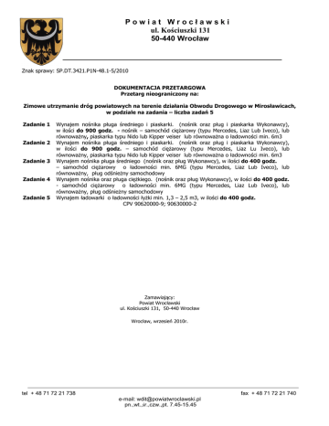Powiat Wrocławski ul. Kościuszki 131 50-440 Wrocław Znak sprawy: SP.DT.3421.P1N-48.1-5/2010 DOKUMENTACJA PRZETARGOWA Przetarg nieograniczony na: Zimowe utrzymanie dróg powiatowych na terenie działania Obwodu Drogowego w Mirosławicach, w podziale na zadania – liczba zadań 5 Zadanie 1 Zadanie 2 Zadanie 3 Zadanie 4 Zadanie 5 Wynajem nośnika pługa średniego i piaskarki. (nośnik oraz pług i piaskarka Wykonawcy), w ilości do 900 godz. - nośnik – samochód cięŜarowy (typu Mercedes, Liaz Lub Iveco), lub równowaŜny, piaskarka typu Nido lub Kipper veiser lub równowaŜna o ładowności min. 6m3 Wynajem nośnika pługa średniego i piaskarki. (nośnik oraz pług i piaskarka Wykonawcy), w ilości do 900 godz. – samochód cięŜarowy (typu Mercedes, Liaz Lu Iveco), lub równowaŜny, piaskarka typu Nido lub Kipper veiser lub równowaŜna o ładowności min. 6m3 Wynajem nośnika pługa średniego (nośnik oraz pług Wykonawcy), w ilości do 400 godz. – samochód cięŜarowy o ładowności min. 6MG (typu Mercedes, Liaz Lub Iveco), lub równowaŜny, pług odśnieŜny samochodowy Wynajem nośnika oraz pługa cięŜkiego. (nośnik oraz pług Wykonawcy), w ilości do 400 godz. - samochód cięŜarowy o ładowności min. 6MG (typu Mercedes, Liaz Lub Iveco), lub równowaŜny, pług odśnieŜny samochodowy Wynajem ładowarki o ładowności łyŜki min. 1,3 – 2,5 m3, w ilości do 400 godz. CPV 90620000-9; 90630000-2 Zamawiający: Powiat Wrocławski ul. Kościuszki 131, 50-440 Wrocław Wrocław, wrzesień 2010r. tel + 48 71 72 21 738 fax + 48 71 72 21 740 e-mail: [email protected] pn.,wt.,śr.,czw.,pt. 7.45-15.45