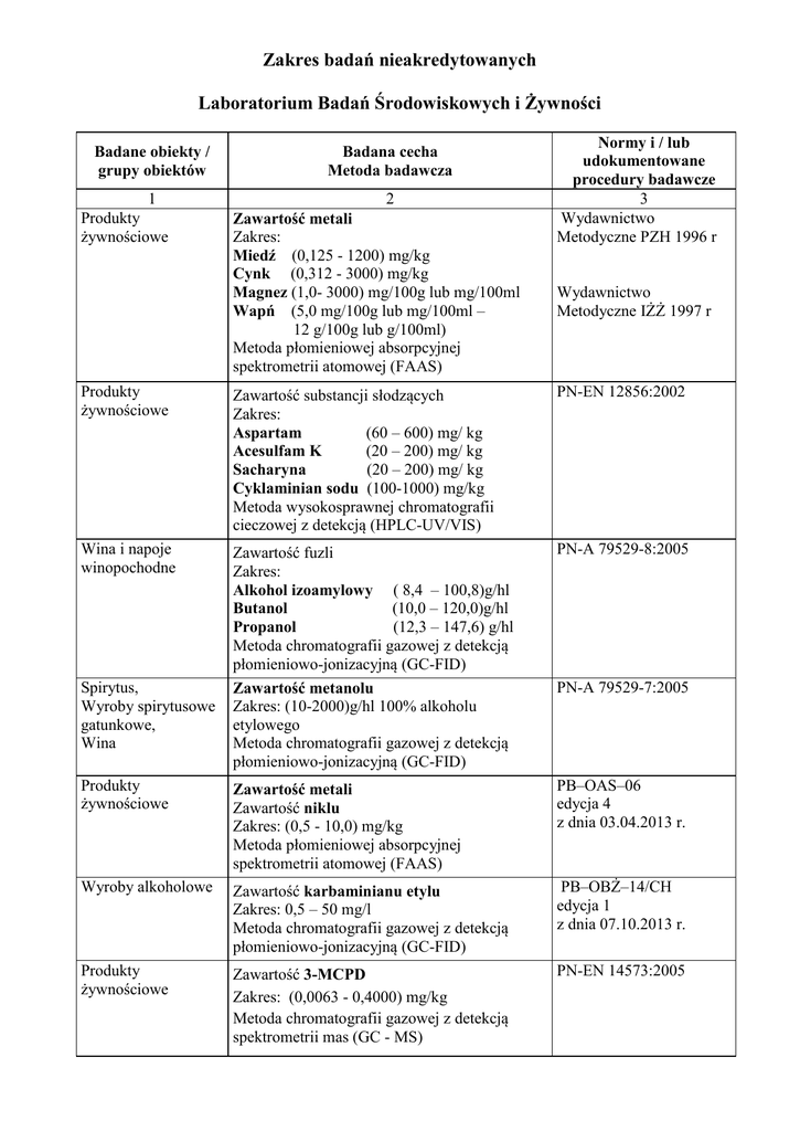 Zakres badań nieakredytowanych Laboratorium Badań Środowiskowych i Żywności Badane obiekty / grupy obiektów Badana cecha Metoda badawcza 1 2 Produkty żywnościowe Zawartość metali Zakres: Miedź (0,125 - 1200) mg/kg Cynk (0,312 - 3000) mg/kg Magnez (1,0- 3000) mg/100g lub mg/100ml Wapń (5,0 mg/100g lub mg/100ml – 12 g/100g lub g/100ml) Metoda płomieniowej absorpcyjnej spektrometrii atomowej (FAAS) Normy i / lub udokumentowane procedury badawcze 3 Wydawnictwo Metodyczne PZH 1996 r Wydawnictwo Metodyczne IŻŻ 1997 r Produkty żywnościowe Zawartość substancji słodzących Zakres: Aspartam (60 – 600) mg/ kg Acesulfam K (20 – 200) mg/ kg Sacharyna (20 – 200) mg/ kg Cyklaminian sodu (100-1000) mg/kg Metoda wysokosprawnej chromatografii cieczowej z detekcją (HPLC-UV/VIS) PN-EN 12856:2002 Wina i napoje winopochodne Zawartość fuzli Zakres: Alkohol izoamylowy ( 8,4 – 100,8)g/hl Butanol (10,0 – 120,0)g/hl Propanol (12,3 – 147,6) g/hl Metoda chromatografii gazowej z detekcją płomieniowo-jonizacyjną (GC-FID) Zawartość metanolu Zakres: (10-2000)g/hl 100% alkoholu etylowego Metoda chromatografii gazowej z detekcją płomieniowo-jonizacyjną (GC-FID) PN-A 79529-8:2005 Produkty żywnościowe Zawartość metali Zawartość niklu Zakres: (0,5 - 10,0) mg/kg Metoda płomieniowej absorpcyjnej spektrometrii atomowej (FAAS) PB–OAS–06 edycja 4 z dnia 03.04.2013 r. Wyroby alkoholowe Zawartość karbaminianu etylu Zakres: 0,5 – 50 mg/l Metoda chromatografii gazowej z detekcją płomieniowo-jonizacyjną (GC-FID) PB–OBŻ–14/CH edycja 1 z dnia 07.10.2013 r. Produkty żywnościowe Zawartość 3-MCPD Zakres: (0,0063 - 0,4000) mg/kg Metoda chromatografii gazowej z detekcją spektrometrii mas (GC - MS) PN-EN 14573:2005 Spirytus, Wyroby spirytusowe gatunkowe, Wina PN-A 79529-7:2005 Badane obiekty / grupy obiektów Badana cecha Metoda badawcza 1 2 Zawartość witaminy D3 Zakres: (0,25 – 700) µg/100g Metoda wysokosprawnej chromatografii cieczowej z detekcją w zakresie światła ultrafioletowego i widzialnego (HPLC-UV/VIS) Produkty żywnościowe Normy i / lub udokumentowane procedury badawcze 3 PN-EN 12821:2009 Produkty żywnościowe PN-EN 12823-1:2002 Zawartość witaminy A (retinolu) Zakres: (100 – 6000) µg/100g Metoda wysokosprawnej chromatografii cieczowej z detekcją w zakresie światła ultrafioletowego i widzialnego (HPLC-UV/VIS) Produkty żywnościowe PN-EN 12822:2002 Zawartość witaminy E Zakres: (1,0 – 2000) mg/100g Metoda wysokosprawnej chromatografii cieczowej z detekcją w zakresie światła ultrafioletowego i widzialnego (HPLC-UV/VIS) PN-EN ISO 15680:2008 Stężenie Benzenu Woda Zakres: 0,25-25 µg/l Metoda chromatografii gazowej z detekcją masową (GC/MS) Woda Stężenie chlorowanych pochodnych metanu (THM) Zakres: Trichlorometan 7,50-750 µg/l Dichlorobromometan 3,75-375 µg/l Dibromochlorometan 6,25-625 µg/l Tribromometan 6,25-625 µg/l Metoda chromatografii gazowej z detekcją masową (GC/MS) PN-EN ISO 15680:2008 Σ THM – z obliczeń Woda Stężenie Tetrachlorometanu Zakres: 0,50-50 µg/l Metoda chromatografii gazowej z detekcją masową (GC/MS) PN-EN ISO 15680:2008 Woda Stężenie Trichloroetenu i Tetrachloroetenu Zakres: Trichloroeten 1,00-100 µg/l Tetrachloroeten 1,00-100 µg/l Metoda chromatografii gazowej z detekcją masową (GC/MS) PN-EN ISO 15680:2008 Σ tri – i tetrachloroeten – z obliczeń Woda Stężenie 1,2-Dichloroetanu Zakres: 0,30-30 µg/l Metoda chromatografii gazowej z detekcją masową (GC/MS) PN-EN ISO 15680:2008 Badane obiekty / grupy obiektów Badana cecha Metoda badawcza 1 2 Woda, Odcieki, Ścieki Odcieki, Ścieki Zawartość rtęci Zakres: (0, 0003 –3,0) mg/l Metoda zimnych par CVAAS Stężenie metali Zakres: Ołów od 0,225 mg/l Kadm od 0,045 mg/l Miedź od 0,15 mg/l Cynk od 0,35 mg/l Nikiel od 0,35 mg/l Chrom od 0,30 mg/l Metoda płomieniowej absorpcyjnej spektrometrii atomowej (FAAS) Normy i / lub udokumentowane procedury badawcze 3 PB–OBŻ–02/CH edycja 2 z dnia 03.04.2013 r. PN-ISO 8288:2002 Gleba, Osady ściekowe Zawartość metali Zakres: Ołów od 1,125 mg/kg s.m. Kadm od 0,225 mg/kg s.m. Miedź od 0,75 mg/kg s.m. Cynk od 1,75 mg/kg s.m. Nikiel od 1,75 mg/kg s.m. Chrom od 1,50 mg/kg s.m. Metoda płomieniowej absorpcyjnej spekrtometrii atomowej (FAAS) PB–OAS–06 edycja 4 z dnia 03.04.2013 Gleba, Osady ściekowe Zawartość rtęci Zakres: (0,0006 –3,0) mg/kg s.m. Metoda zimnych par CVAAS PB–OBŻ–02/CH edycja 2 z dnia 03.04.2013 r. Środowisko pracy - powietrze Zawartość metali Zakres: Cynk (0,017 – 26,13) mg/m3 Kadm (0,0003 – 0,218) mg/m3 Miedź (0,0038 – 27,87) mg/m3 PB–OAS–06 edycja 3 z dnia 14.06.2010 Metoda płomieniowej absorpcyjnej spektrometrii atomowej (FAAS) Badane obiekty / grupy obiektów 1 Środowisko pracy - powietrze Badana cecha Metoda badawcza 2 Stężenie związków organicznych, benzyna ekstrakcyjna, benzyna do lakierów, butan-1-ol, dichlorometan, 2,2 – dimetylobutan, 2,3 – dimetylobutan, epoksyetan, 2-metylopentan, 3-metylopentan, heksan, octan winylu, octan 2-metoksypropylu, propan-2-ol, cykloheksan, eter dietylowy, glikol etylenowy, izooktan, metylocykloheksan, heptan, nonan, octan izopropylu, octan metylu, pentan Metoda chromatografii gazowej z detekcją płomieniowo jonizacyjną (GC-FID) Normy i / lub udokumentowane procedury badawcze 3 PB–OAS–01 edycja 3 z dnia 27.02.2009 Sekcja Badań Biologicznych Wody, Gleby w Oddziale Badania Wody, Gleby, Powietrza Badane obiekty / grupy obiektów 1 Woda, z wyłączeniem wody butelkowanej Woda, Woda, Gleba Gleba Gleba Woda w kąpieliskach Badana cecha Metoda badawcza 2 Pobieranie próbek do badań mikrobiologicznych Obecność i liczba bakterii grupy coli Granica wykrywalności od 1jtk/100ml/250ml Metoda filtrów membranowych Obecność i liczba bakterii Escherichia coli Granica wykrywalności od 1jtk/100ml/250ml Metoda filtrów membranowych Obecność jaj Ascaris sp.; obecne/nieobecne Obecność jaj Trichuris sp. (Tric