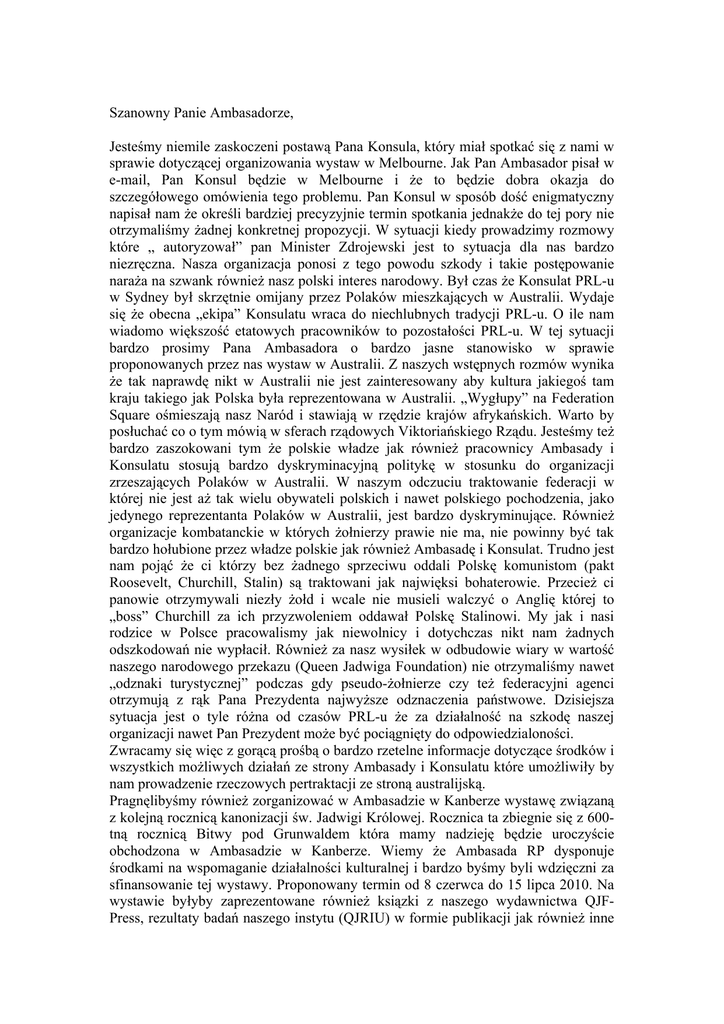 Szanowny Panie Ambasadorze, Jesteśmy niemile zaskoczeni postawą Pana Konsula, który miał spotkać się z nami w sprawie dotyczącej organizowania wystaw w Melbourne. Jak Pan Ambasador pisał w e-mail, Pan Konsul będzie w Melbourne i że to będzie dobra okazja do szczegółowego omówienia tego problemu. Pan Konsul w sposób dość enigmatyczny napisał nam że określi bardziej precyzyjnie termin spotkania jednakże do tej pory nie otrzymaliśmy żadnej konkretnej propozycji. W sytuacji kiedy prowadzimy rozmowy które „ autoryzował” pan Minister Zdrojewski jest to sytuacja dla nas bardzo niezręczna. Nasza organizacja ponosi z tego powodu szkody i takie postępowanie naraża na szwank również nasz polski interes narodowy. Był czas że Konsulat PRL-u w Sydney był skrzętnie omijany przez Polaków mieszkających w Australii. Wydaje się że obecna „ekipa” Konsulatu wraca do niechlubnych tradycji PRL-u. O ile nam wiadomo większość etatowych pracowników to pozostałości PRL-u. W tej sytuacji bardzo prosimy Pana Ambasadora o bardzo jasne stanowisko w sprawie proponowanych przez nas wystaw w Australii. Z naszych wstępnych rozmów wynika że tak naprawdę nikt w Australii nie jest zainteresowany aby kultura jakiegoś tam kraju takiego jak Polska była reprezentowana w Australii. „Wygłupy” na Federation Square ośmieszają nasz Naród i stawiają w rzędzie krajów afrykańskich. Warto by posłuchać co o tym mówią w sferach rządowych Viktoriańskiego Rządu. Jesteśmy też bardzo zaszokowani tym że polskie władze jak również pracownicy Ambasady i Konsulatu stosują bardzo dyskryminacyjną politykę w stosunku do organizacji zrzeszających Polaków w Australii. W naszym odczuciu traktowanie federacji w której nie jest aż tak wielu obywateli polskich i nawet polskiego pochodzenia, jako jedynego reprezentanta Polaków w Australii, jest bardzo dyskryminujące. Również organizacje kombatanckie w których żołnierzy prawie nie ma, nie powinny być tak bardzo hołubione przez władze polskie jak również Ambasadę i Konsulat. Trudno jest nam pojąć że ci którzy bez żadnego sprzeciwu oddali Polskę komunistom (pakt Roosevelt, Churchill, Stalin) są traktowani jak najwięksi bohaterowie. Przecież ci panowie otrzymywali niezły żołd i wcale nie musieli walczyć o Anglię której to „boss” Churchill za ich przyzwoleniem oddawał Polskę Stalinowi. My jak i nasi rodzice w Polsce pracowalismy jak niewolnicy i dotychczas nikt nam żadnych odszkodowań nie wypłacił. Również za nasz wysiłek w odbudowie wiary w wartość naszego narodowego przekazu (Queen Jadwiga Foundation) nie otrzymaliśmy nawet „odznaki turystycznej” podczas gdy pseudo-żołnierze czy też federacyjni agenci otrzymują z rąk Pana Prezydenta najwyższe odznaczenia państwowe. Dzisiejsza sytuacja jest o tyle różna od czasów PRL-u że za działalność na szkodę naszej organizacji nawet Pan Prezydent może być pociągnięty do odpowiedzialoności. Zwracamy się więc z gorącą prośbą o bardzo rzetelne informacje dotyczące środków i wszystkich możliwych działań ze strony Ambasady i Konsulatu które umożliwiły by nam prowadzenie rzeczowych pertraktacji ze stroną australijską. Pragnęlibyśmy również zorganizować w Ambasadzie w Kanberze wystawę związaną z kolejną rocznicą kanonizacji św. Jadwigi Królowej. Rocznica ta zbiegnie się z 600tną rocznicą Bitwy pod Grunwaldem która mamy nadzieję będzie uroczyście obchodzona w Ambasadzie w Kanberze. Wiemy że Ambasada RP dysponuje środkami na wspomaganie działalności kulturalnej i bardzo byśmy byli wdzięczni za sfinansowanie tej wystawy. Proponowany termin od 8 czerwca do 15 lipca 2010. Na wystawie byłyby zaprezentowane również ksiązki z naszego wydawnictwa QJFPress, rezultaty badań naszego instytu (QJRIU) w formie publikacji jak również inne formy działalności the Queen Jadwiga Foundation. Ponieważ św. Królowa Jadwiga jednoczy wiele europejskich krajów takich jak Francja, Włochy, Węgry, Litwa, Ukraina, Niemcy to przedstawiciele Ambasad z tych krajów byliby bardzo mile widziani. Na otwarciu mogłaby być wykonana aria z opery „Królowa Jadwiga” jak również Bogurodzica, nasz hymn narodowy. Mamy nadzieję że gościem honorowym nr.1 byłby Governer General który reprezentowałby Królową Elżbietę. W czasie trwania wystawy mogłby być zaprezentowane wykłady związane z naszymi badaniami nad rozumieniem i myśleniem, które byłyby zapewne wielką atrakcją. Można by również zorganizować wykładay dotyczące udziału św. Jadwigi Królowej w zwycięstwie grunwaldzkim jak również znaczenia Grunwaldu dla rozwoju naszego narodu i państwa. W ramach obchodów rocznicy grunwaldzkiej zamierzamy się zwrócić (jako obywatele australijscy) do Królowej Elżbiety o przyznanie nam mniejszości polskiej w Australii reprezentowanej przez QJF jednej z wysp należącej do Królowej Elżbiety. Byłoby to wynagrodzenie angielskiego narodu za ogromny wkład polskich lotników w bitwie o Anglię. Bardzo prosimy Pana Ambasadora o poparcie naszej propozycji. Z poważaniem, Prof. Zbigniew Les Dyrektor The Queen Jadwiga Foundation
