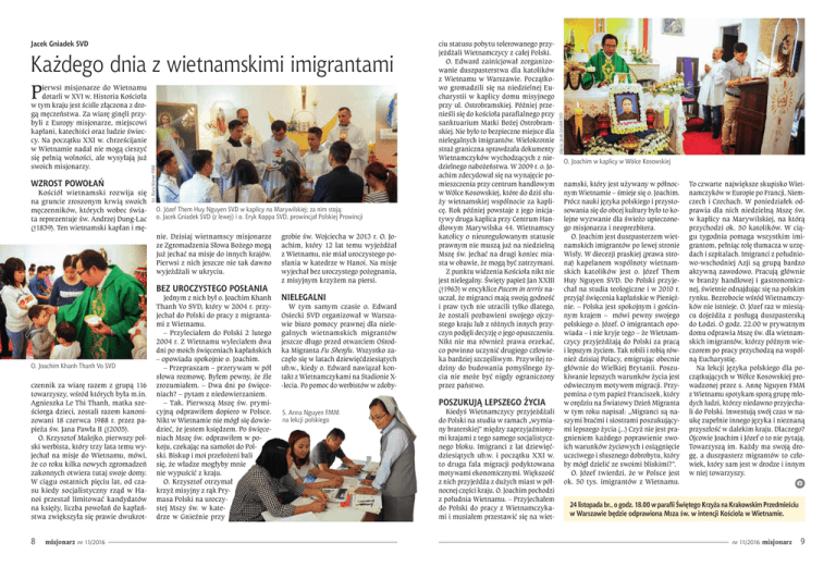 Każdego dnia z wietnamskimi imigrantami ierwsi misjonarze do Wietnamu dotarli w XVI w. Historia Kościoła w tym kraju jest ściśle złączona z drogą męczeństwa. Za wiarę ginęli przybyli z Europy misjonarze, miejscowi kapłani, katechiści oraz ludzie świeccy. Na początku XXI w. chrześcijanie w Wietnamie nadal nie mogą cieszyć się pełnią wolności, ale wysyłają już swoich misjonarzy. WZROST POWOŁAŃ Kościół wietnamski rozwija się na gruncie zroszonym krwią swoich męczenników, których wobec świata reprezentuje św. Andrzej Dung-Lac (†1839). Ten wietnamski kapłan i mę- fot. Maria Werner FMM P O. Józef Them Huy Nguyen SVD w kaplicy na Marywilskiej; za nim stoją: o. Jacek Gniadek SVD (z lewej) i o. Eryk Koppa SVD, prowincjał Polskiej Prowincji nie. Dzisiaj wietnamscy misjonarze ze Zgromadzenia Słowa Bożego mogą już jechać na misje do innych krajów. Pierwsi z nich jeszcze nie tak dawno wyjeżdżali w ukryciu. BEZ UROCZYSTEGO POSŁANIA O. Joachim Khanh Thanh Vo SVD czennik za wiarę razem z grupą 116 towarzyszy, wśród których była m.in. Agnieszka Le Thi Thanh, matka sześciorga dzieci, zostali razem kanonizowani 18 czerwca 1988 r. przez papieża św. Jana Pawła II (†2005). O. Krzysztof Malejko, pierwszy polski werbista, który trzy lata temu wyjechał na misje do Wietnamu, mówi, że co roku kilka nowych zgromadzeń zakonnych otwiera tutaj swoje domy. W ciągu ostatnich pięciu lat, od czasu kiedy socjalistyczny rząd w Hanoi przestał limitować kandydatów na księży, liczba powołań do kapłaństwa zwiększyła się prawie dwukrot- 8 nr 11/2016 Jednym z nich był o. Joachim Khanh Thanh Vo SVD, który w 2004 r. przyjechał do Polski do pracy z migrantami z Wietnamu. – Przyleciałem do Polski 2 lutego 2004 r. Z Wietnamu wyleciałem dwa dni po moich święceniach kapłańskich – opowiada spokojnie o. Joachim. – Przepraszam – przerywam w pół słowa rozmowę. Byłem pewny, że źle zrozumiałem. – Dwa dni po święceniach? – pytam z niedowierzaniem. – Tak. Pierwszą Mszę św. prymicyjną odprawiłem dopiero w Polsce. Nikt w Wietnamie nie mógł się dowiedzieć, że jestem księdzem. Po święceniach Mszę św. odprawiłem w pokoju, czekając na samolot do Polski. Biskup i moi przełożeni bali się, że władze mogłyby mnie nie wypuścić z kraju. O. Krzysztof otrzymał krzyż misyjny z rąk Prymasa Polski na uroczystej Mszy św. w katedrze w Gnieźnie przy grobie św. Wojciecha w 2013 r. O. Joachim, który 12 lat temu wyjeżdżał z Wietnamu, nie miał uroczystego posłania w katedrze w Hanoi. Na misje wyjechał bez uroczystego pożegnania, z misyjnym krzyżem na piersi. NIELEGALNI W tym samym czasie o. Edward Osiecki SVD organizował w Warszawie biuro pomocy prawnej dla nielegalnych wietnamskich migrantów jeszcze długo przed otwarciem Ośrodka Migranta Fu Shenfu. Wszystko zaczęło się w latach dziewięćdziesiątych ub.w., kiedy o. Edward nawiązał kontakt z Wietnamczykami na Stadionie X-lecia. Po pomoc do werbistów w zdoby- ciu statusu pobytu tolerowanego przyjeżdżali Wietnamczycy z całej Polski. O. Edward zainicjował zorganizowanie duszpasterstwa dla katolików z Wietnamu w Warszawie. Początkowo gromadzili się na niedzielnej Eucharystii w kaplicy domu misyjnego przy ul. Ostrobramskiej. Później przenieśli się do kościoła parafialnego przy sanktuarium Matki Bożej Ostrobramskiej. Nie było to bezpieczne miejsce dla nielegalnych imigrantów. Wielokrotnie straż graniczna sprawdzała dokumenty Wietnamczyków wychodzących z niedzielnego nabożeństwa. W 2009 r. o. Joachim zdecydował się na wynajęcie pomieszczenia przy centrum handlowym w Wólce Kosowskiej, które do dziś służy wietnamskiej wspólnocie za kaplicę. Rok później powstaje z jego inicjatywy druga kaplica przy Centrum Handlowym Marywilska 44. Wietnamscy katolicy o nieuregulowanym statusie prawnym nie muszą już na niedzielną Mszę św. jechać na drugi koniec miasta w obawie, że mogą być zatrzymani. Z punktu widzenia Kościoła nikt nie jest nielegalny. Święty papież Jan XXIII (†1963) w encyklice Pacem in terris nauczał, że migranci mają swoją godność i praw tych nie utracili tylko dlatego, że zostali pozbawieni swojego ojczystego kraju lub z różnych innych przyczyn podjęli decyzję o jego opuszczeniu. Nikt nie ma również prawa orzekać, co powinno uczynić drugiego człowieka bardziej szczęśliwym. Przywilej rodziny do budowania pomyślnego życia nie może być nigdy ograniczony przez państwo. POSZUKUJĄ LEPSZEGO ŻYCIA S. Anna Nguyen FMM na lekcji polskiego Kiedyś Wietnamczycy przyjeżdżali do Polski na studia w ramach „wymiany braterskiej” między zaprzyjaźnionymi krajami z tego samego socjalistycznego bloku. Imigranci z lat dziewięćdziesiątych ub.w. i początku XXI w. to druga fala migracji podyktowana motywami ekonomicznymi. Większość z nich przyjeżdża z dużych miast w północnej części kraju. O. Joachim pochodzi z południa Wietnamu. – Przyjechałem do Polski do pracy z Wietnamczykami i musiałem przestawić się na wiet- zdjęcia: Jacek Gniadek SVD Jacek Gniadek SVD O. Joachim w kaplicy w Wólce Kosowskiej namski, który jest używany w północnym Wietnamie – śmieje się o. Joachim. Prócz nauki języka polskiego i przystosowania się do obcej kultury było to kolejne wyzwanie dla świeżo upieczonego misjonarza i neoprezbitera. O. Joachim jest duszpasterzem wietnamskich imigrantów po lewej stronie Wisły. W diecezji praskiej (prawa strona) kapelanem wspólnoty wietnamskich katolików jest o. Józef Them Huy Nguyen SVD. Do Polski przyjechał na studia teologiczne i w 2010 r. przyjął święcenia kapłańskie w Pieniężnie. – Polska jest spokojnym i gościnnym krajem – mówi pewny swojego polskiego o. Józef. O imigrantach opowiada – i nie kryje tego – że Wietnamczycy przyjeżdżają do Polski za pracą i lepszym życiem. Tak robili i robią również dzisiaj Polacy, emigr
