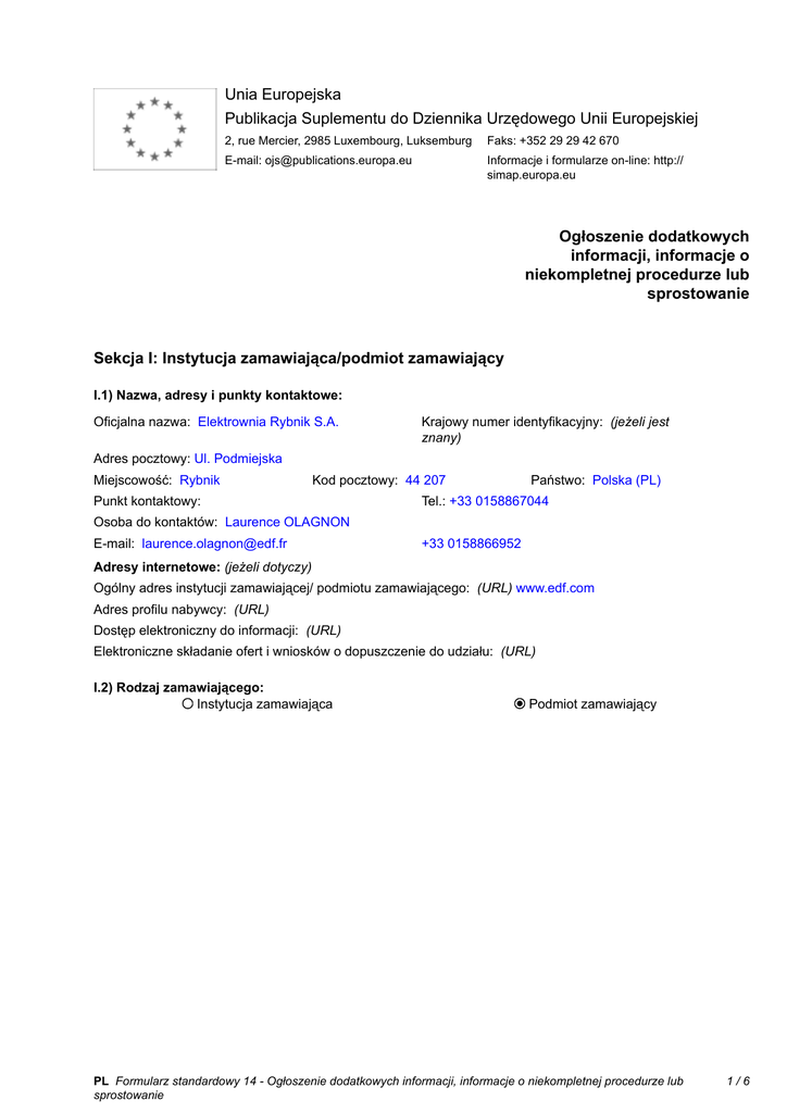 Unia Europejska Publikacja Suplementu do Dziennika Urzędowego Unii Europejskiej 2, rue Mercier, 2985 Luxembourg, Luksemburg Faks: +352 29 29 42 670 E-mail: [email protected] Informacje i formularze on-line: http:// simap.europa.eu Ogłoszenie dodatkowych informacji, informacje o niekompletnej procedurze lub sprostowanie Sekcja I: Instytucja zamawiająca/podmiot zamawiający I.1) Nazwa, adresy i punkty kontaktowe: Oficjalna nazwa: Elektrownia Rybnik S.A. Krajowy numer identyfikacyjny: (jeżeli jest znany) _____ Adres pocztowy: Ul. Podmiejska Miejscowość: Rybnik Kod pocztowy: 44 207 Punkt kontaktowy: _____ Państwo: Polska (PL) Tel.: +33 0158867044 Osoba do kontaktów: Laurence OLAGNON E-mail: [email protected] +33 0158866952 Adresy internetowe: (jeżeli dotyczy) Ogólny adres instytucji zamawiającej/ podmiotu zamawiającego: (URL) www.edf.com Adres profilu nabywcy: (URL) _____ Dostęp elektroniczny do informacji: (URL) _____ Elektroniczne składanie ofert i wniosków o dopuszczenie do udziału: (URL) _____ I.2) Rodzaj zamawiającego: Instytucja zamawiająca Podmiot zamawiający PL Formularz standardowy 14 - Ogłoszenie dodatkowych informacji, informacje o niekompletnej procedurze lub sprostowanie 1/6 Sekcja II: Przedmiot zamówienia II.1.1) Nazwa nadana zamówieniu: Zaprojektowanie, opracowanie, zakup, wytworzenie, transport, budowa, przeprowadzenie prób i rozruch instalacji oczyszczania spalin oraz związanych prac budowlanych, z wykorzystaniem elektrofiltru oraz procesu odsiarczania metodą mokrą wapienno-gipsową, na potrzeby projektu RUDA w Rybniku, Polska. II.1.2) Krótki opis zamówienia lub zakupu:(podano w pierwotnym ogłoszeniu) Przedmiotem zamówienia jest wykonanie w systemie pod klucz instalacji Oczyszczania Spalin (FGC - Flue Gas Cleaning) wraz z pracami budowlanymi, obejmującej: > instalację odsiarczania spalin (Flue Gas Desulphurisation - FGD): odsiarczanie metodą mokrą > instalację odpylania: elektrofiltr (ESP – electrostatic precipitator) > urządzenia do transportu i magazynowania popiołu lotnego > obiekty do magazynowania kamienia wapiennego i przygotowania zawiesiny > obróbka i magazynowanie gipsu > kanały spalin oraz klapy regulacyjne Zamawiający informuje, iż „Oczyszczalnia Ścieków” FGD jest wyłączona z zakresu prac. Szczegółowy opis przedmiotu zamówienia zostanie zawarty w specyfikacji, stanowiącej część Specyfikacji Istotnych Warunków Zamówienia. Dokument ten zostanie przedstawiony Wykonawcom zaproszonym do udziału w dalszych etapach postępowania o udzielenie zamówienia publicznego. II.1.3) Wspólny Słownik Zamówień (CPV) Główny przedmiot Dodatkowe przedmioty Słownik główny 45253200 42514200 42164000 Słownik uzupełniający (jeżeli dotyczy) PL Formularz standardowy 14 - Ogłoszenie dodatkowych informacji, informacje o niekompletnej procedurze lub sprostowanie 2/6 Sekcja IV: Procedura IV.1)Rodzaj procedury(podano w pierwotnym ogłoszeniu) Otwarta Ograniczona Ograniczona przyspieszona Negocjacyjna Negocjacyjna przyspieszona Dialog konkurencyjny Negocjacyjna z uprzednim ogłoszeniem Negocjacyjna bez uprzedniego ogłoszenia Negocjacyjna z publikacją ogłoszenia o zamówieniu Negocjacyjna bez publikacji ogłoszenia o zamówieniu Udzielenie zamówienia bez uprzedniej publikacji ogłoszenia o zamówieniu w Dzienniku Urzędowym Unii Europejskiej IV.2)Informacje administracyjne IV.2.1)Numer referencyjny: (podano w pierwotnym ogłoszeniu) _____ IV.2.2)Dane referencyjne ogłoszenia w przypadku ogłoszeń przesłanych drogą elektroniczną: Pierwotne ogłoszenie przesłane przez eNotices TED eSender Login: ENOTICES_dapiaat Dane referencyjne ogłoszenia: 2012-013381 rok i numer dokumentu IV.2.3)Ogłoszenie, którego dotyczy niniejsza publikacja: Numer ogłoszenia w Dz.U.: 2012/S 19-031148 z dnia: 28/01/2012 (dd/mm/rrrr) IV.2.4)Data wysłania pierwotnego ogłoszenia: 25/01/2012 (dd/mm/rrrr) PL Formularz standardowy 14 - Ogłoszenie dodatkowych informacji, informacje o niekompletnej procedurze lub sprostowanie 3/6 Sekcja VI: Informacje uzupełniające VI.1) Ogłoszenie dotyczy: Procedury niepełnej Sprostowania Informacji dodatkowych VI.2) Informacje na temat niepełnej procedury udzielenia zamówienia: Postępowanie o udzielenie zamówienia zostało przerwane Postępowanie o udzielenie zamówienia uznano za nieskuteczne Zamówienia nie udzielono Zamówienie może być przedmiotem ponownej publikacji VI.3) Informacje do poprawienia lub dodania : VI.3.1) Zmiana oryginalnej informacji podanej przez instytucję zamawiającą Publikacja w witrynie TED niezgodna z oryginalną informacją, przekazaną przez instytucję zamawiającą Oba przypadki VI.3.2) W ogłoszeniu pierwotnym W odpowiedniej dokumentacji przetargowej (więcej informacji w odpowiedniej dokumentacji przetargowej) W obu przypadkach (więcej informacji w odpowiedniej dokumentacji przetargowej) VI.3.3) Tekst, który należy poprawić w pierwotnym ogłoszeniu Miejsce, w którym znajduje się Zamiast: zmieniany tekst: 4. Wykonawcy, którzy wykonali III.2.3) Zdolność techniczna w okresie ostatnich 5 lat przed upływem terminu składania (kryterium okreslone w pkt 4) wniosków o dopuszczenie do udziału w postępowaniu, lub jeśli okres prowadzenia działalności jest krótszy – w tym okresie, co najmniej 1 (jedną) dostawę w skład której wchodziło zaprojektowanie, wyprodukowanie oraz zbudowanie ESP zgodnie z europejskimi przepisami i normami (lub innymi równoważnymi przepisami i normami). Przedmiotowa dostawa winna być porównywalna, jeśli chodzi o wielkość, zastosowanie i limity, przez co należy rozumieć łączne spełnienie następujących kryteriów: >Efektywność instalacji odpylającej uzyskana w celu zmniejszenia poziomu stężenia pyłu o wartości >99%, oraz >Łączna ilość spalin na 1 reaktor – nie mniejsza niż 1 800 000 Nm3 / h, dla spalin suchych 6% O2, oraz Powinno być: 4. Wykonawcy, którzy wykonali w okresie ostatnich 10 lat przed upływem 