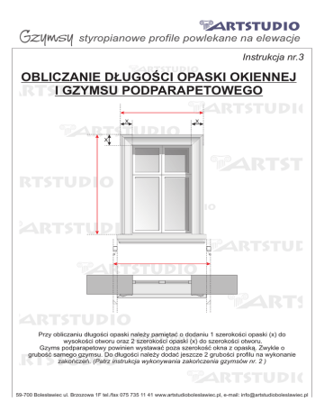 Instrukcja nr.3 OBLICZANIE DŁUGOŚCI OPASKI OKIENNEJ I GZYMSU PODPARAPETOWEGO Przy obliczaniu długości opaski należy pamiętać o dodaniu 1 szerokości opaski (x) do wysokości otworu oraz 2 szerokości opaski (x) do szerokości otworu. Gzyms podparapetowy powinien wystawać poza szerokość okna z opaską. Zwykle o grubość samego gzymsu. Do długości należy dodać jeszcze 2 grubości profilu na wykonanie zakończeń. (Patrz instrukcja wykonywania zakończenia gzymsów nr. 2 ) 59-700 Bolesławiec ul. Brzozowa 1F tel./fax 075 735 11 41 www.artstudioboleslawiec.pl, e-mail: [email protected]
