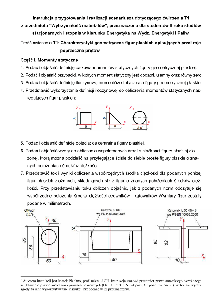 Instrukcja przygotowania i realizacji scenariusza dotyczącego ćwiczenia T1 z przedmiotu "Wytrzymałość materiałów", przeznaczona dla studentów II roku studiów stacjonarnych I stopnia w kierunku Energetyka na Wydz. Energetyki i Paliw* Treść ćwiczenia T1: Charakterystyki geometryczne figur płaskich opisujących przekroje poprzeczne prętów Część I. Momenty statyczne 1. Podać i objaśnić definicję całkową momentów statycznych figury geometrycznej płaskiej. 2. Podać i objaśnić przypadki, w których moment statyczny jest dodatni, ujemny oraz równy zero. 3. Podać i objaśnić definicję iloczynową momentów statycznych figury geometrycznej płaskiej. 4. Przedstawić wykorzystanie definicji iloczynowej do obliczenia momentów statycznych następujących figur płaskich: 5. Podać i objaśnić definicję pojęcia: oś centralna figury płaskiej. 6. Podać i objaśnić wzory do obliczania współrzędnych środka ciężkości figury płaskiej złożonej, którą można podzielić na przylegające ściśle do siebie proste figury płaskie o znanych położeniach środków ciężkości. 7. Przedstawić tok i wyniki obliczenia współrzędnych środka ciężkości dla podanych poniżej figur płaskich złożonych, składających się z figur o znanych położeniach środków ciężkości. Przy przedstawianiu toku obliczeń objaśnić, jak z podanych norm odczytuje się współrzędne położenia środka ciężkości ceowników i kątowników Wymiary figur zostały podane w milimetrach. * Autorem instrukcji jest Marek Płachno, prof. ndzw. AGH. Instrukcja stanowi przedmiot prawa autorskiego określonego w Ustawie o prawie autorskim i prawach pokrewnych (Dz. U. 1994 r. Nr 24 poz.83 z późn. zmianami). Autor nie wyraża zgody na inne wykorzystywanie instrukcji niż podane w jej przeznaczeniu. Część II. Momenty bezwładności 1. Podać i objaśnić definicję całkową osiowych momentów bezwładności figury geometrycznej płaskiej. 2. Podać i objaśnić definicję całkową biegunowego momentu bezwładności figury geometrycznej płaskiej. 3. Podać i objaśnić przypadek, w którym moment biegunowy jest równy sumie momentów osiowych. 4. Podać i objaśnić definicję całkową momentu dewiacji. 5. Podać i objaśnić warunek, jaki ma spełniać figura płaska, aby jej moment dewiacji był równy zero. 6. Podać i objaśnić definicje pojęć: • główne centralne osie figury płaskie płaskiej, • główne centralne momenty bezwładności figury płaskiej. 7. Podać i objaśnić wzory algebraiczne do obliczania głównych centralnych momentów osiowych bezwładności dla podanych niżej figur płaskich, a następnie przedstawić wartości tych momentów -0,5 odpowiadające następującym wymiarom figur: a = 10 cm, b = 4 cm, d =20·(π) cm. 8. Objaśnić, jak z podanych norm odczytuje się główne centralne momenty osiowe bezwładności dla ceowników i kątowników. 9. Objaśnić wykorzystanie twierdzenia Steinera do obliczania głównych centralnych momentów bezwładności figury płaskiej złożonej, składającej się z figur prostych o znanych wartościach głównych centralnych momentów osiowych bezwładności. 10. Przedstawić tok oraz wyniki obliczeń głównych centralnych momentów osiowych bezwładności dla figur, które podano w p.7. części I niniejszej instrukcji. Uwaga: Scenariusz należy tak opracować, aby czas jego realizacji podczas ćwiczenia nie przekroczył 50 minut Koniec instrukcji