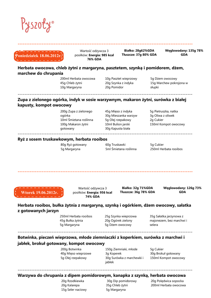 -----------------------------------------------------------------------------------------------------PO Białko: 28g62%GDA Węglowodany: 135g 78% Wartość odżywcza 3 Tłuszcze: 37g 80% GDA GDA posiłków: Energia: 985 kcal Poniedziałek 18.06.2012r.` 76% GDA Herbata owocowa, chleb żytni z margaryna, pasztetem, szynką i pomidorem, dżem, marchew do chrupania 200ml Herbata owocowa 45g Chleb żytni 10g Margaryna 10g Pasztet wieprzowy 20g Szynka z indyka 20g Pomidor 5g Dżem owocowy 15g Marchew pokrojona w słupki ------------------------------------------------------------------------------------------------------Zupa z zielonego ogórka, indyk w sosie warzywnym, makaron żytni, surówka z białej kapusty, kompot owocowy 200g Zupa z zielonego ogórka 10ml Śmietana roślinna 100g Makaron żytni gotowany 45g Mięso z indyka 30g Mieszanka warzyw 5g Olej rzepakowy 10ml Bulion jarski 30g Kapusta biała 5g Pietruszka, natka 3g Oliwa z oliwek 2g Cukier 150ml Kompot owocowy ------------------------------------------------------------------------------------------------------Ryż z sosem truskawkowym, herbata rooibos pola na miodem,bawarka 80g Ryż gotowany 5g Margaryna 60g Truskawki 5ml Śmietana roślinna 5g Cukier 250ml Herbata rooibos ------------------------------------------------------------------------------------------------------ Wtorek 19.06.2012r. Wartość odżywcza 3 posiłków: Energia: 956 kcal 74% GDA Białko: 32g 71%GDA Tłuszcze: 36g 78% GDA Węglowodany: 126g 73% GDA Herbata rooibos, bułka żytnia z margaryną, szynką i ogórkiem, dżem owocowy, sałatka z gotowanych jarzyn 250ml Herbata rooibos 45g Bułka żytnia 5g Margaryna 25g Szynka wieprzowa 20g Ogórek zielony 5g Dżem owocowy 35g Sałatka jarzynowa z majonezem, bez marchwi i selera ------------------------------------------------------------------------------------------------------Botwinka, pieczeń wieprzowa, młode ziemniaczki z koperkiem, surówka z marchwi i jabłek, brokuł gotowany, kompot owocowy 200g Botwinka 40g Mięso wieprzowe 5g Olej rzepakowy 150g Ziemniaki, młode 3g Koperek 30g Surówka z marchewki i jabłek 5g Cukier 30g Brokuł gotowany 150ml Kompot owocowy ------------------------------------------------------------------------------------------------------Warzywa do chrupania z dipem pomidorowym, kanapka z szynką, herbata owocowa 20g Rzodkiewka 20g Kalarepa 15g Seler naciowy 30g Dip pomidorowy 35g Chleb żytni 5g Margaryna 20g Polędwica sopocka 200ml Herbata owocowa --------------------------------------------------------------------------------------------------------------Wartość odżywcza 3 posiłków: Energia: 965 kcal 75% GDA Środa 20.06.2012r. Białko: 28g 62%GDA Tłuszcze: 37g 80% GDA Węglowodany: 130g 75% GDA Herbata owocowa, chleb żytni z margaryną, szynką i rzodkiewką 250ml Herbata owocowa 35g Chleb żytni 15g Margaryna 30g Szynka z indyka 10g Rzodkiewka ------------------------------------------------------------------------------------------------------Zupa z kalarepki, zraz wieprzowy, kasza jęczmienna, buraczki, kompot owocowy 200ml Zupa z kalarepki 55g Mięso wieprzowe 5g Olej rzepakowy 15ml Bulion jarski 80g Kasza jęczmienna 50g Buraki gotowane 150ml Kompot owocowy ------------------------------------------------------------------------------------------------------Sałatka owocowa z miodem, chrupki kukurydziane, herbata rooibos 80g Gruszka 60g Truskawki 40g Kiwi 10g Miód (podać osobno) 20g Chrupki kukurydziane 200ml Herbata rooibos ------------------------------------------------------------------------------------------------------ Czwartek 21.06.2012r. Wartość odżywcza 3 posiłków: Energia: 980 kcal 76% GDA Białko: 34g 75%GDA Tłuszcze: 36g 78% GDA Węglowodany: 130g 75% GDA Herbata rooibos, chleb żytni z margaryną, schabem pieczonym i ogórkiem zielonym 250ml Herbata rooibos 35g Chleb żytni 10g Margaryna 30g Schab pieczony 20g Ogórek zielony ------------------------------------------------------------------------------------------------------Krem warzywny z grzankami, spaghetti bolognese z makaronem, marchew z groszkiem gotowana, kalafior gotowany, woda mineralna 200g Krem warzywny 15g Chleb żytni, grzanki 40g Mięso z indyka 5g Olej rzepakowy 20g Pasta pomidorowa 15g Cebula 3g Mąki żytnia 100g Makaron żytni bezjajeczny gotowany 30g Kalafior gotowany 30g Marchew z groszkiem gotowana 2,5g Margaryna 200ml Woda mineralna ------------------------------------------------------------------------------------------------------Bułka z konfiturą, herbata ziołowa 50g Bułka żytnia 10g Margaryna 20g Konfitura 200ml Herbata ziołowa -----------------------------------------------------------------------------------------------------PO Białko: 30g 67%GDA Węglowodany: 125g 72% Wartość odżywcza 3 Piątek 22.06.2012r. Tłuszcze: 37g 80% GDA GDA posiłków: Energia: 953 kcal 74% GDA Herbata owocowa, bułka żytnia z margaryną, schab pieczony, parówka wieprzowa, pomidor 250ml Herbata owocowa 35g Bułka żytnia 5g Margaryna 20g Schab pieczony 20g Pomidor 30g Parówka wieprzowa ------------------------------------------------------------------------------------------------------Zupa jarzynowa, fileciki z indyka, ziemniaki, surówka z kiszonej kapusty, gotowane warzywa z masełkiem, woda mineralna 200g Zupa jarzynowa 40g Mięso z indyka 10g Bułka żytnia tarta 10g Olej rzepakowy 150g Ziemniaki 30g Surówka z kiszonej kapusty 30g Mieszanka gotowanych warzyw 5g Margaryna 200ml Woda mineralna ------------------------------------------------------------------------------------------------------Kisiel z owocami, chrupki kukurydziane, herbata rooibos 130g Kisiel z owocami 20g Chrupki kukurydziane 200ml Herbata rooibos
