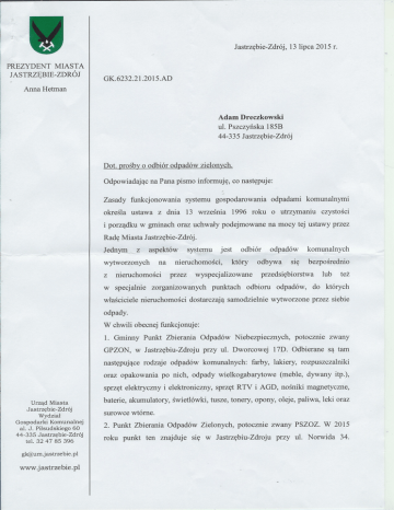 ;t Jastrzebie-Zdrój, PREZYDENT MIASTA JASTRZEBIE-ZDRÓJ 13 lipca 2015 r. GK.6232.21.20l5.AD Anna Hetman Adam Dreczkowski ul. Pszczynska l85B 44-335 Jastrzebie-Zdrój Dot. prosby o odbiór odpadów zielonych. Odpowiadajac na Pana pismo informuje, co nastepuje: ~ ~ Zasady funkcjonowania systemu gospodarowania odpadami komunalnymi okresla ustawa z dnia 13 wrzesnia 1996 roku o utrzymaniu czystosci i porzadku w gminach oraz uchwaly podejmowane na mocy tej ustawy przez Rade Miasta Jastrzebie-Zdrój. Je~nym ~ aspektó)Y ._systemu jest wytworzonych z na nieruchomosci nieruchomosci, przez odbiór który wyspecjalizowane odpadów odbywa sie komunalnych bezposrednio przedsiebiorstwa lub tez w specjalnie zorganizowanych punktach odbioru odpadów, do których wlasciciele nieruchomosci dostarczaja samodzielnie wytworzone przez siebie odpady. W chwili obecnej funkcjonuje: 1. Gminny Punkt Zbierania Odpadów Niebezpiecznych, potocznie zwany GPZON, w Jastrzebiu-Zdroju przy ul. Dworcowej l7D. Odbierane sa tam nastepujace rodzaje odpadów komunalnych: farby, lakiery, rozpuszczalniki oraz opakowania po nich, odpady wielkogabarytowe (meble, dywany itp.), sprzet elektryczny i elektroniczny, sprzet RTV i AGD, nosniki magnetyczne, Urzad Miasta J astrze bie- Zdrój Wydzial Gospodarki Komunalnej al. J. Pilsudskiego 60 44-335 Jastrzebie-Zdrój tel. 32 47 85 396 [email protected] www.jastrzebie.pl baterie, akumulatory, swietlówki, tusze, tonery, opony, oleje, paliwa, leki oraz surowce wtórne. 2. Punkt Zbierania Odpadów Zielonych, potocznie zwany PSZOZ. W 2015 roku punkt ten znajduje sie w Jastrzebiu-Zdroju przy ul. Norwida 34. ,~ ~ W punkcie odbierana jest skoszona trawa, drobne galezie oraz liscie. Zgodnie z Uchwala Rady Miasta Jastrzebie-Zdrój nr III.21.20l4 § 7 pkt 8 i 9 w sprawie ustalenia regulaminu utrzymania czystosci i porzadku na terenie miasta Jastrzebie-Zdrój, odpady zielone powstale w wyniku pielegnacji ogrodów i terenów zielonych, wlasciciele nieruchomosci samodzielnie dostarczaja do punktu selektywnego zbierania. Dodatkowo osoby fizyczne moga prowadzic kompostowanie odpadów zielonych, we wlasnym zakresie i na wlasne potrzeby. Wlasciciel nieruchomosci nie jest w ten sposób zwiazany terminami odbioru i posiada mozliwosc korzystania z punktu w dogodnym dla siebie terminie. Nadmieniam, iz w ramach prac nad zalozeniami do systemu gospodarowania odpadami komunalnymi na rok 2016 rozwazana jest mozliwosc ewentualnego wprowadzenia uslugi transportowej jako uslugi dodatkowej dla mieszkanców zainteresowanych dostarczeniem odpadów komunalnych do punktu. PREZYDENT ~~,- -- -' --c~ ~ MIASTA ~LAnna Hetman