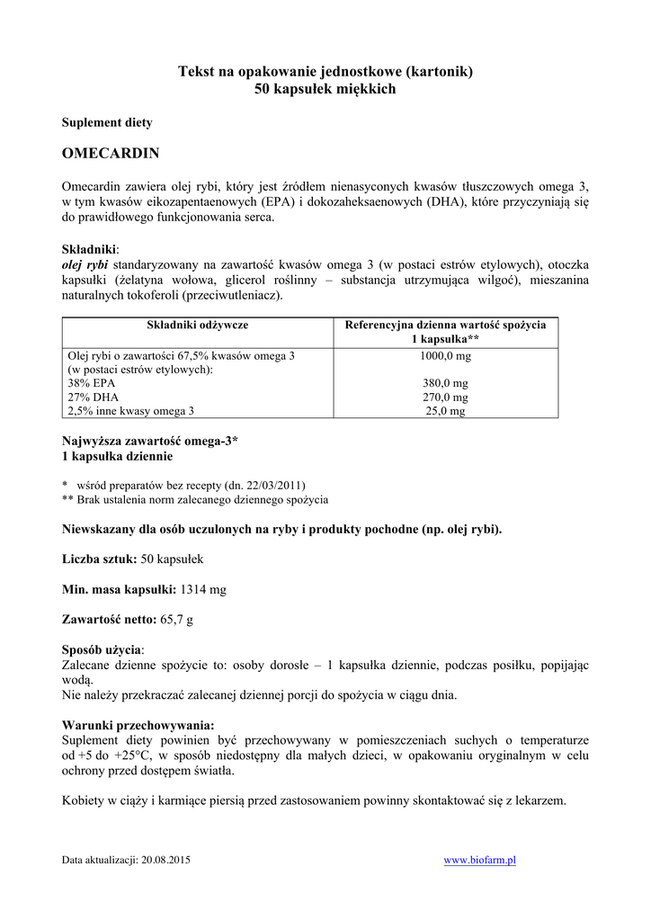 Tekst na opakowanie jednostkowe (kartonik) 50 kapsułek miękkich Suplement diety OMECARDIN Omecardin zawiera olej rybi, który jest źródłem nienasyconych kwasów tłuszczowych omega 3, w tym kwasów eikozapentaenowych (EPA) i dokozaheksaenowych (DHA), które przyczyniają się do prawidłowego funkcjonowania serca. Składniki: olej rybi standaryzowany na zawartość kwasów omega 3 (w postaci estrów etylowych), otoczka kapsułki (żelatyna wołowa, glicerol roślinny – substancja utrzymująca wilgoć), mieszanina naturalnych tokoferoli (przeciwutleniacz). Składniki odżywcze Olej rybi o zawartości 67,5% kwasów omega 3 (w postaci estrów etylowych): 38% EPA 27% DHA 2,5% inne kwasy omega 3 Referencyjna dzienna wartość spożycia 1 kapsułka** 1000,0 mg 380,0 mg 270,0 mg 25,0 mg Najwyższa zawartość omega-3* 1 kapsułka dziennie * wśród preparatów bez recepty (dn. 22/03/2011) ** Brak ustalenia norm zalecanego dziennego spożycia Niewskazany dla osób uczulonych na ryby i produkty pochodne (np. olej rybi). Liczba sztuk: 50 kapsułek Min. masa kapsułki: 1314 mg Zawartość netto: 65,7 g Sposób użycia: Zalecane dzienne spożycie to: osoby dorosłe – 1 kapsułka dziennie, podczas posiłku, popijając wodą. Nie należy przekraczać zalecanej dziennej porcji do spożycia w ciągu dnia. Warunki przechowywania: Suplement diety powinien być przechowywany w pomieszczeniach suchych o temperaturze od +5 do +25°C, w sposób niedostępny dla małych dzieci, w opakowaniu oryginalnym w celu ochrony przed dostępem światła. Kobiety w ciąży i karmiące piersią przed zastosowaniem powinny skontaktować się z lekarzem. Data aktualizacji: 20.08.2015 www.biofarm.pl Niezalecany dla dzieci i osób z zaburzeniami czynności wątroby. Niezalecany dla osób z nietolerancją na jakikolwiek ze składników. Suplement diety nie może być stosowany jako substytut (zamiennik) zróżnicowanej diety. Należy prowadzić zdrowy tryb życia i stosować zróżnicowaną dietę dostarczającą organizmowi wystarczającą ilość składników. Korzystne działanie suplementu diety występuje w przypadku spożycia 250 mg EPA i DHA dziennie. Producent: BIOFARM® Sp. z o.o., ul. Wałbrzyska 13, 60-198 Poznań, Polska Wykonano: CURTIS Health Caps Sp. z o.o., Wysogotowo, ul. Batorowska 52, 62-081 Przeźmierowo, Polska Data aktualizacji: 20.08.2015 www.biofarm.pl