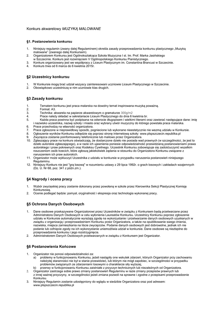 Konkurs akwarelowy MUZYKĄ MALOWANE §1. Postanowienia konkursu 1. 2. 3. 4. Niniejszy regulamin (zwany dalej Regulaminem) określa zasady przeprowadzenia konkursu plastycznego „Muzyką malowane” (zwanego dalej Konkursem). Organizatorem Konkursu jest Ogólnokształcąca Szkoła Muzyczna I st. Im. Prof. Marka Jasińskiego w Szczecinie. Konkurs jest rozwinięciem V Ogólnopolskiego Konkursu Pianistycznego. Konkurs organizowany jest we współpracy z Liceum Plastycznym im. Constantina Brancusi w Szczecinie. Konkurs trwa od 6 marca do 6 kwietnia 2015r. §2 Uczestnicy konkursu 1. 2. W Konkursie mogą brać udział wszyscy zainteresowani uczniowie Liceum Plastycznego w Szczecinie. Obowiązkowo uczestniczą w nim uczniowie klas drugich. §3 Zasady konkursu Tematem konkursu jest praca malarska na dowolny temat inspirowana muzyką poważną. Format: A3. Technika: akwarela na papierze akwarelowym o gramaturze 300g/m2 Prace należy składać w sekretariacie Liceum Plastycznego do dnia 6 kwietnia br. Każda praca powinna być podpisana na odwrocie długopisem i wielkimi literami oraz zawierać następujące dane: imię i nazwisko uczestnika, nazwę szkoły i miasto oraz wybrany utwór muzyczny do którego powstała praca malarska. 6. Prace przechodzą na własność organizatora. 7. Prace zgłoszone w nieprawidłowy sposób, pogniecione lub wykonane nieestetycznie nie wezmą udziału w Konkursie. 8. Ogłoszenie wyników Konkursu odbędzie się poprzez stronę internetową szkoły: www.plspszczecin.republika.pl 9. Zwycięzca zostanie poinformowany telefonicznie lub mailowo przez Organizatora. 10. Zgłaszający prace na konkurs oświadczają, że dostarczone dzieło nie posiada wad prawnych (w szczególności, że jest to dzieło autorskie zgłaszającego), a w razie ich ujawnienia poniesie odpowiedzialność przewidzianą postanowieniami prawa autorskiego i praw pokrewnych oraz Kodeksu Cywilnego. Uczestnik Konkursu zobowiązuje się zadośćuczynić wszelkim roszczeniom osób trzecich, które zgłoszą jakiekolwiek żądania w stosunku do Organizatora Konkursu związane z naruszeniem ich praw autorskich. 11. Organizator może wykluczyć Uczestnika z udziału w konkursie w przypadku naruszenia postanowień niniejszego Regulaminu. 12. Niniejszy Konkurs nie jest "grą losową" w rozumieniu ustawy z 29 lipca 1992r. o grach losowych i zakładach wzajemnych (Dz. U. Nr 68, poz. 341 z późn.zm.). 1. 2. 3. 4. 5. §4 Nagrody i ocena pracy 1. 2. Wybór zwycięskiej pracy zostanie dokonany przez powołaną w szkole przez Kierownika Sekcji Plastycznej Komisję Konkursową. Ocenie podlegać będzie: pomysł, oryginalność i ekspresja oraz technologia wykonanej pracy. §5 Ochrona Danych Osobowych 1. 2. Dane osobowe przekazywane Organizatorowi przez Uczestników w związku z Konkursem będą przetwarzane przez Administratora Danych Osobowych w celu wyłonienia Laureatów Konkursu. Uczestnicy Konkursu poprzez zgłoszenie udziału w Konkursie automatycznie wyrażają zgodę na wykorzystanie i przetwarzanie danych osobowych uzyskanych w związku z organizacją i przeprowadzeniem Konkursu przez Organizatora, a także na opublikowanie swego imienia, nazwiska, miejsca zamieszkania na liście zwycięzców. Podanie danych osobowych jest dobrowolne, jednak ich nie podanie lub cofnięcie zgody na ich wykorzystanie uniemożliwia udział w konkursie. Dane osobowe są niezbędne do przeprowadzenia konkursu i jego rozstrzygnięcia. Administratorem Danych Osobowych przetwarzanych w związku z Konkursem jest Organizator. §6 Postanowienia Końcowe 1. 2. 3. Organizator nie ponosi odpowiedzialności za: a) problemy w funkcjonowaniu Konkursu, jeżeli nastąpiły one wskutek zdarzeń, których Organizator przy zachowaniu należytej staranności nie był w stanie przewidzieć, lub którym nie mógł zapobiec, w szczególności w przypadku problemów związanych ze zdarzeniami losowymi o charakterze siły wyższej, b) przerwy w funkcjonowaniu Konkursu zaistniałe z przyczyn technicznych lub niezależnych od Organizatora. Organizator zastrzega sobie prawo zmiany postanowień Regulaminu w razie zmiany przepisów prawnych lub z innej ważnej przyczyny, w szczególności jeżeli zmiana pozwoli na sprawne i zgodne z przepisami przeprowadzenie Konkursu. Niniejszy Regulamin zostanie udostępniony do wglądu w siedzibie Organizatora oraz pod adresem: www.plspszczecin.republika.pl