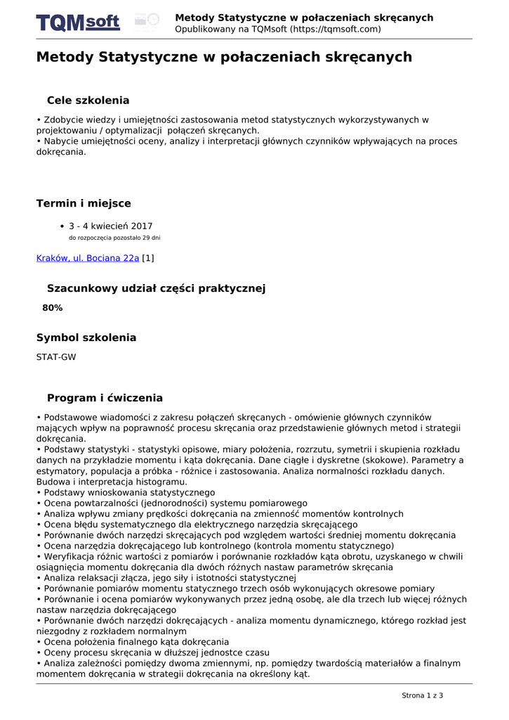 Metody Statystyczne w połaczeniach skręcanych Opublikowany na TQMsoft (https://tqmsoft.com) Metody Statystyczne w połaczeniach skręcanych Cele szkolenia • Zdobycie wiedzy i umiejętności zastosowania metod statystycznych wykorzystywanych w projektowaniu / optymalizacji połączeń skręcanych. • Nabycie umiejętności oceny, analizy i interpretacji głównych czynników wpływających na proces dokręcania. Termin i miejsce 3 - 4 kwiecień 2017 do rozpoczęcia pozostało 29 dni Kraków, ul. Bociana 22a [1] Szacunkowy udział części praktycznej 80% Symbol szkolenia STAT-GW Program i ćwiczenia • Podstawowe wiadomości z zakresu połączeń skręcanych - omówienie głównych czynników mających wpływ na poprawność procesu skręcania oraz przedstawienie głównych metod i strategii dokręcania. • Podstawy statystyki - statystyki opisowe, miary położenia, rozrzutu, symetrii i skupienia rozkładu danych na przykładzie momentu i kąta dokręcania. Dane ciągłe i dyskretne (skokowe). Parametry a estymatory, populacja a próbka - różnice i zastosowania. Analiza normalności rozkładu danych. Budowa i interpretacja histogramu. • Podstawy wnioskowania statystycznego • Ocena powtarzalności (jednorodności) systemu pomiarowego • Analiza wpływu zmiany prędkości dokręcania na zmienność momentów kontrolnych • Ocena błędu systematycznego dla elektrycznego narzędzia skręcającego • Porównanie dwóch narzędzi skręcających pod względem wartości średniej momentu dokręcania • Ocena narzędzia dokręcającego lub kontrolnego (kontrola momentu statycznego) • Weryfikacja różnic wartości z pomiarów i porównanie rozkładów kąta obrotu, uzyskanego w chwili osiągnięcia momentu dokręcania dla dwóch różnych nastaw parametrów skręcania • Analiza relaksacji złącza, jego siły i istotności statystycznej • Porównanie pomiarów momentu statycznego trzech osób wykonujących okresowe pomiary • Porównanie i ocena pomiarów wykonywanych przez jedną osobę, ale dla trzech lub więcej różnych nastaw narzędzia dokręcającego • Porównanie dwóch narzędzi dokręcających - analiza momentu dynamicznego, którego rozkład jest niezgodny z rozkładem normalnym • Ocena położenia finalnego kąta dokręcania • Oceny procesu skręcania w dłuższej jednostce czasu • Analiza zależności pomiędzy dwoma zmiennymi, np. pomiędzy twardością materiałów a finalnym momentem dokręcania w strategii dokręcania na określony kąt. Strona 1 z 3 Metody Statystyczne w połaczeniach skręcanych Opublikowany na TQMsoft (https://tqmsoft.com) Adresaci Branża : automotive, lotnicza, AGD, maszynowa Producenci samochodów i silników, przekładni, układy kierowniczych, wszystkich podzespołów, których konstrukcja opiera się na połączeniach skręcanych). Korzyści dla uczestnika Uczestnik po szkoleniu będzie: · Wykorzystywał wnioskowanie statystyczne w poprawie jakości procesu produkcyjnego. · Wykonywał i interpretował testy parametryczne i nieparametryczne na przykładzie połączeń skręcanych w Excelu i Minitabie. · Dysponował otrzymanymi narzędziami obliczeniowymi w postaci formularzy MS Excel. · Identyfikował i analizował zależności występujące w procesie połączeń gwintowych. Uczestnik dowie się: · Jak istotną kwestią jest statystyczne podejście do problemów związanych z procesem połączeń skręcanych. · Co to jest wnioskowanie statystyczne i związane z nim reguły postępowania. · Dlaczego wykorzystanie analizy statystycznej przynosi wymierne korzyści materialne. · Czym jest analiza statystyczna wykorzystywana w połączeniach skręcanych. Metodyka Wszystkie ćwiczenia wykonywane w Excelu i Minitabie, poprzedzone będą opisem sytuacji praktycznej, problemem występującym w procesie połączeń skręcanych lub pomiarem na rzeczywistym połączeniu. Po dogłębnym i dokładnym opisie problemu, nastąpi wykonanie analizy statystycznej a następnie zaproponowanie i wytłumaczenie metod korygujących. Zastosowanie Szkolenie skierowane do szerokiego rynku motoryzacyjnego (nie tylko samochody i silniki, ale też przekładnie, układy kierownicze, wszystkie podzespoły, których konstrukcja opiera się na połączeniach skręcanych). Również do innych rynków, których produkty opierają się na połączeniach skręcanych, np. AGD. lotnictwo, przemysł maszynowy. Informacje dodatkowe Cena szkolenia obejmuje: szkolenie, materiały, certyfikat uczestnictwa w szkoleniu, obiady, słodki poczęstunek, możliwość bezpłatnych, krótkich konsultacji do 3 miesięcy po szkoleniu, pomoc w rezerwacji hotelu oraz bezpłatny dostęp do elektronicznych materiałów szkoleniowych w systemie Biblioteka TQMsoft. Strona 2 z 3 Metody Statystyczne w połaczeniach skręcanych Opublikowany na TQMsoft (https://tqmsoft.com) Drukuj [2] Pdf [3] Wyślij e-mail [4] Share [5] Share [6] Tweet [7] Share [8] Źródłowy URL: https://tqmsoft.com/pl/szkolenia/metody-statystyczne-w-polaczeniach-skrecanych Odnośniki [1] https://www.google.pl/maps/search/Kraków, ul. Bociana 22a [2] https://tqmsoft.com/print/19100 [3] https://tqmsoft.com/printpdf/19100 [4] mailto:?body=https%3A%2F%2Ftqmsoft.com%2Fpl%2Fprintpdf%2F19100 [5] https://www.linkedin.com/shareArticle?mini=true&source=TQMsoft.com&url=https%3A%2F%2Ft qmsoft.com%2Fpl%2Fprintpdf%2F19100 [6] https://www.facebook.com/sharer/sharer.php?u=https%3A%2F%2Ftqmsoft.com%2Fpl%2Fprintpd f%2F19100 [7] https://twitter.com/home?status=https%3A%2F%2Ftqmsoft.com%2Fpl%2Fprintpdf%2F19100 [8] https://plus.google.com/share?url=https%3A%2F%2Ftqmsoft.com%2Fpl%2Fprintpdf%2F19100 Strona 3 z 3