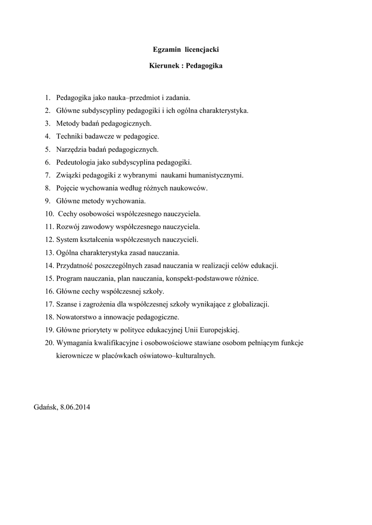 Egzamin licencjacki Kierunek : Pedagogika 1. Pedagogika jako nauka–przedmiot i zadania. 2. Główne subdyscypliny pedagogiki i ich ogólna charakterystyka. 3. Metody badań pedagogicznych. 4. Techniki badawcze w pedagogice. 5. Narzędzia badań pedagogicznych. 6. Pedeutologia jako subdyscyplina pedagogiki. 7. Związki pedagogiki z wybranymi naukami humanistycznymi. 8. Pojęcie wychowania według różnych naukowców. 9. Główne metody wychowania. 10. Cechy osobowości współczesnego nauczyciela. 11. Rozwój zawodowy współczesnego nauczyciela. 12. System kształcenia współczesnych nauczycieli. 13. Ogólna charakterystyka zasad nauczania. 14. Przydatność poszczególnych zasad nauczania w realizacji celów edukacji. 15. Program nauczania, plan nauczania, konspekt-podstawowe różnice. 16. Główne cechy współczesnej szkoły. 17. Szanse i zagrożenia dla współczesnej szkoły wynikające z globalizacji. 18. Nowatorstwo a innowacje pedagogiczne. 19. Główne priorytety w polityce edukacyjnej Unii Europejskiej. 20. Wymagania kwalifikacyjne i osobowościowe stawiane osobom pełniącym funkcje kierownicze w placówkach oświatowo–kulturalnych. Gdańsk, 8.06.2014 Egzamin licencjacki Kierunek : Pedagogika Specjalność : Pedagogika resocjalizacyjna z profilaktyką 1. Niedostosowanie społeczne–przyczyny i uwarunkowania. 2. Charakterystyka metod twórczej resocjalizacji. 3. Zasady wychowania resocjalizującego. 4. Prostytucja i sponsoring jako nowa forma prostytucji. 5. Dzieci ulicy. 6. Uzależnienie od Internetu jako nowe zagrożenie. 7. Profilaktyka przestępczości–charakterystyka. 8. Zachowania ryzykowne–ich istota i ważne czynniki chroniące. 9. Pomoc postpenitencjarna w świetle uregulowań prawnych. 10. Strategie działań readaptacyjnych w środowisku otwartym. 11. Proces resocjalizacji i readaptacji w okresie odbywania kary pozbawienia wolności. 12. Zjawisko podkultury więziennej - destruktywny wpływ ukrytego nurtu więziennego na proces resocjalizacji. 13. Młodzieżowy ośrodek wychowawczy, schronisko dla nieletnich, zakład poprawczy– odmienne modele pracy resocjalizacyjnej z nieletnimi. 14. Resocjalizacyjny aspekt kary. 15. Sekty–zagrożenie społeczne. Gdańsk, 8.06.2014 Egzamin licencjacki Kierunek : Pedagogika Specjalność : Edukacja wczesnoszkolna z wychowaniem przedszkolnym 1. Pedagogika wczesnoszkolna jako subdyscyplina naukowa. 2. Cele kształcenia w edukacji wczesnoszkolnej. 3. Teoria kształcenia wielostronnego. 4. Idea integracji w edukacji wczesnoszkolnej. 5. Różnica między kształceniem zintegrowanym, a nauczaniem początkowym. 6. Główne metody nauczania w pedagogice wczesnoszkolnej. 7. Czynniki determinujące osiągnięcia szkolne ucznia. Znaczenie motywacji. 8. Problematyka indywidualizacji kształcenia w edukacji wczesnoszkolnej. 9. Wybrane koncepcje edukacji alternatywnej (m.in.: M. Montessori, C. Freinet, R. Steiner – opisać jedną koncepcję). 10. Gotowość dziecka do nauki szkolnej–dojrzałość szkolna (wskaźniki i wyznaczniki dojrzałości szkolnej). 11. Współpraca z rodzicami–formy, zasady, pedagogizacja rodziców. 12. Formy organizacji pracy z dzieckiem w wieku przedszkolnym. 13. Organizacja środowiska przedszkolnego (przestrzeń, kompetencja przestrzenna, zabawka). 14. Sposoby przezwyciężania trudności dotyczących adaptacji dziecka do przedszkola. 15. Metody aktywizujące w pracy z dziećmi. Gdańsk, 8.06.2014