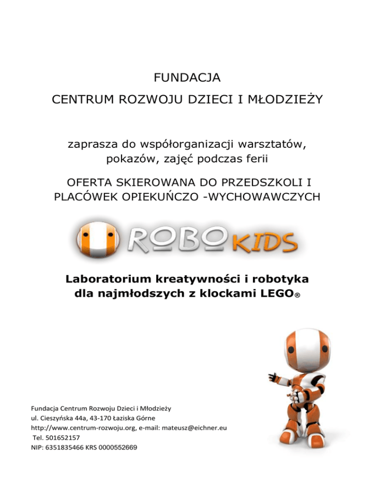 FUNDACJA CENTRUM ROZWOJU DZIECI I MŁODZIEŻY zaprasza do współorganizacji warsztatów, pokazów, zajęć podczas ferii OFERTA SKIEROWANA DO PRZEDSZKOLI I PLACÓWEK OPIEKUŃCZO -WYCHOWAWCZYCH Laboratorium kreatywności i robotyka dla najmłodszych z klockami LEGO® Fundacja Centrum Rozwoju Dzieci i Młodzieży ul. Cieszyńska 44a, 43-170 Łaziska Górne http://www.centrum-rozwoju.org, e-mail: [email protected] Tel. 501652157 NIP: 6351835466 KRS 0000552669 Szanowni Państwo, Fundacja Centrum Rozwoju Dzieci i Młodzieży serdecznie zaprasza do współpracy przy organizacji warsztatów, pokazów, zajęci podczas ferii RoboKids - laboratorium kreatywności i robotyka dla dzieci, realizowanych w ramach odpłatnej działalności statutowej Fundacji. Ofetra ta skierowana jest przede wszystkim do przedszkoli i placówek opiekuńczo –wychowawczych. Proponowany typ zajęć przeznaczony ze względu na narzędzie jakim są zestawy LEGO® WEDO 2.0 przeznaczone są dla najmłodszych dzieci. Preferowany wiek uczestników to 6-8 lat. RoboKids to przede wszystkim: świetna zabawa, edukacja dzieci w najlepszej formie, kształtowanie kompetencji i predyspozycji technicznych z pogranicza automatyki i informatyki, autorski program nauczania dostosowany dla dzieci w wybranych grupach wiekowych, nauka pracy w grupie i rozwój kreatywności, profesjonalny sprzęt -zestawy LEGO WeDo 2.0 ®, Certyfikowani trenerzy PozRobot Akademii LEGO Education®. Uczestnictwo w zajęciach RoboKids to rozwijająca zabawa dla dziecka, która może przerodzić się w fascynujące hobby, jak również doskonała inwestycja w przyszłość dzieci. Zajęcia realizowane są w oparciu o metodykę cyklu Kolba: najpierw doświadczenie -później teoria. Laboratorium kreatywności WeDo 2.0 dla dzieci w wieku 6-8 lat. obejmuje cykl od 4 do 12 warsztatów w odstępach tygodniowych, dwutygodniowych lub miesięcznych. Dzieci podczas kursu na wybranym poziomie pracują w dwuosobowych grupach pod nadzorem prowadzącego. W trakcie zajęć dzieci konstruują roboty oraz sterują nimi za pomocą tabletów, laptopów. Podczas zajęć wykorzystywany jest profesjonalny sprzęt komputerowy, materiały dydaktyczne oraz kompletne zestawy do budowy robotów LEGO® Mindstorms Wedo 2.0 dostosowanych do wieku dzieci wyposażone w sterownik, silnik, czujniki ruchu, koloru, żyroskop. Dzieci podczas zajęć zapoznają się także z takimi pojęciami jak praca zespołowa, komunikacja z innymi uczestnikami czy prezentacja swojej pracy. Zajęcia są bardzo atrakcyjne dla dzieci i cieszą się dużym powodzeniem wśród chłopców i dziewczynek. Na naszym wyposażeniu znajduje się 10 robotów WEDO 2.0, oraz 5 tabletów, 5 laptopów. Posiadamy www.robokids.pl www.centrum-rozwoju.org też 3 przygotowanych do pracy z dziećmi instruktorów certyfikowanych przez Lego Education®. Jest możliwość zorganizowania zajęć do południa lub popołudniami (między 10:00 a 20:00), w weekendy lub ferie (do południa). Jest też możliwość zorganizowania zajęć dla 5 latków z rodzicem (bez dodatkowych opłat dla rodzica) Przy jednorazowym zamówieniu większej ilości (min 4) zajęć –bonus 10% Przy zamówieniu dwóch grup pod rząd –bonus 10% Bonusy sumują się tak więc zamawiając np. 4 dni zajęć dla 2 grup jedna po drugiej uzyskuje się 20% zniżki. Poziom Cykl Laboratorium WEDO 2.0 Pokaz z zabawą Pokaz plenerowy z namiotem Czas trwania (liczba godzin lekcyjnych) 4x1,5h =6h 1,5h 2h Cena za całość (brutto) 800 zł 250 zł 300 zł Maksymalna liczba uczestników 10 20 Bez limitu Wiek dzieci 6-8 lat Warunkowo 5 lat ale z rodzicem 5-8 www.robokids.pl www.centrum-rozwoju.org Bez limitu Bonusy Zamówienie 2 grup pod rząd 10% Zamówienie cyklu min 4 zajęć -10% Zaangażowanie drugiego instruktora +120zł Zaangażowanie drugiego instruktora +160zł Przykładowe konstrukcje budowane przez dzieci z zestawu Lego Wedo 2.0 ® Na zakończenie każdego cyklu uczestnik otrzymuje certyfikat udziału w zajęciach. Jest też możliwość wypożyczania zestawów do domu na atrakcyjnych warunkach. Szczegółowe informacje o zajęciach RoboKids dostępne są na www.robokids.pl oraz na stronie organizatora www.centrum-rozwoju.org. stronie Rozwijaj wyobraźnię za pomocą klocków, www.robokids.pl www.centrum-rozwoju.org