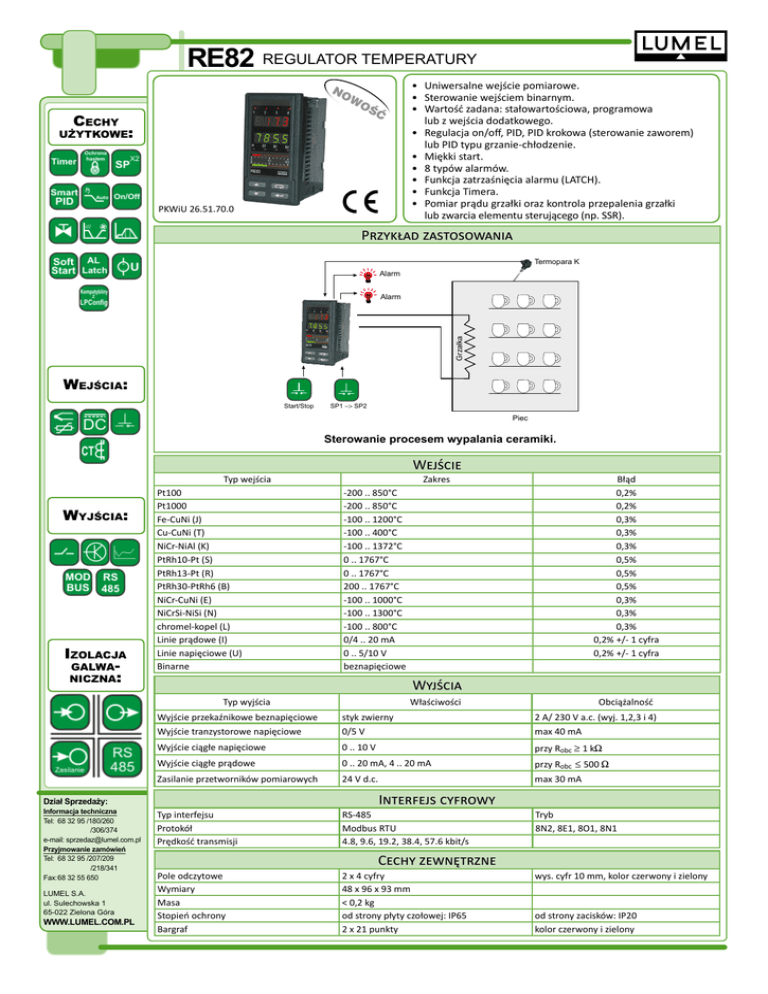 RE82 REGULATOR TEMPERATURY NO WO ŒÆ Cechy użytkowe: PKWiU 26.51.70.0 • • • • • • • • • Uniwersalne wejście pomiarowe. Sterowanie wejściem binarnym. Wartość zadana: stałowartościowa, programowa lub z wejścia dodatkowego. Regulacja on/off, PID, PID krokowa (sterowanie zaworem) lub PID typu grzanie-chłodzenie. Miękki start. 8 typów alarmów. Funkcja zatrzaśnięcia alarmu (LATCH). Funkcja Timera. Pomiar prądu grzałki oraz kontrola przepalenia grzałki lub zwarcia elementu sterującego (np. SSR). Przykład zastosowania Termopara K Alarm Grzałka Alarm Wejścia: Start/Stop SP1 SP2 Piec Sterowanie procesem wypalania ceramiki. Wejście Typ wejścia Wyjścia: Izolacja galwaniczna: Pt100 Pt1000 Fe-CuNi (J) Cu-CuNi (T) NiCr-NiAl (K) PtRh10-Pt (S) PtRh13-Pt (R) PtRh30-PtRh6 (B) NiCr-CuNi (E) NiCrSi-NiSi (N) chromel-kopel (L) Linie prądowe (I) Linie napięciowe (U) Binarne Zakres Wyjścia Typ wyjścia LUMEL S.A. ul. Sulechowska 1 65-022 Zielona Góra WWW.LUMEL.COM.PL Właściwości Obciążalność Wyjście przekaźnikowe beznapięciowe styk zwierny 2 A/ 230 V a.c. (wyj. 1,2,3 i 4) Wyjście tranzystorowe napięciowe 0/5 V max 40 mA Wyjście ciągłe napięciowe 0 .. 10 V przy Robc 1 kW Wyjście ciągłe prądowe 0 .. 20 mA, 4 .. 20 mA przy Robc 500 W Zasilanie przetworników pomiarowych 24 V d.c. max 30 mA Typ interfejsu Protokół Prędkość transmisji RS-485 Modbus RTU 4.8, 9.6, 19.2, 38.4, 57.6 kbit/s Pole odczytowe Wymiary Masa Stopień ochrony Bargraf 2 x 4 cyfry 48 x 96 x 93 mm < 0,2 kg od strony płyty czołowej: IP65 2 x 21 punkty Interfejs cyfrowy Dział Sprzedaży: Informacja techniczna Tel: 68 32 95 /180/260 /306/374 e-mail: [email protected] Przyjmowanie zamówień Tel: 68 32 95 /207/209 /218/341 Fax:68 32 55 650 Błąd 0,2% 0,2% 0,3% 0,3% 0,3% 0,5% 0,5% 0,5% 0,3% 0,3% 0,3% 0,2% +/- 1 cyfra 0,2% +/- 1 cyfra -200 .. 850°C -200 .. 850°C -100 .. 1200°C -100 .. 400°C -100 .. 1372°C 0 .. 1767°C 0 .. 1767°C 200 .. 1767°C -100 .. 1000°C -100 .. 1300°C -100 .. 800°C 0/4 .. 20 mA 0 .. 5/10 V beznapięciowe Tryb 8N2, 8E1, 8O1, 8N1 Cechy zewnętrzne wys. cyfr 10 mm, kolor czerwony i zielony od strony zacisków: IP20 kolor czerwony i zielony RE82 REGULATOR TEMPERATURY Znamionowe warunki użytkowania Napięcie zasilania Temperatura Wilgotność Pozycja pracy 85 .. 253 V a.c./ d.c. pracy: 0...23...50˚C < 85% dowolna 20 .. 40 V a.c./d.c. przechowywania: -20...70˚C (bez kondensacji pary wodnej) Zobacz także: Wymagania bezpieczeństwa i kompatybilności odporność na zakłócenia emisja zakłóceń Stopień zanieczyszczenia Kategoria instalacji Maksymalne napięcie pracy wzglęzasilanie, wyjścia: 300 V dem ziemi Wysokość npm wg PN-EN 61000-6-2 wg PN-EN 61000-6-4 2 III obwody wejściowe: 50 V 2000 m Schematy połączeń 16 15 14 13 12 11 10 9 8 7 6 5 4 3 2 1 interfejs RS-485 wejście binarne 2 wejście binarne 1 wejście przekładnika wejście dodatkowe wejście 17 18 19 20 21 22 23 24 25 26 27 28 29 30 31 32 Zamawianie zasilanie wyjście 4 wyjście 3 zasilanie przetworników wyjście 2 wyjście 1 Rys.1. Widok listew podłączeniowych regulatora. Pt100 3 2 1 Pt100 zwora zwora zwora + - termoelement 4 3 2 0...5/10 V + + Pt1000 - 0/4...20 mA 3 2 1 Pt1000 Pt100 w układzie 2- i 3-przewodowym 3 2 wejście prądowe 0/4..20 mA 3 2 1 wejście napięciowe 0..5/10 V odbiornik zasilanie Rys.2. Sygnały wejściowe. 21 23 29 31 22 24 30 32 wyjście 1, 2, 3, 4 - przekaźnik + odbiornik - 29 31 + 30 32 - zasilanie WY4 WY3 WY2 WY1 SSR wyjście 1, 2 napięciowe 0/5 V 29 31 + 30 32 - WY2 WY1 0...10 V odbiornik max. 500 WY2 WY1 wyjście 1, 2 ciągłe prądowe 0/4 .. 20 mA odbiornik min.1k WY2 WY1 + 29 31 0/4...20mA 30 32 - Czujniki temperatury. wyjście 1, 2 ciągłe napięciowe 0..10 V RE82 Wyjście 1: przekaźnikowe napięciowe 0/5 V ciągłe prądowe 0/4 .. 20 mA ciągłe napięciowe 0 .. 10 V Wyjście 2: przekaźnikowe1) napięciowe 0/5 V ciągłe prądowe 0/4 .. 20 mA ciągłe napięciowe 0 .. 10 V Zasilanie przetworników: brak zasilanie przetworników 24 V d.c. 1 W Zasilanie: 85 .. 253 V a.c./ d.c. 20 .. 40 V a.c./ d.c. Wykonanie: standardowe specjalne2) Wersja językowa: polska angielska inna2) Próby odbiorcze: bez dodatkowych wymagań z dodatkowym atestem Kontroli Jakości wg uzgodnień z odbiorcą2) X X X X X 1 2 3 4 1 2 3 4 Przekaźniki półprzewodnikowe SSR serii LU. 0 1 1 2 00 XX P E X 0 1 X Bezpłatny program LPConfig do programowania wyrobów LUMELu. Dostępny na naszej stronie internetowej. 1) tylko, gdy na wyjściu 1 też jest wybrany przekaźnik lub napięciowe 0/5 V 2) tylko po uzgodnieniu z producentem NASZA OFERTA Przykład zamówienia: Kod RE82 - 1 2 0 1 00 P 0 oznacza: RE82 - regulator temperatury typu RE82 1 - wyjście 1: przekaźnikowe 2 - wyjście 2: napięciowe 0/5 V 0 - brak zasilania przetworników 1 - zasilanie: 85 .. 253 V a.c./ d.c. 00 - wykonanie standardowe P - wersja językowa polska 0 - bez dodatkowych wymagań. 17 18 www.lumel.com.pl - zasilanie Rys.4. Zasilanie. 13 11 12 10 WE2 WE1 Rys.6. Wejście binarne 1 i 2. Rys.3. Wyjścia sterujące/alarmowe. X X B (-) RS-485 A (+) 16 15 Rys.9. Interfejs RS-485 6 5 0/4...20 mA + Rys.5. Sygnał wejścia dodatkowego. przekładnik prądowy + 8 7 Rys. 8. Wejście przekładnika prądowego. 26 27 - + Kompatybilność elektromagnetyczna Rys.10. Zasilanie przetworników 24 V. Więcej informacji o naszych wyrobach można znaleźć na naszej stronie internetowej: www.lumel.com.pl Dział Sprzedaży: Informacja techniczna Tel: 68 32 95 /180/260 /306/374 e-mail: [email protected] Przyjmowanie zamówień Tel: 68 32 95 /207/209 /218/341 Fax:68 32 55 650 LUMEL S.A. ul. Sulechowska 1 65-022 Zielona Góra WWW.LUMEL.COM.PL RE82-19/1