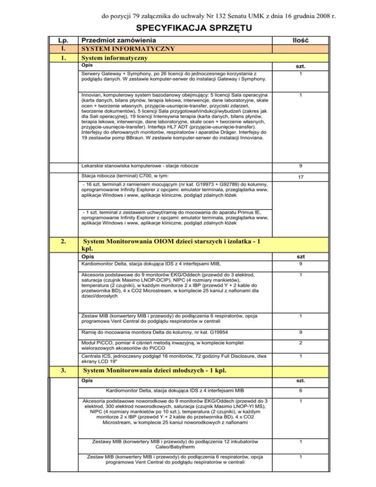 do pozycji 79 załącznika do uchwały Nr 132 Senatu UMK z dnia 16 grudnia 2008 r. SPECYFIKACJA SPRZĘTU Lp. I. 1. Przedmiot zamówienia SYSTEM INFORMATYCZNY System informatyczny Opis Ilość szt. Serwery Gateway + Symphony, po 26 licencji do jednoczesnego korzystania z podglądu danych. W zestawie komputer-serwer do instalacji Gateway i Symphony. 1 Innovian, komputerowy system bazodanowy obejmujący: 5 licencji Sala operacyjna (karta danych, bilans płynów, terapia lekowa, interwencje, dane laboratoryjne, skale ocen + tworzenie własnych, przyjęcie-usunięcie-transfer, przyciski zdarzeń, tworzenie dokumentów), 5 licencji Sala przygotowań/indukcji/wybudzeń (zakres jak dla Sali operacyjnej), 19 licencji Intensywna terapia (karta danych, bilans płynów, terapia lekowa, interwencje, dane laboratoryjne, skale ocen + tworzenie własnych, przyjęcie-usunięcie-transfer). Interfejs HL7 ADT (przyjęcie-usunięcie-transfer). Interfejsy do oferowanych monitorów, respiratorów i aparatów Dräger. Interfejsy do 19 zestawów pomp BBraun. W zestawie komputer-serwer do instalacji Innoviana. 1 Lekarskie stanowiska komputerowe - stacje robocze 9 Stacja robocza (terminal) C700, w tym: 17 - 16 szt. terminali z ramieniem mocującym (nr kat. G19973 + G92789) do kolumny, oprogramowanie Infinity Explorer z opcjami: emulator terminala, przeglądarka www, aplikacje Windows i www, aplikacje kliniczne, podgląd zdalnych łóŜek - 1 szt. terminal z zestawem uchwyt/ramię do mocowania do aparatu Primus IE, oprogramowanie Infinity Explorer z opcjami: emulator terminala, przeglądarka www, aplikacje Windows i www, aplikacje kliniczne, podgląd zdalnych łóŜek 2. System Monitorowania OIOM dzieci starszych i izolatka - 1 kpl. Opis 3. szt Kardiomonitor Delta, stacja dokująca IDS z 4 interfejsami MIB, 9 Akcesoria podstawowe do 9 monitorów EKG/Oddech (przewód do 3 elektrod, saturacja (czujnik Masimo LNOP-DCIP), NIPC (4 rozmiary mankietów), temperatura (2 czujniki), w kaŜdym monitorze 2 x IBP (przewód Y + 2 kable do przetwornika BD), 4 x CO2 Microstream, w komplecie 25 kaniul z nafionami dla dzieci/dorosłych 1 Zestaw MIB (konwertery MIB i przewody) do podłączenia 6 respiratorów, opcja programowa Vent Central do podglądu respiratorów w centrali 1 Ramię do mocowania monitora Delta do kolumny, nr kat. G19954 9 Moduł PiCCO, pomiar 4 ciśnień metodą inwazyjną, w komplecie komplet wielorazowych akcesoriów do PiCCO 2 Centrala ICS, jednoczesny podgląd 16 monitorów, 72 godziny Full Disclosure, dwa ekrany LCD 19" 1 System Monitorowania dzieci młodszych - 1 kpl. Opis szt. Kardiomonitor Delta, stacja dokująca IDS z 4 interfejsami MIB 6 Akcesoria podstawowe noworodkowe do 9 monitorów EKG/Oddech (przewód do 3 elektrod, 300 elektrod noworodkowych, saturacja (czujnik Masimo LNOP-YI MS), NIPC (4 rozmiary mankietów po 10 szt.), temperatura (2 czujniki), w kaŜdym monitorze 2 x IBP (przewód Y + 2 kable do przetwornika BD), 4 x CO2 Microstream, w komplecie 25 kaniul noworodkowych z nafionami 1 Zestawy MIB (konwertery MIB i przewody) do podłączenia 12 inkubatorów Caleo/Babytherm 1 Zestaw MIB (konwertery MIB i przewody) do podłączenia 6 respiratorów, opcja programowa Vent Central do podglądu respiratorów w centrali 1 Lp. 4. Przedmiot zamówienia 6 Centrala ICS, jednoczesny podgląd 8 monitorów, 72 godziny Full Disclosure, jeden ekran LCD 19" 1 System monitorowania - sala wybudzeń i sala operacyjna Opis II. 1. 2. 3. Ilość Ramię do mocowania monitora Delta do kolumny, nr kat. G19954 szt Kardiomonitor Delta, stacja dokująca IDS z 4 interfejsami MIB, zestaw uchwyt/ramię do mocowania do aparatu Primus IE 1 Kardiomonitor Delta, stacja dokująca IDS z 4 interfejsami MIB, z zasilaczem 4 Akcesoria podstawowe do 5 monitorów EKG/Oddech (przewód do 3 elektrod, saturacja (czujnik Masimo LNOP-DCIP), NIPC (4 rozmiary mankietów), temperatura (2 czujniki), w kaŜdym monitorze 2 x IBP (przewód Y + 2 kable do przetwornika BD) 1 Zestawy MIB (konwertery MIB i przewody) do połączenia Primus IE - Delta 1 Zestaw MIB (konwertery MIB i przewody) do podłączenia 4 respiratorów, opcja programowa Vent Central do podglądu respiratorów w centrali 1 Ramię do mocowania monitora Delta do kolumny Ponta, nr kat. G19954 3 Ramię do mocowania monitora Delta do kolumny Gemina, nr kat. G19975 1 Centrala ICS, jednoczesny podgląd 8 monitorów, 72 godziny Full Disclosure, jeden ekran LCD 19" 1 Sprzęt medyczny współpracujący z wyŜej wymienionym systemem Kardiomonitor zapasowy DELTA POMPY Pompa infuzyna objętościowa INFUSOMAT SPACE z czujnikiem kropli 1 Pompa infuzyna strzykawkowa PERFUZOR SPACE 25 240 Stacja dokująca B.BRAUN 60 Interfejs do komunikacji z komputerem za pomocą Ethernetu lub innej sieci SPACECOM z oprzyrządowaniem APARAT DO ZNIECZULANIA PRIMUS 19 3 w tym: Stanowisko do znieczulania PRIMUS - 1 szt. do montaŜu na kolumnie zawierajace: TRYBY WENTYLACJI: VCV, PCV, SIMV, PS, AUTO FLOW, wspomaganie oddechów spontanicznych w trybach wentylacji objetościowej i ciśnieniowej REGULACJE: Regulacje wszystkich parametrów wentylacji w tym objętość oddechowa TV od 5 ml, Częstość oddechów 100 odd/min PREZENTACJA: parametry wentylacji ustawiane i parametry mierzone krzywe: objętość, przepływ i ciśnienie w funkcji czasu pętle oddechowe: ciśnienie/objetość, objetość/przepływ Monitorowanie: parametry wentylacji (objętość oddechowa, objetość minutowa, częstośćoddechowa, ciśnienie w układzie oddechowym), stęŜenie O2 (czujnik paramagnetyczny), Anestetyki wziewne pomiar i prezentacja stęŜenia wdechowego i wydechowego anestetyków wziewnych, MAC Respirator anestetyczny napedzany elektrycznie Mozliwość podłaczenia układów półotwartych typu Kuhn Ssak inŜektorowy zasilany powietrzem z wyposaŜeniem Układ pacjenta dla dorosłych i noworodków PAROWNIK Vapor 2000 do sevofluranu NawilŜacz F&P MR 850 z kompletem akcesoriów Stanowisko do znieczulania PRIMUS IE- 2 szt. aparat na podstawi