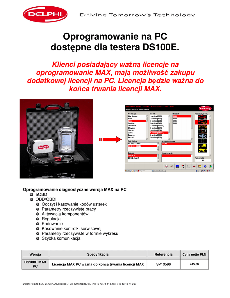Oprogramowanie na PC dostępne dla testera DS100E. Klienci posiadający ważną licencje na oprogramowanie MAX, mają możliwość zakupu dodatkowej licencji na PC. Licencja będzie ważna do końca trwania licencji MAX. Oprogramowanie diagnostyczne wersja MAX na PC eOBD OBD/OBDII Odczyt i kasowanie kodów usterek Parametry rzeczywiste pracy Aktywacja komponentów Regulacja Kodowanie Kasowanie kontrolki serwisowej Parametry rzeczywiste w formie wykresu Szybka komunikacja Wersja Specyfikacja Referencja Cena netto PLN DS100E MAX PC Licencja MAX PC ważna do końca trwania licencji MAX SV10596 415,00 Delphi Poland S.A., ul. Gen.Okulickiego 7, 38-400 Krosno, tel. +48 13 43 71 143, fax. +48 13 43 71 367